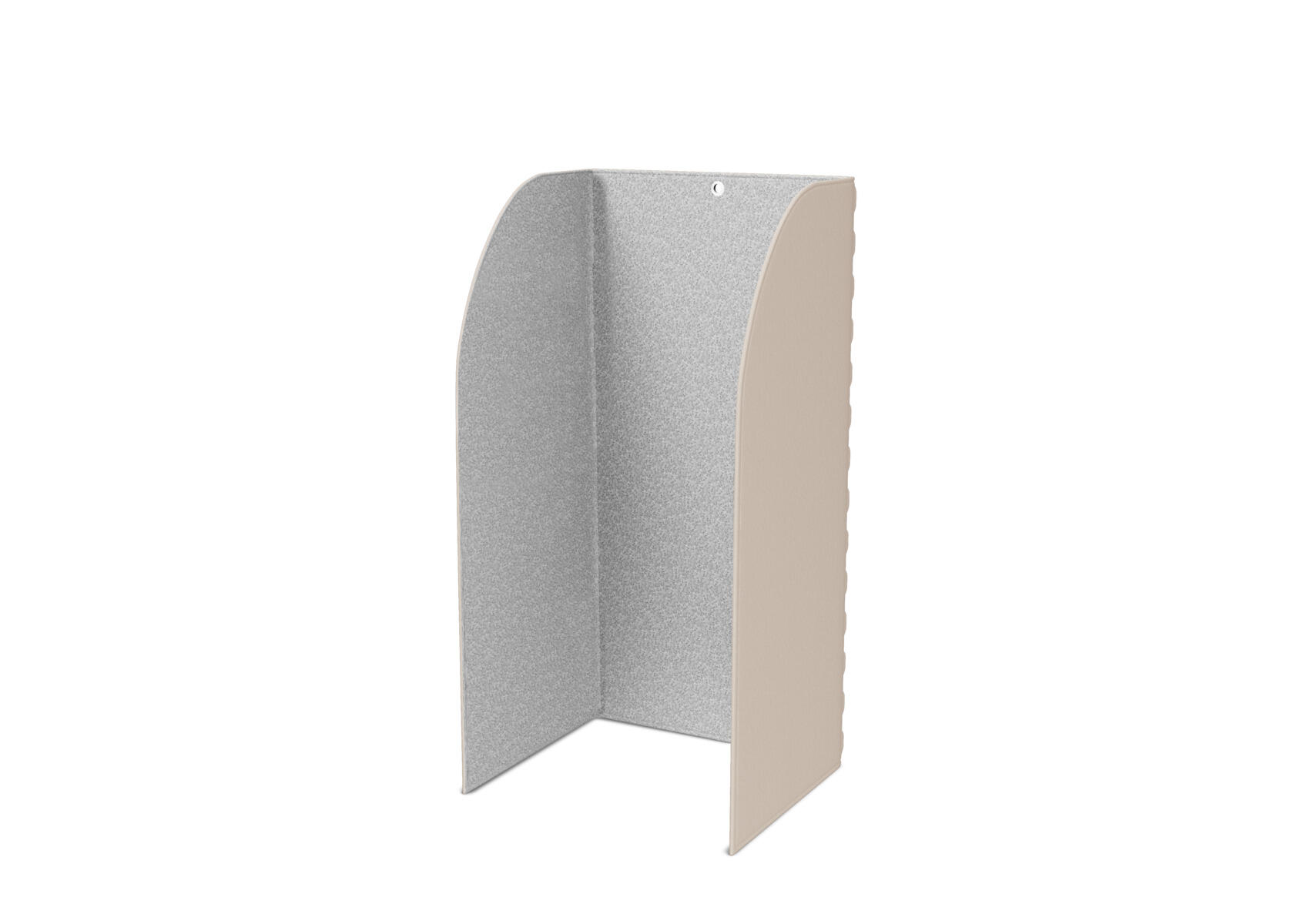 Ääntä vaimentava lattiasermi, joka eristää ja auttaa keskittymään. Se koostuu kolmesta osasta, jotka voidaan taitella tarpeen mukaan. Käytön jälkeen sermi voidaan ripustaa seinälle ja toimii silloin akustoivana elementtinä. Sermin sisäpuolelle mahtuu 70x60 cm pöytä. Vähintään 50 % kierrätettyä materiaalia sisältävä synteettinen huopa. 100 % kierrätettävä. Vaaleanharmaa sisäpuoli, valitse seinän ulkopuolen väri.
