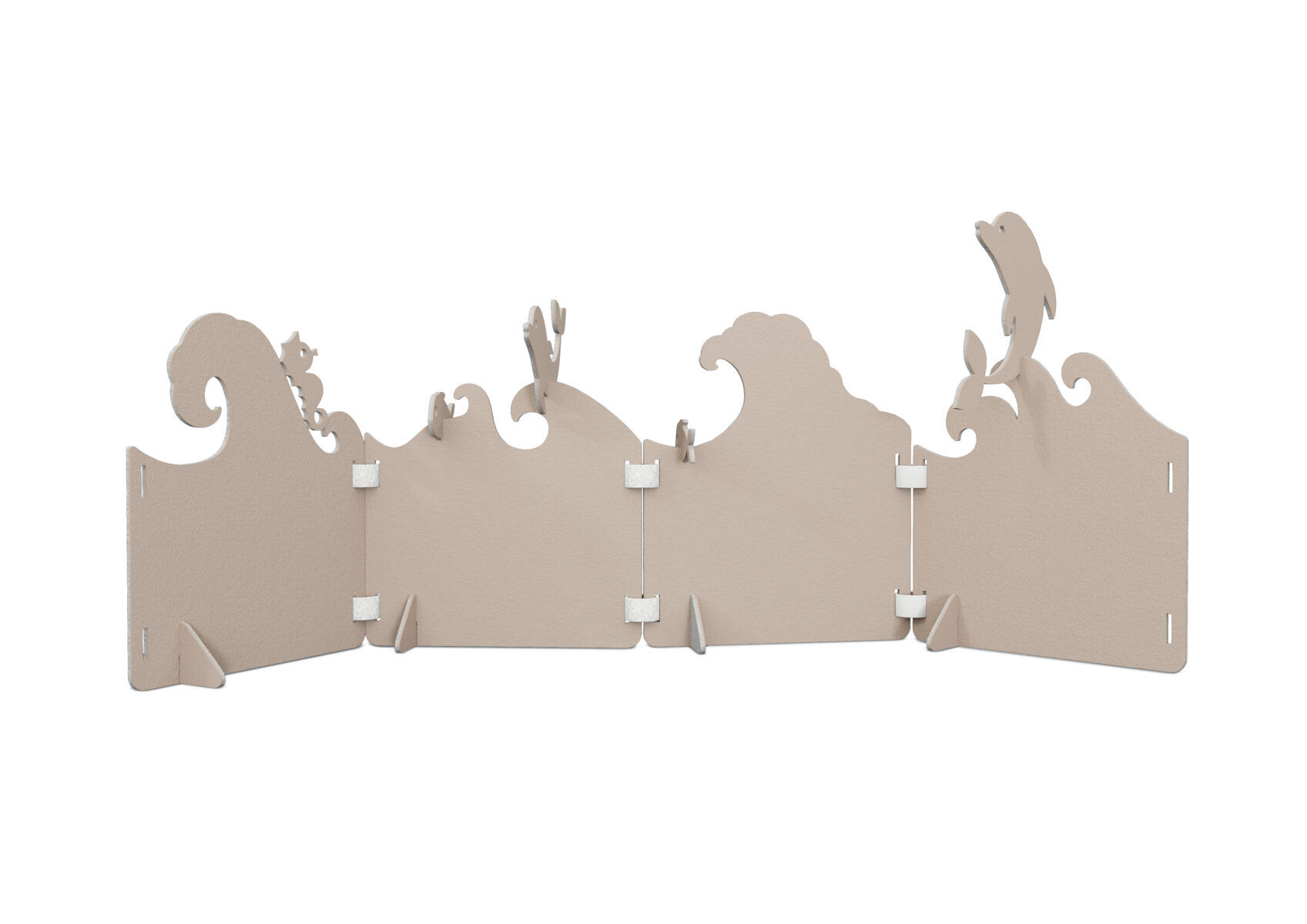 Leikkisermit, ääntä vaimentavaa polyesterihuopaa. Voidaan käyttää tilanjakajana tai kulissina leikissä. Saga-sarjan kaikkia osia voi yhdistää toisiinsa. Pelkistetty muotoilu käynnistää lasten mielikuvituksen. Saatavana 4 eri väriä, toinen puoli on aina vaaleanharmaa. Sisältää 4 sermiä meriteemalla sekä 4 jalkaa ja 6 saranaa /pak. Jalat ja saranat on samanväriset kuin sermi. Sisältää myös sermien päälle asennettavan merihevosen, 2 kalaa ja 2 delfiiniä. Sermien mitat: L58 x K70 cm. Materiaalista vähintään 50 % kierrätettyä, 100 % kierrätettävää.
