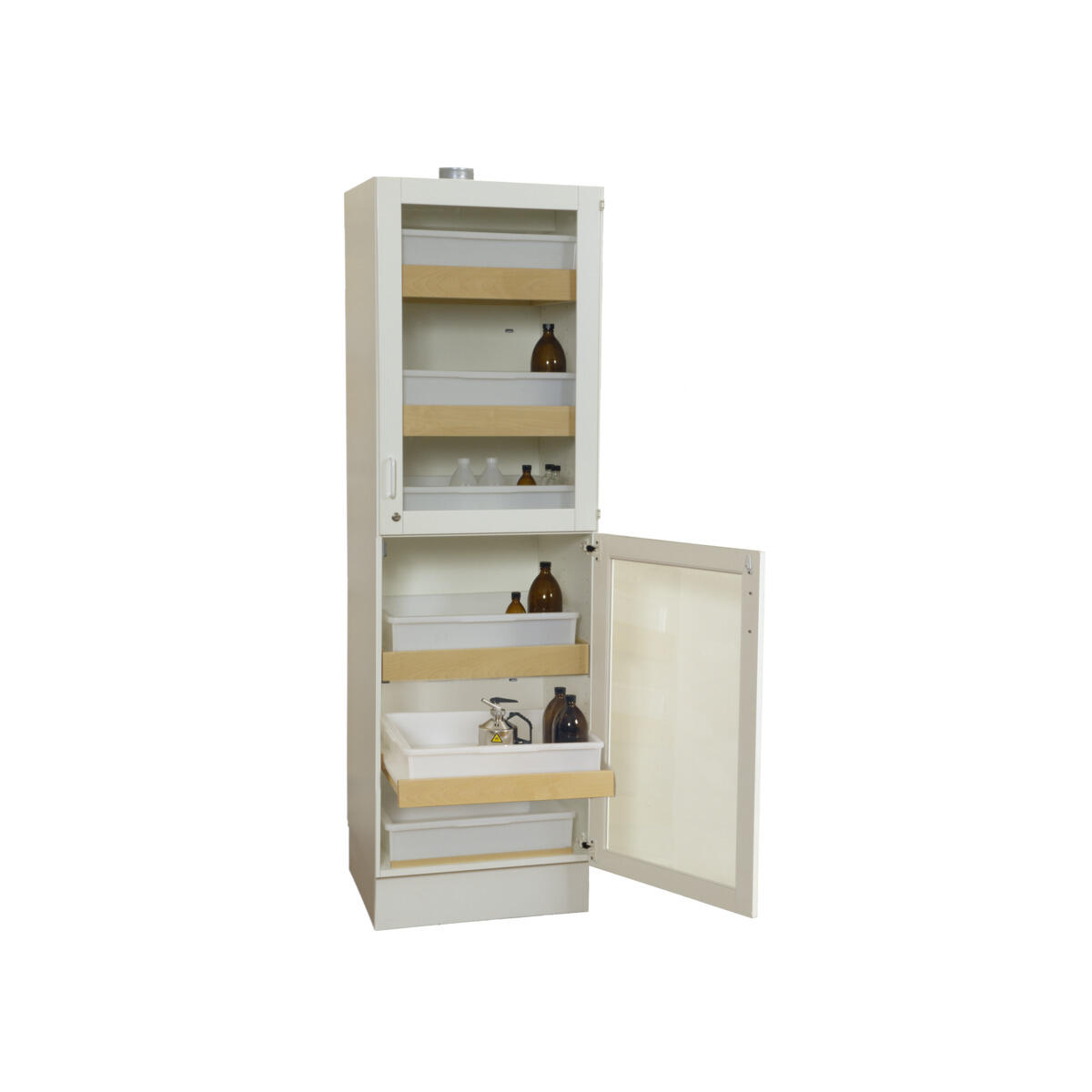 Ilmastoitu happo-emäskaappi on jaettu kahteen erilliseen osioon, jotta hapot ja emäkset säilyvät turvallisesti erillään. Valmistettu kestävästä korkeapainelaminaatista. Tukeva jauhemaalattu metallijalusta (korkeus 15 cm). Kaapissa on kuusi siirrettävää hyllytasoa, joista 4 on ulosvedettäviä sekä kuusi irrotettavaa 18 l laatikkoa (polypropyleenia). Hyllyjen kantavuus on 50 kg tasaisesti kuormitettuna. Poistoilmaliitäntä sijaitsee kaapin katossa (Ø100 mm). Kaappi toimitetaan valmiiksi asennetulla ASSA‑sylinterilukolla ja kahdella avaimella. Kaappi on testattu standardin EN 16121:2013 mukaisesti. Huomio: syövyttävät aineet tulee säilyttää silmien korkeuden alapuolella.