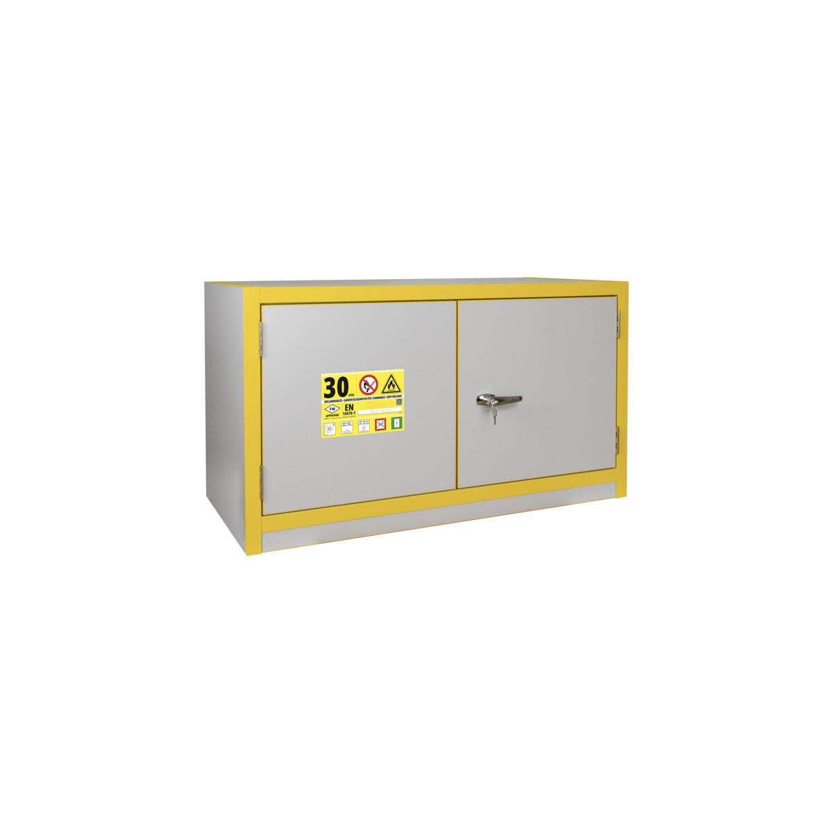 F30 paloluokiteltu kemikaalikaappi helposti syttyvien ja myrkyllisten kemikaalien säilytykseen. Kaappi toimitetaan valmiiksi asennetulla kahvalukolla ja kahdella avaimella. Pohjassa valuma-allas, jossa on rei’itetty pohjalevy. Valuma-altaan tilavuus 41 l. Hyllyn kantavuus 50 kg tasaisesti kuormitettuna. Kaapissa on katossa ilmanvaihtoliitäntä (Ø100 mm) tuloilmaa ja poistoilmaan liittämistä varten. Sisämitat: L 101,1 x S 49,1 x K 36,6 cm. Itsesulkeutuva ovi on normaalisti pidettävissä auki, mutta sulkeutuu automaattisesti, jos huonelämpötila nousee yli 50 °C. Kaappi on tarkoitettu suurempien määrien palavien nesteiden (leimahduspiste 30 °C tai alle) säilytykseen palo-osastossa tai herkissä tiloissa. Testattu standardien EN 16121:2013 ja EN 14470-1 mukaisesti.