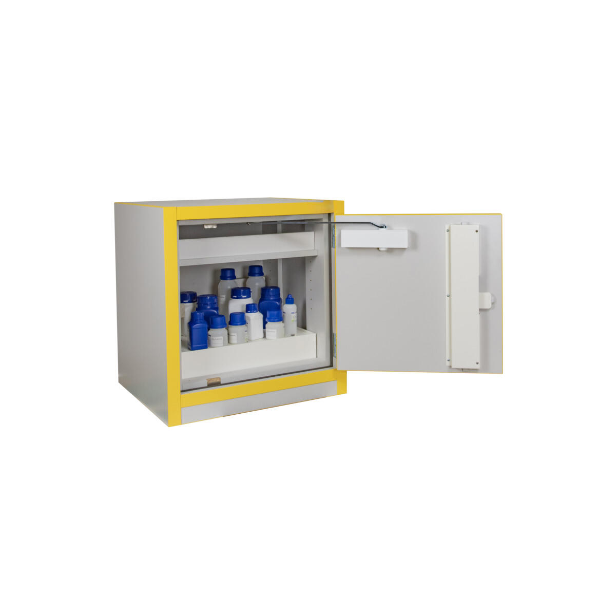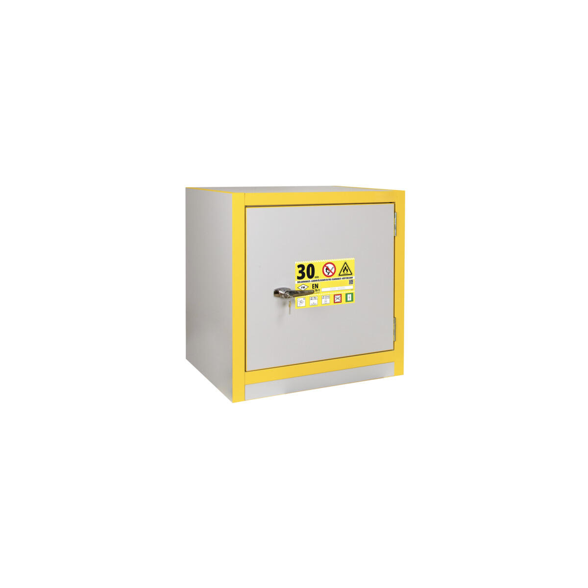 F30 paloluokiteltu kemikaalikaappi helposti syttyvien ja myrkyllisten kemikaalien säilytykseen. Kaappi toimitetaan valmiiksi asennetulla kahvalukolla ja kahdella avaimella. Pohjassa valuma-allas, jossa on rei’itetty pohjalevy. Valuma-altaan tilavuus 20 l. Hyllyn kantavuus 50 kg tasaisesti kuormitettuna. Kaapissa on katossa ilmanvaihtoliitäntä (Ø100 mm) tuloilmaa ja poistoilmaan liittämistä varten. Sisämitat: L 49,1 x S 49,1 x K 36,6 cm. Itsesulkeutuva ovi on normaalisti pidettävissä auki, mutta sulkeutuu automaattisesti, jos huonelämpötila nousee yli 50 °C. Kaappi on tarkoitettu suurempien määrien palavien nesteiden (leimahduspiste 30 °C tai alle) säilytykseen palo-osastossa tai herkissä tiloissa. Testattu standardien EN 16121:2013 ja EN 14470-1 mukaisesti.