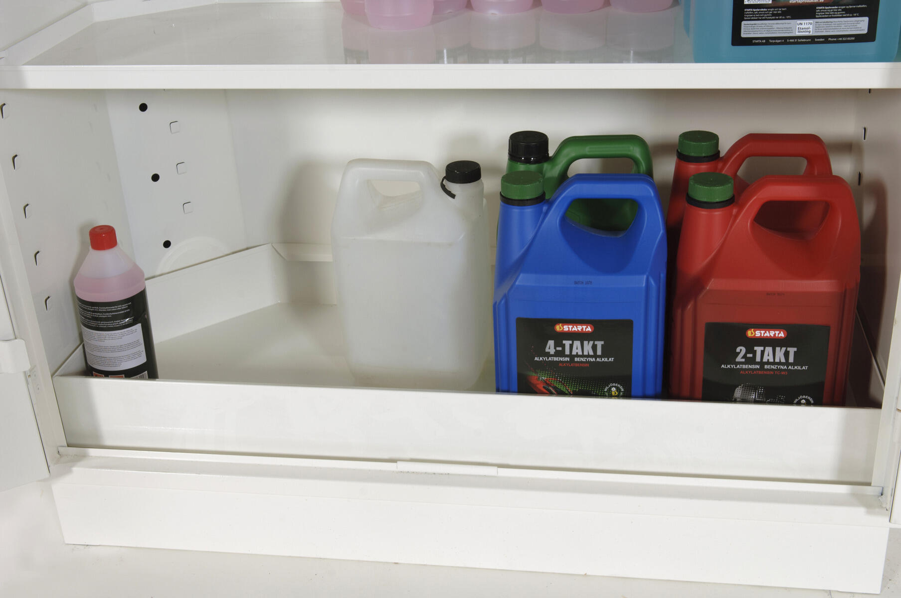 Paloeristetty kemikaalikaappi on tarkoitettu helposti syttyvien ja myrkyllisten kemikaalien turvalliseen säilytykseen. Kaappi on valmistettu tukevasta teräsrakenteesta, ja ovet, sivut, katto ja pohja ovat monikerrosrakenteisia paloeristeellä (Euroclass A1). Upotetut ovet on vahvistettu profiililla, ja kahvassa on murtokohta, joka lisää turvallisuutta. Saranapuolella oleva hitsattu lukitusrakenne estää avaamisen, vaikka saranat irrotettaisiin. Kaappi toimitetaan tukevalla espanjolettilukituksella sekä ASSA‑sylinterilukolla ja kahdella avaimella (lukko ei ole valmiiksi asennettu). Kaapissa on kolme siirrettävää hyllytasoa, jossa on ylösnostetut reunat ja suljetut kulmat mahdollisten roiskeiden hallitsemiseksi. Hyllyn kantavuus on 75 kg tasaisesti kuormitettuna. Ilmastoitu rakenne varmistaa, että kaikkien hyllytasojen välinen tila tuulettuu. Poistoilmaliitäntä on kaapin katossa (Ø 100 mm). Sisämitat: L 92,5 x S 41 x K113 cm. Kaappi soveltuu pienempien määrien palavien nesteiden (leimahduspiste ≤ 30 °C) säilytykseen palotilassa. Suuremmille määrille suositellaan F30‑sarjan paloluokiteltuja kemikaalikaappeja. Kaappi on testattu standardien EN 16121:2013, EN 14073‑2, EN 14074:2004 ja ISO 7170:2005 mukaisesti. Lisävarusteena saatavana valuma-allas (tilattava erikseen).