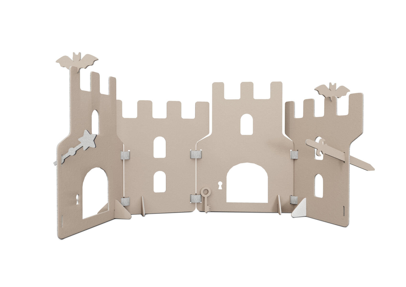 Leikkisermit, ääntä vaimentavaa polyesterihuopaa. Voidaan käyttää tilanjakajana tai kulissina leikissä. Saga-sarjan kaikkia osia voi yhdistää toisiinsa. Pelkistetty muotoilu käynnistää lasten mielikuvituksen. Saatavana 4 eri väriä, toinen puoli on aina vaaleanharmaa. Sisältää 4 sermiä linnoitusteemalla sekä 4 jalkaa ja 6 saranaa /pak. Jalat ja saranat on samanväriset kuin sermi. Sisältää myös sermien päälle asennettavat 2 lepakkoa, miekan, taikasauvan ja avaimen. Sermien mitat: L58 x K70 cm. Materiaalista vähintään 50 % kierrätettyä, 100 % kierrätettävää.