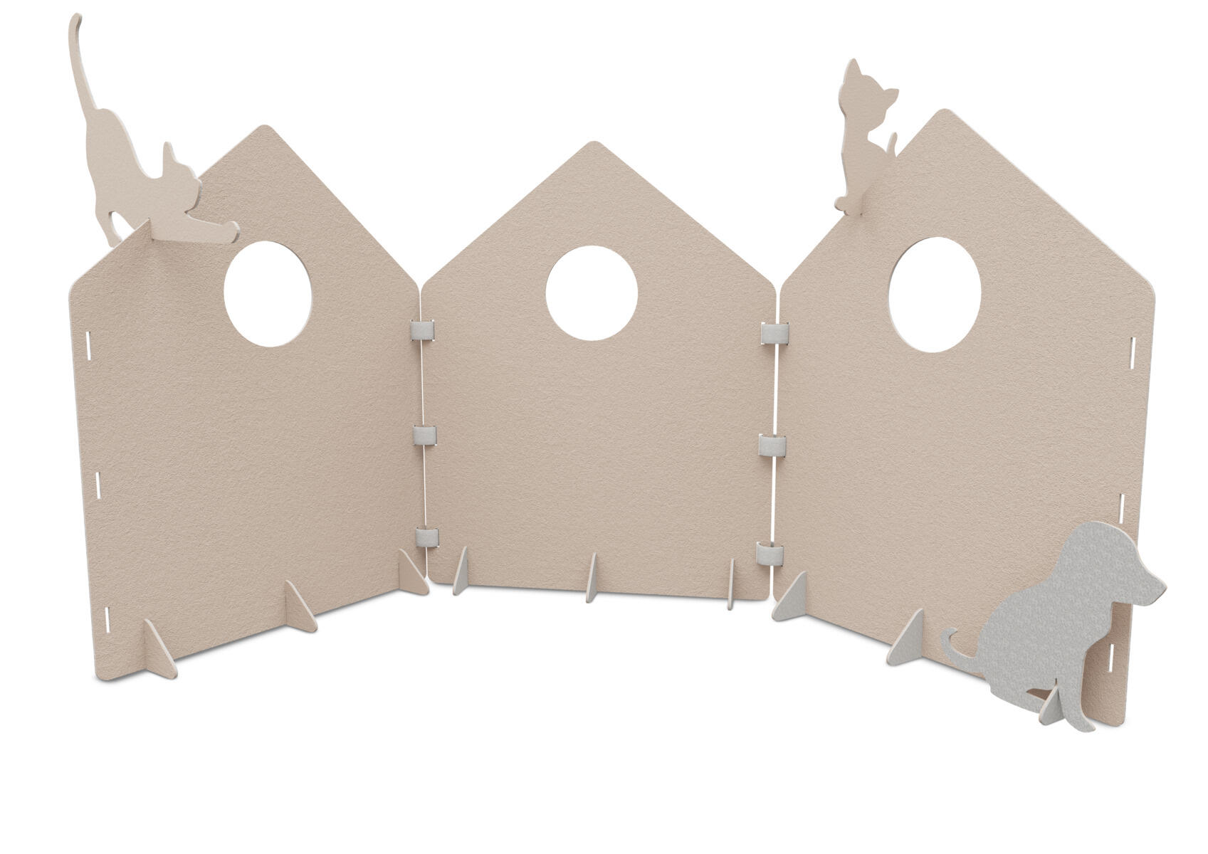 Leikkisermit, ääntä vaimentavaa polyesterihuopaa. Voidaan käyttää tilanjakajana tai kulissina leikissä. Saga-sarjan kaikkia osia voi yhdistää toisiinsa. Pelkistetty muotoilu käynnistää lasten mielikuvituksen. Saatavana 4 eri väriä, toinen puoli on aina vaaleanharmaa. Sisältää 3 sermiä kotiteemalla sekä 9 jalkaa ja 6 saranaa /pak. Jalat ja saranat on samanväriset kuin sermi. Sisältää myös sermien päälle asennettavan koiran ja 2 kissaa. Sermien mitat: L89 x K112,5 cm. Materiaalista vähintään 50 % kierrätettyä, 100 % kierrätettävää.