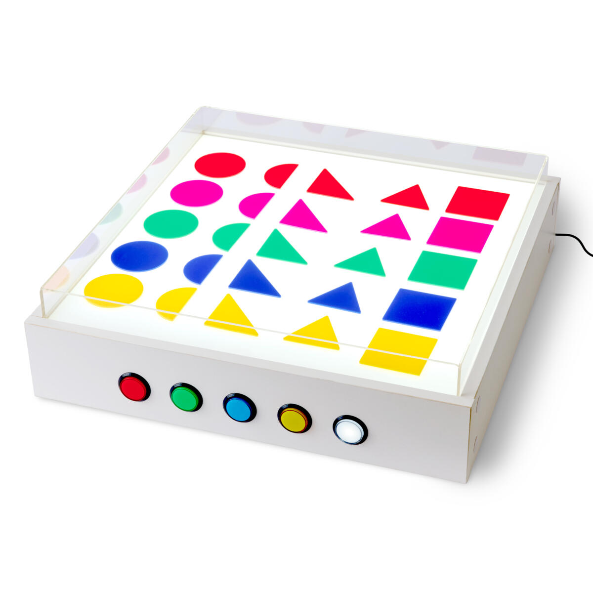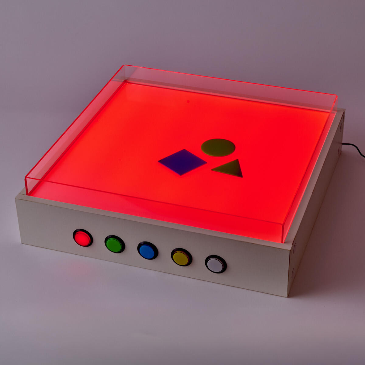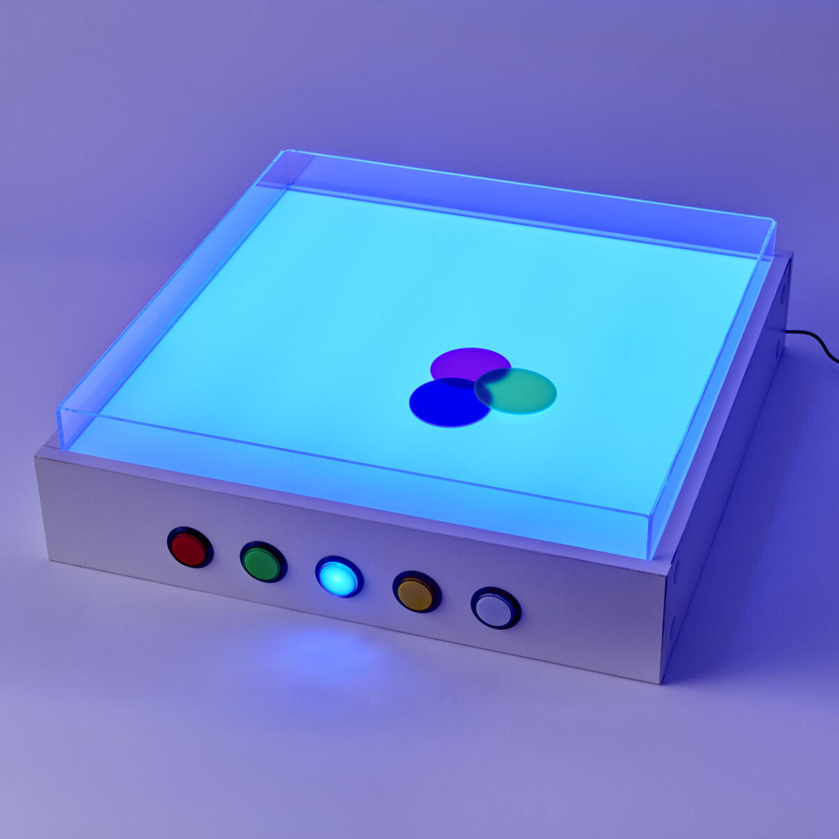 Valopöydän päällä on kirkas, reunallinen muoviallas. Altaaseen voi kaataa hiekkaa, väriä, muovailumassaa tai muuta mielenkiintoista. Valopöydän väriä voi vaihtaa nappia painamalla. Näin yhdistetään materiaali ja valo ja saadaan uusia taktiilisia ja sensorisia kokemuksia. Valopöytä voi olla pöydällä tai lattialla. Mitat: 60 x 60 x 12 cm (LxSxK). Paino 10,2 kg.