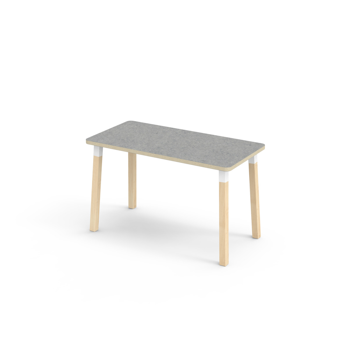Pöydän kannessa on ääntä vaimentava rakenne ja kestävä korkeapainelaminaattipinta. Pöydän kannen kulmissa on 40 mm pyöristys, jonka ansiosta pöytä saa modernin ja tyylikkään ilmeen. Jalat on valmistettu kirkaslakatusta massiivikoivusta ja kiinnitetty tukevalla metalliholkilla. Jalan kulma on ulkoneva; rakenne takaa sekä vakauden että kestävyyden.
