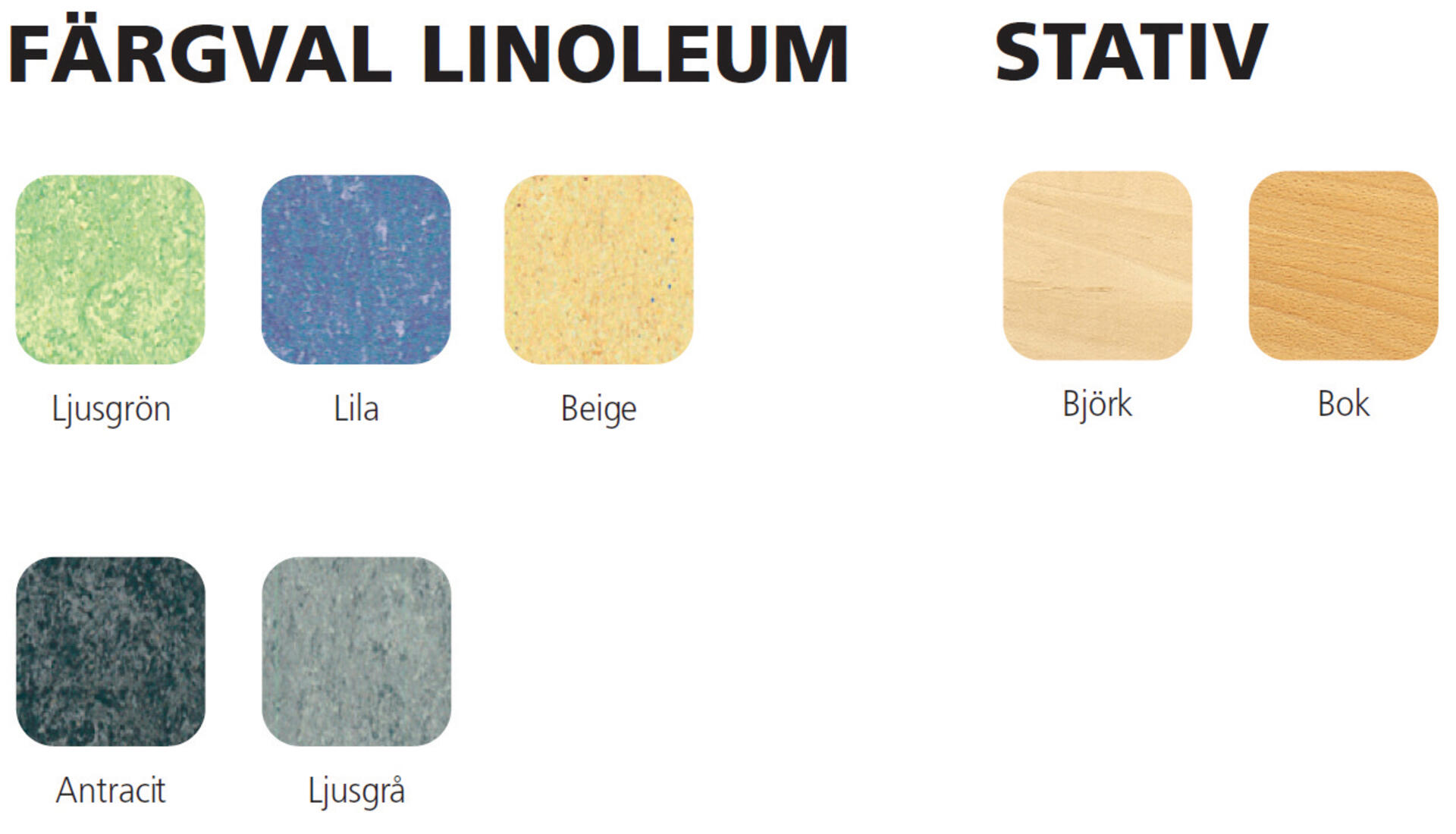 Pöydän runko on massiivikoivua. Kannen rakenne on tehokkaasti ääntä vaimentava. Pinnassa linoleumia, joka on Joutsenmerkitty luonnonmateriaali, eikä sisällä PVC:tä tai ftalaatteja.