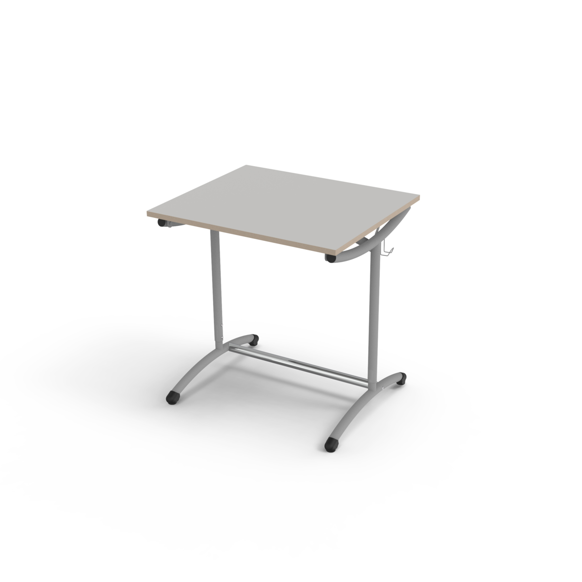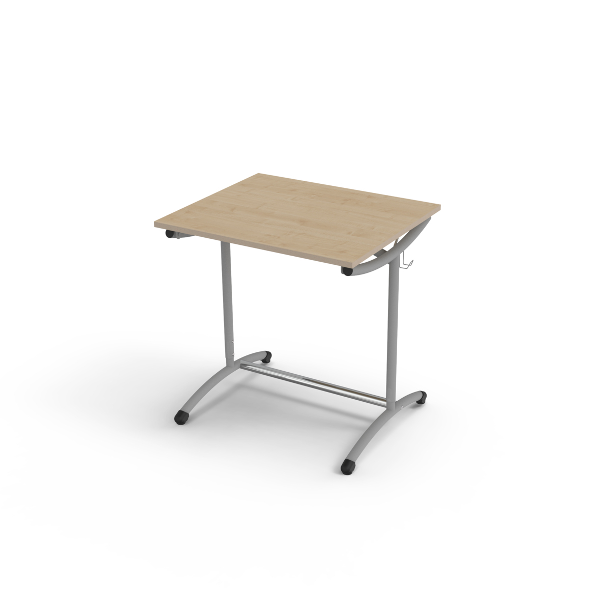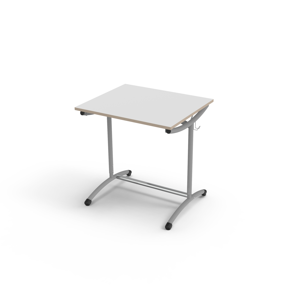 Pöydän kansi laminaattipinnalla, mitat L 70 cm, S 60 cm. Säädettävä korkeus 70-100 cm. Kansi on kallistettavissa 8°, 12° tai 16°. Etujaloissa säätötassut. Kaksi laukkukoukkua. Jalusta hopea RAL 9006
