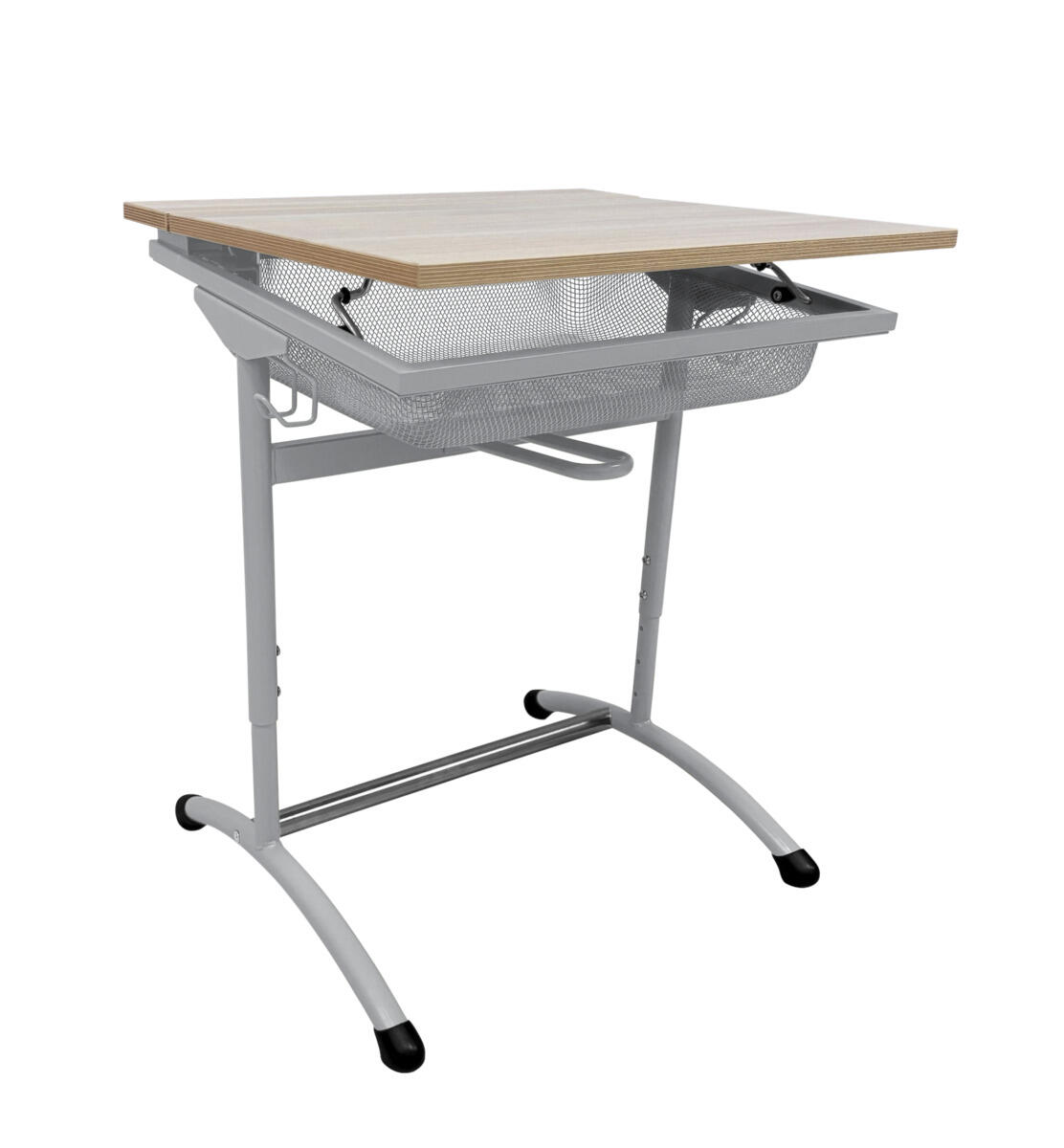 Verkkolaatikolla varustettu pulpetti kestävällä korkeapainelaminaattipintaisella kannella. Kansi on kallistettavissa ergonomisen kirjoitus- ja piirtoasennon saavuttamiseksi. Pulverimaalattu runko hopea RAL 9006. Laukkukoukut molemmin puolin. Säädettävissä korkeuksiin 64, 69, 74, 79, 84, 89 ja 94 cm. Rungon poikkituki lisää vakautta. Jaloissa muovitassut, joista kaksi säädettävää. Testattu ja hyväksytty standardin EN 1729-2:2023 mukaisesti.