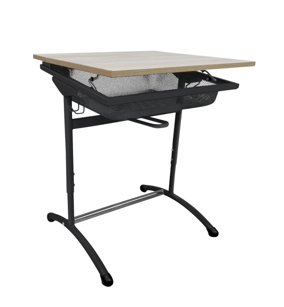 Verkkolaatikolla varustettu pulpetti kestävällä korkeapainelaminaattipintaisella kannella. Kansi on kallistettavissa ergonomisen kirjoitus- ja piirtoasennon saavuttamiseksi. Pulverimaalattu runko musta RAL 9005. Laukkukoukut molemmin puolin. Säädettävissä korkeuksiin 64, 69, 74, 79, 84, 89 ja 94 cm. Rungon poikkituki lisää vakautta. Jaloissa muovitassut, joista kaksi säädettävää. Testattu ja hyväksytty standardin EN 1729-2:2023 mukaisesti.