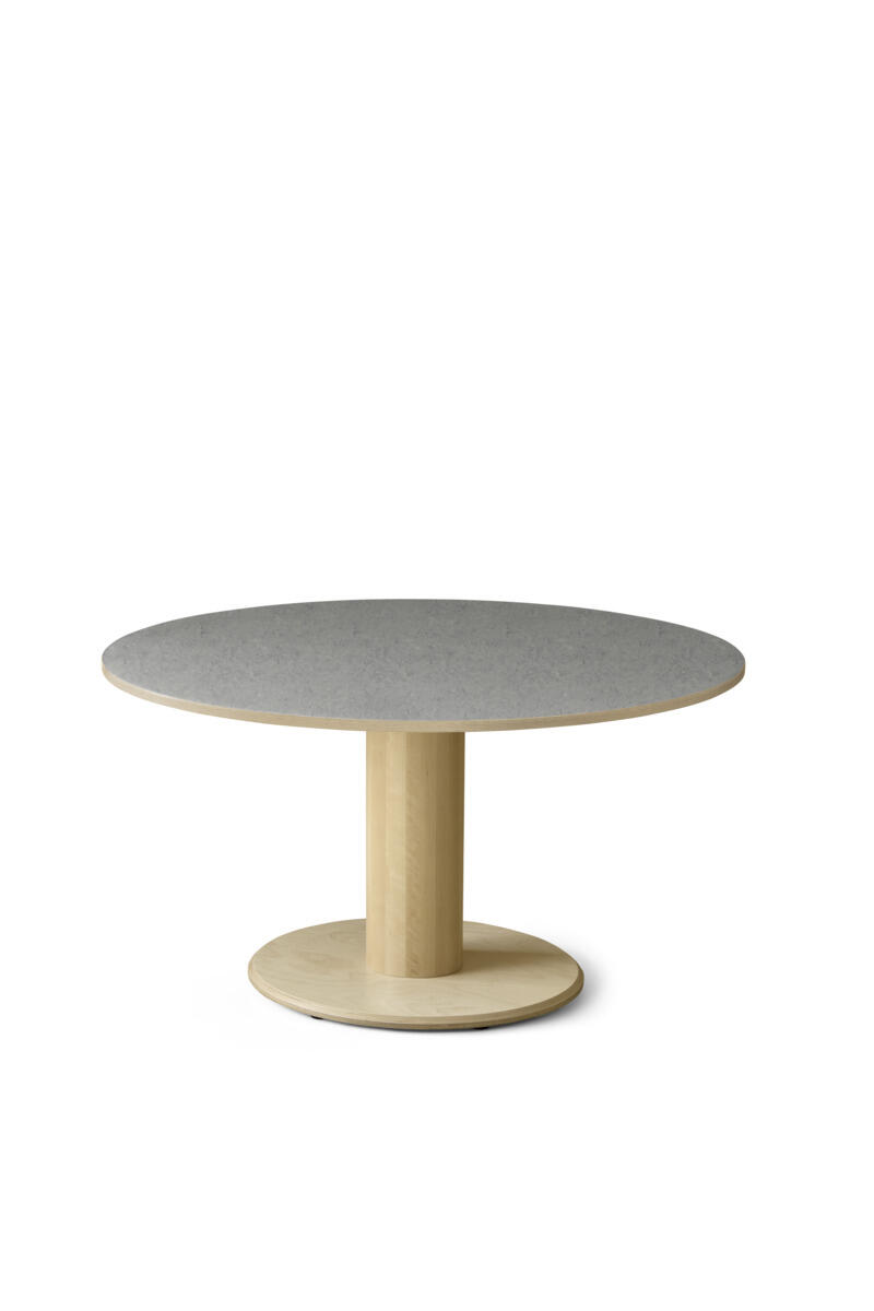 Pilaripöytä, jossa pohjalevy ja pylväs ovat kirkaslakattua massiivikoivua. Ääntä vaimentava pöytälevy on päällystetty kestävällä linoleumilla. Lattiaa suojaavat huopapintaiset kalustetassut.