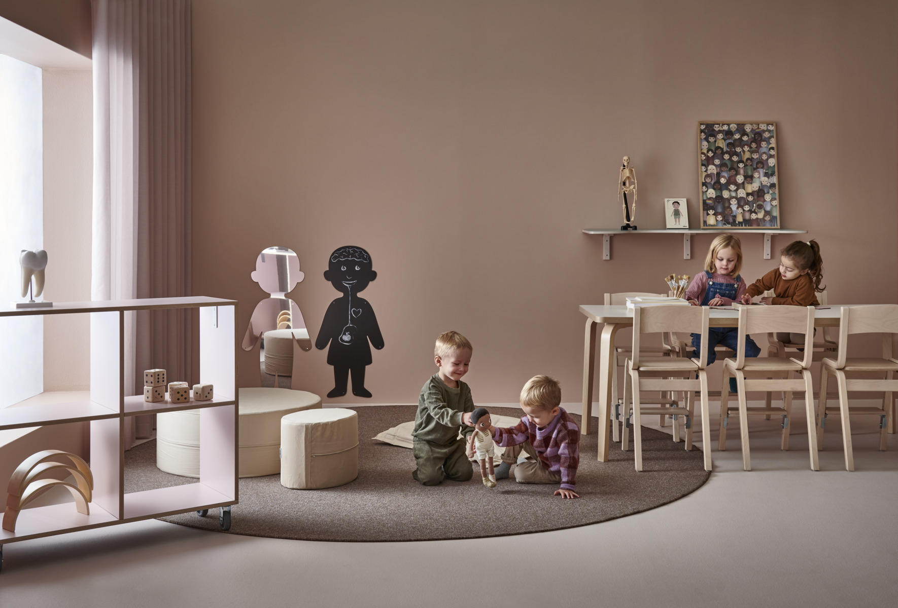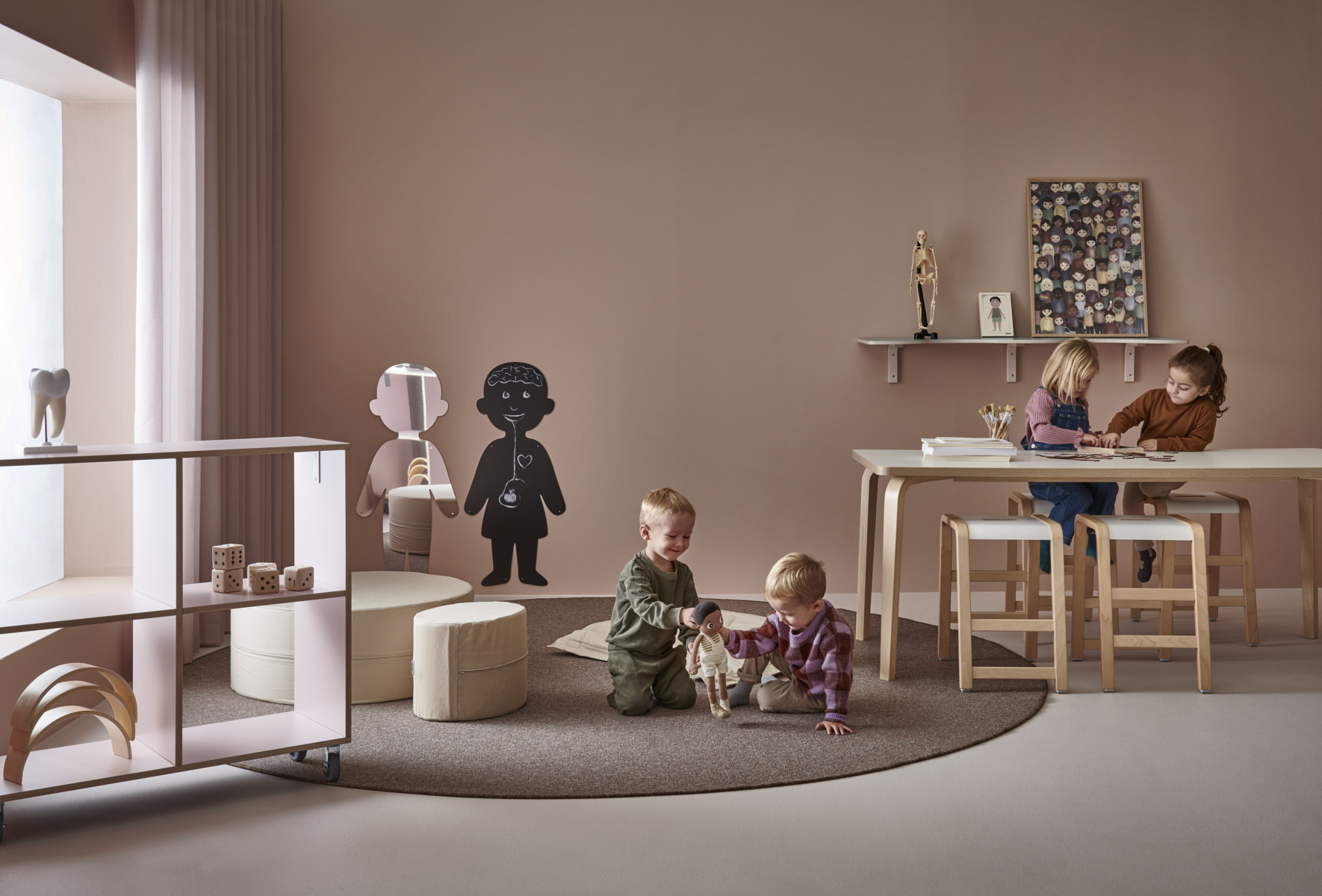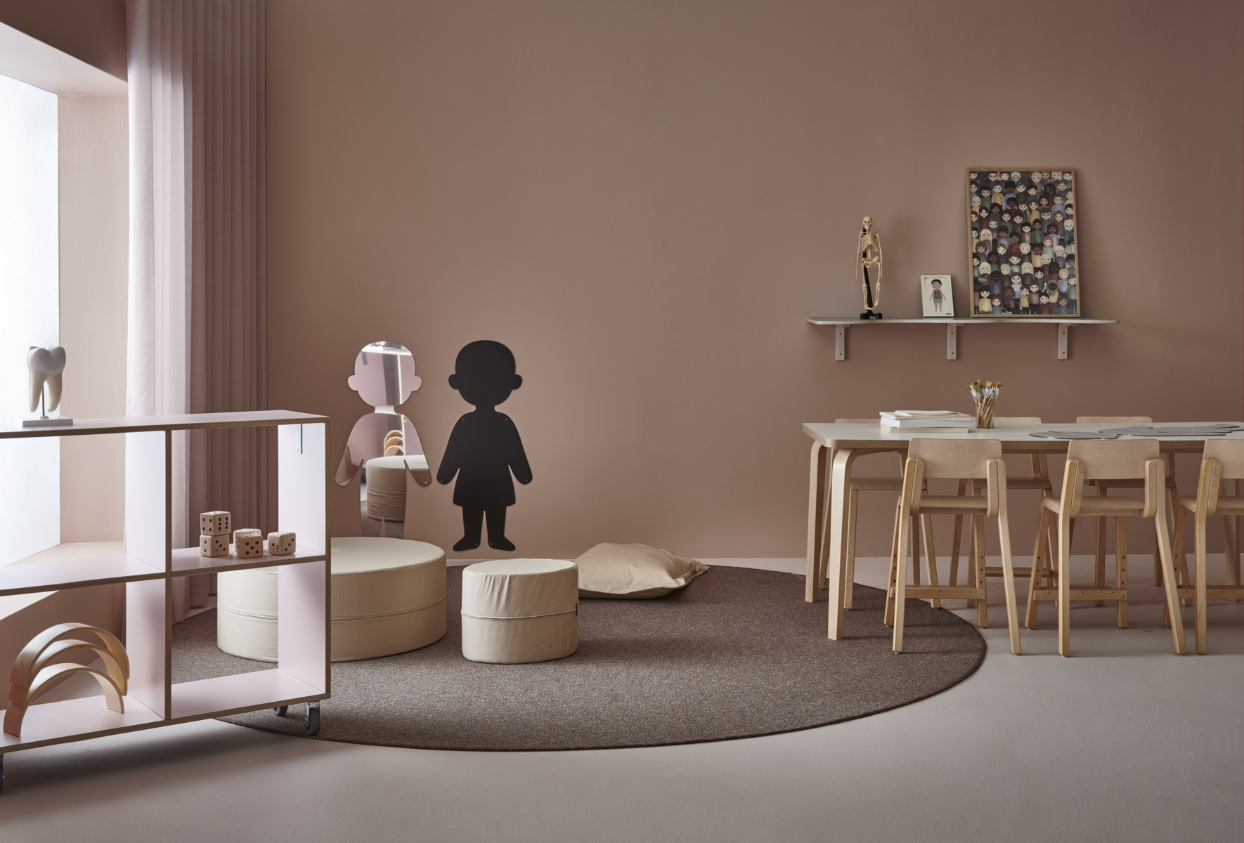 Arcus-pöydissä ei ole alasarjaa, joten jalkatilaa on enemmän. Akustoivassa kannessa on korkeapainelaminaattipinta ja abs-reunanauha. Pöydän kannen kulmissa on 40 mm pyöristys. Kuultovalkoiset koivuvaneriset taivutejalat kapenevat alaspäin, jalan kulma on ulkoneva.