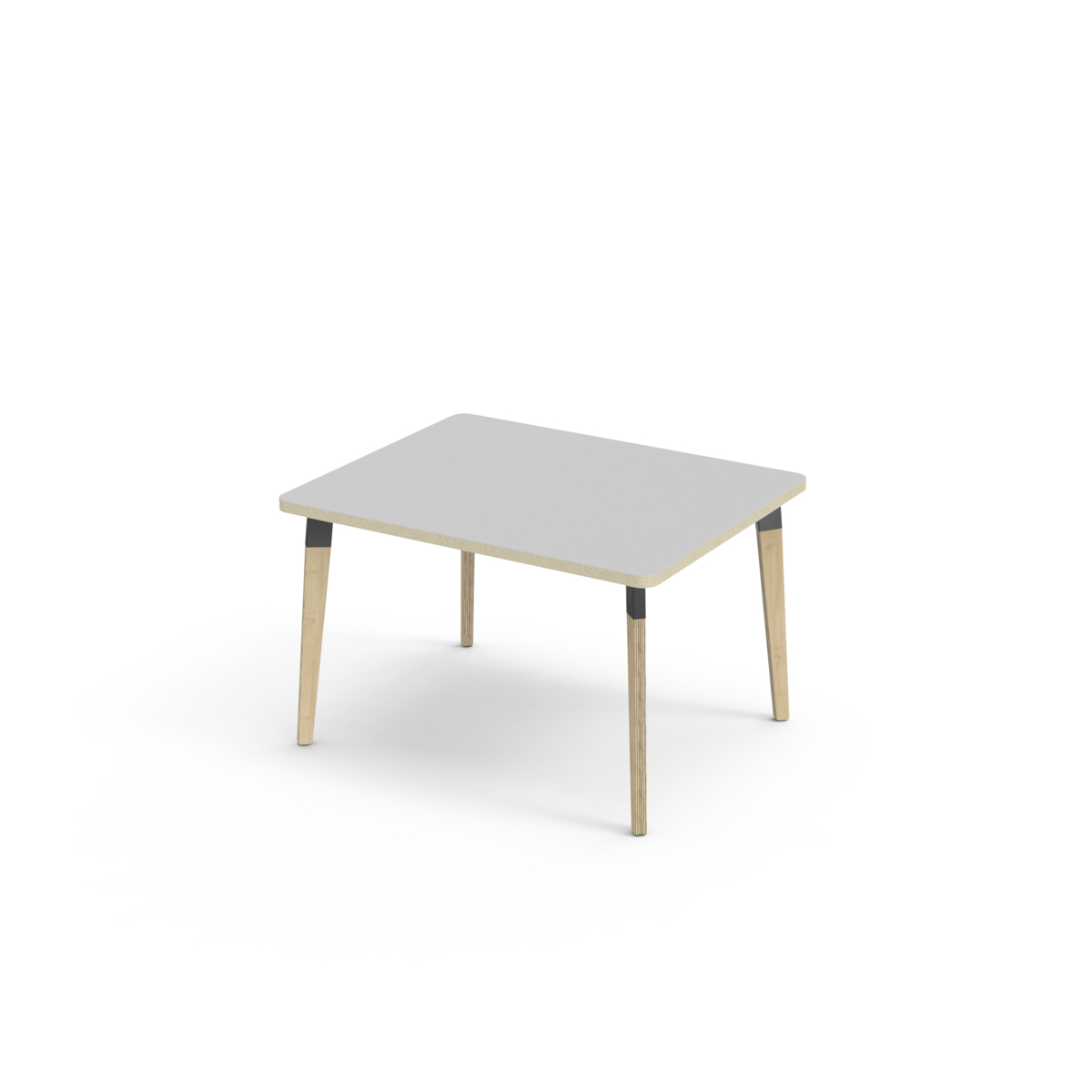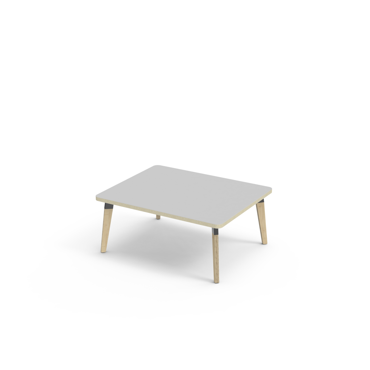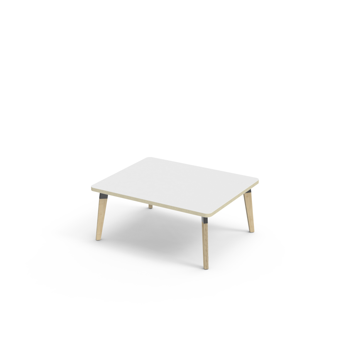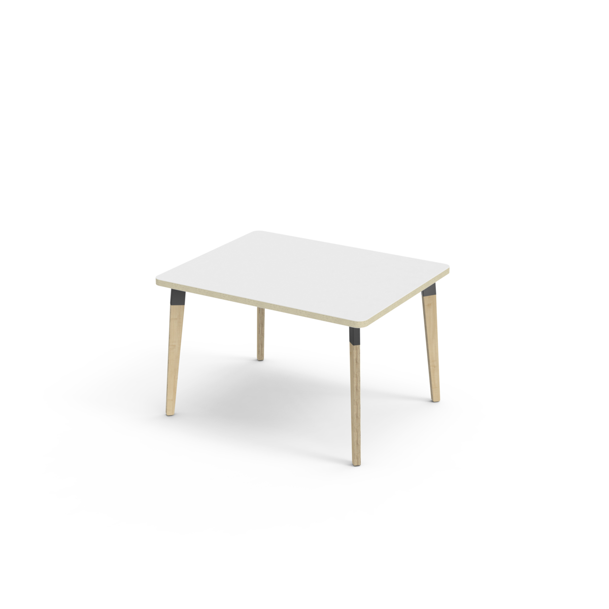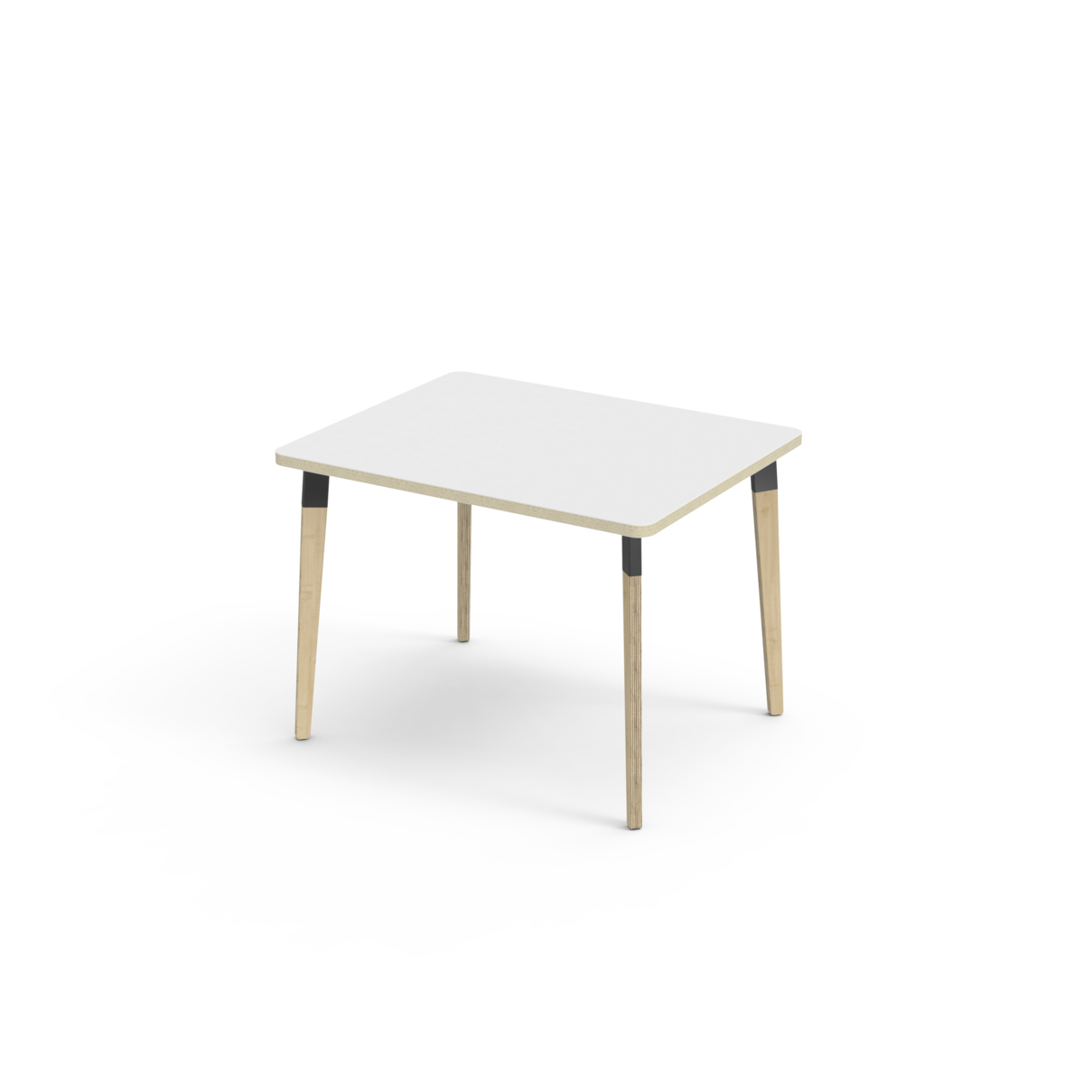 Pöydän kannessa on laminaattipinta. Pöydän kannen kulmissa on 40 mm pyöristys, jonka ansiosta pöytä saa modernin ja tyylikkään ilmeen. Jalat ovat suorakulmaiset ja valmistettu kirkaslakatusta koivuvanerista, ja ne on kiinnitetty tukevalla valkoisella metalliholkilla. Jalan kulma on ulkoneva; rakenne takaa sekä vakauden että kestävyyden.