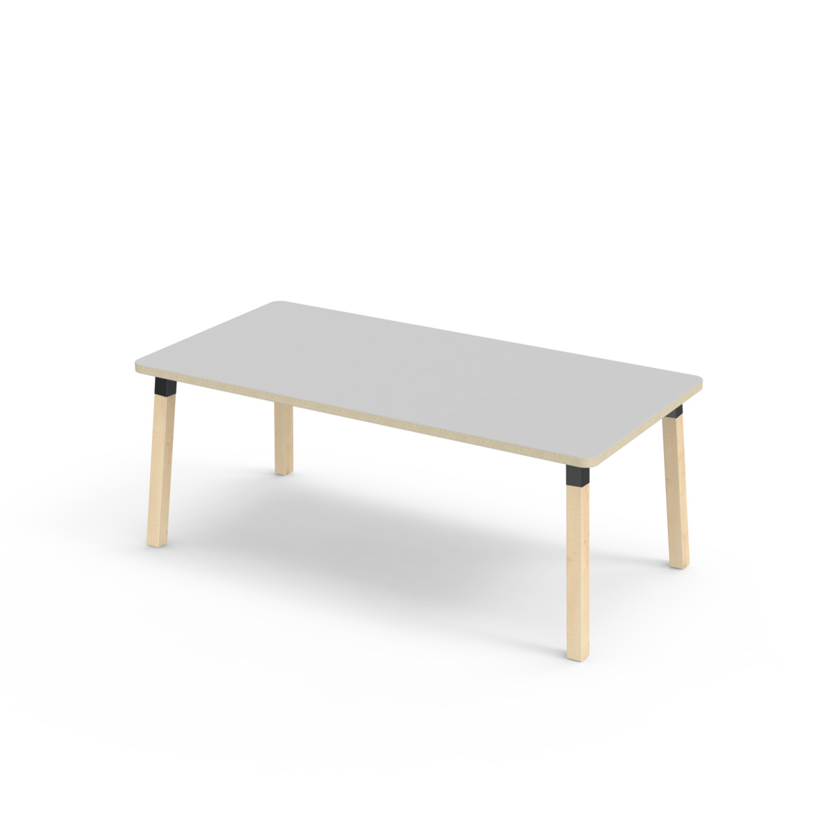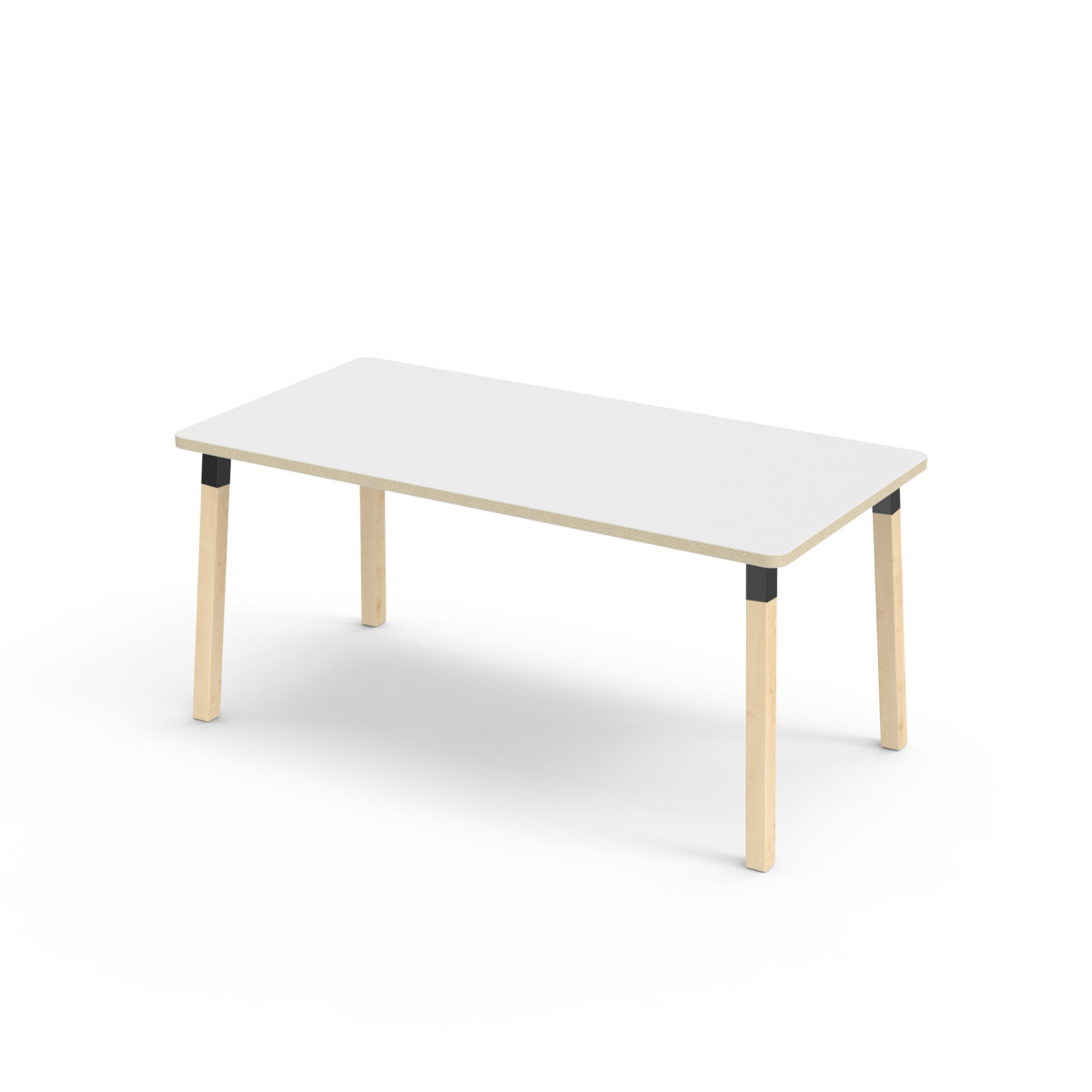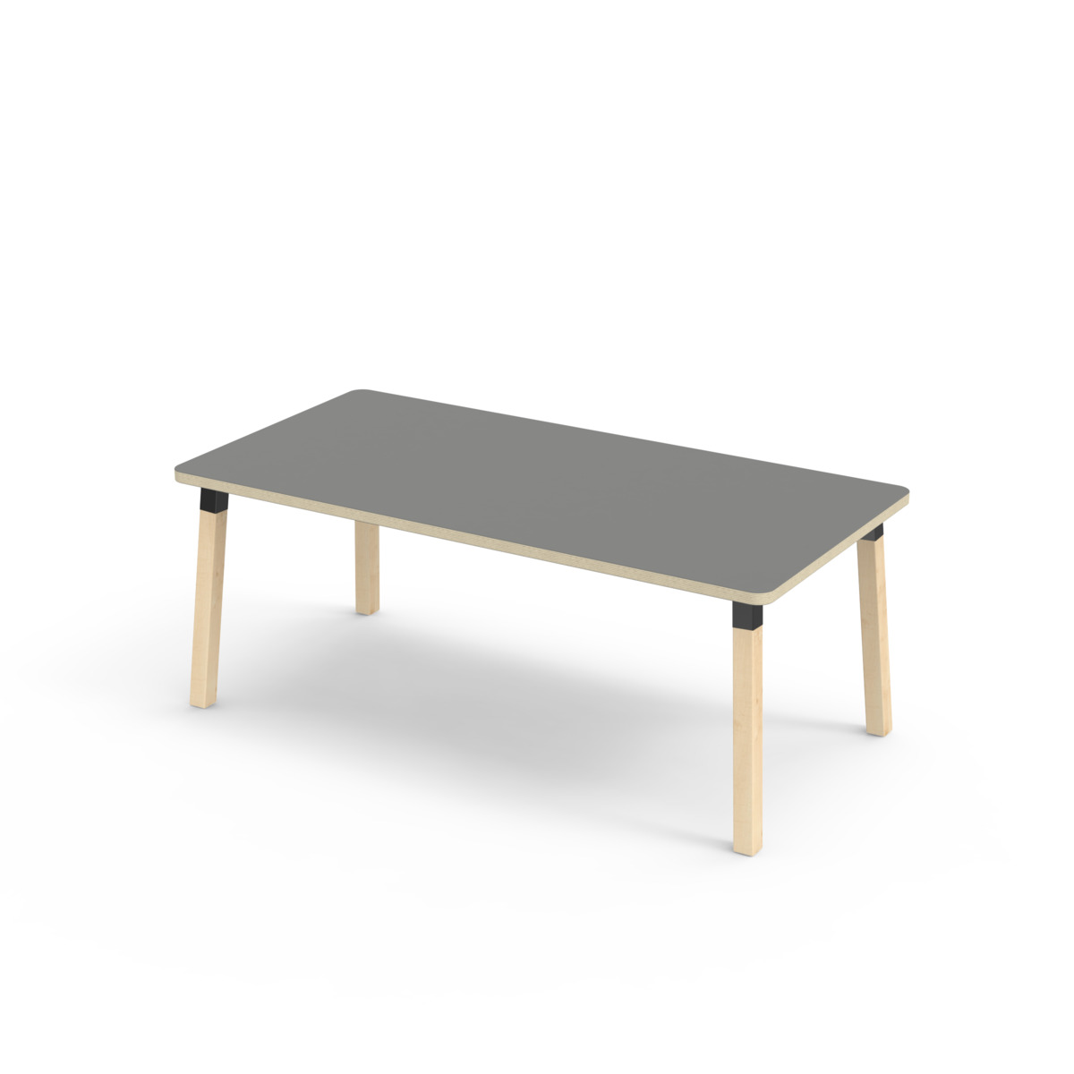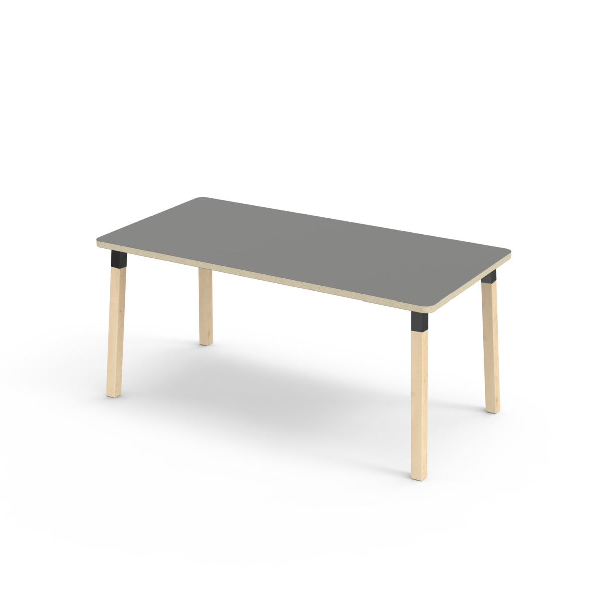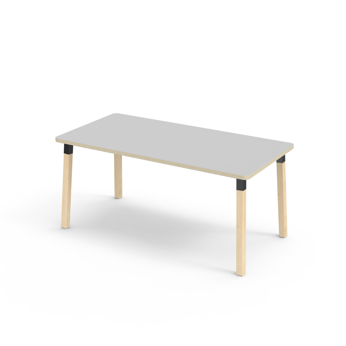 Pöydän kannessa on ääntä vaimentava rakenne ja kestävä korkeapainelaminaattipinta. Pöydän kannen kulmissa on 40 mm pyöristys, jonka ansiosta pöytä saa modernin ja tyylikkään ilmeen. Jalat on valmistettu kirkaslakatusta massiivikoivusta ja kiinnitetty tukevalla metalliholkilla. Jalan kulma on ulkoneva; rakenne takaa sekä vakauden että kestävyyden.