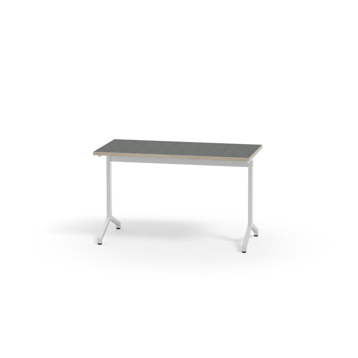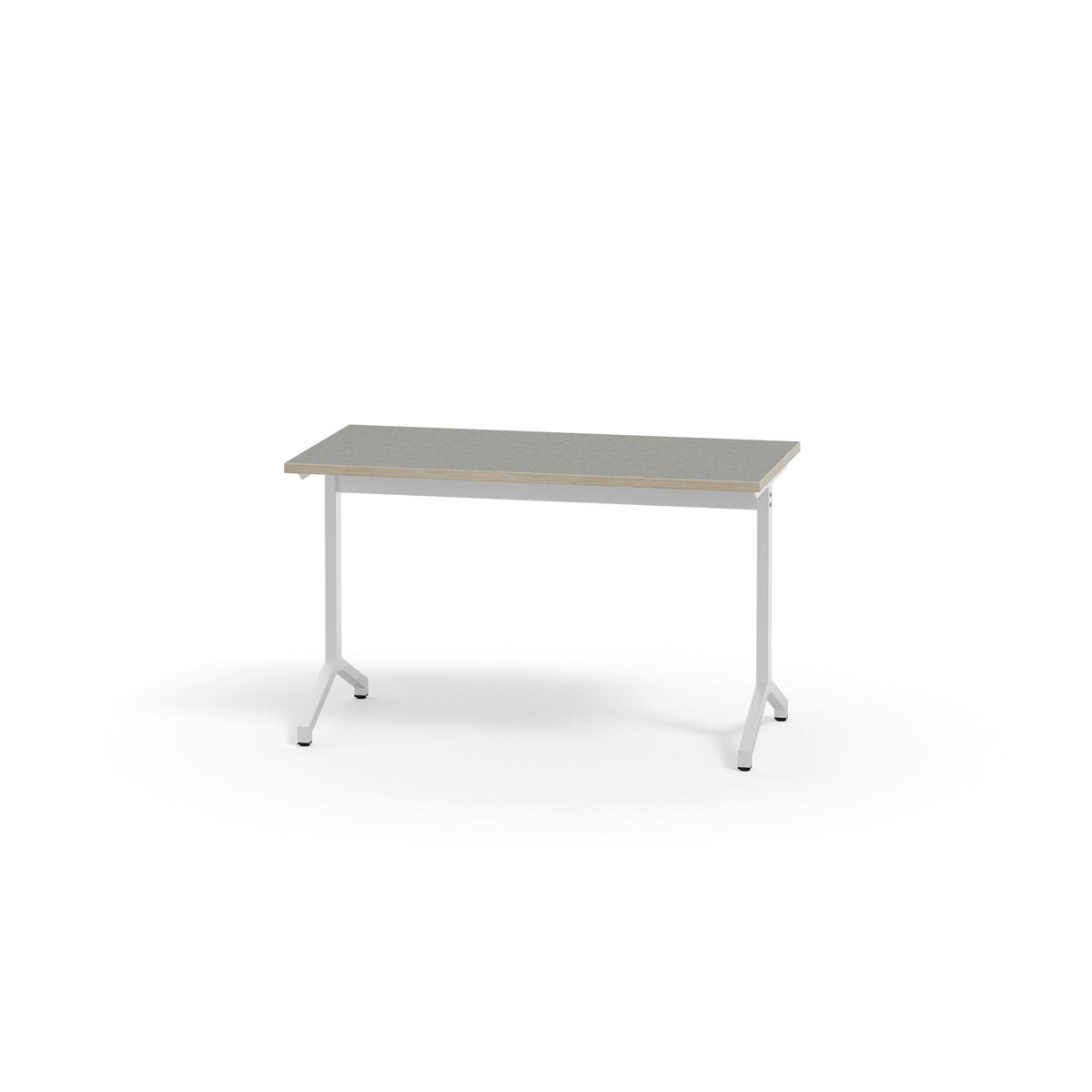 Pöydän kansi ääntä vaimentavaa linoleumia. Jaloissa säätötassut. Jalusta valkoinen RAL 9003.
