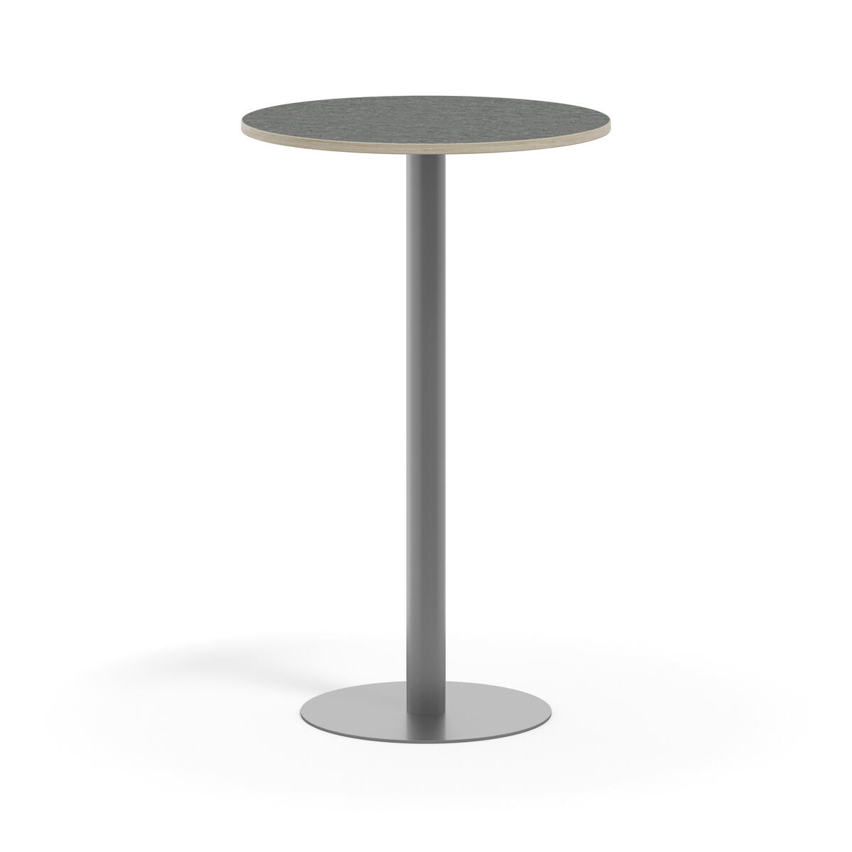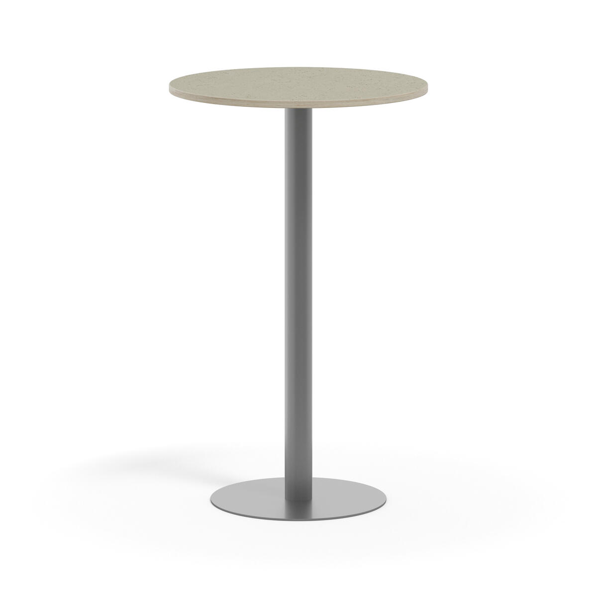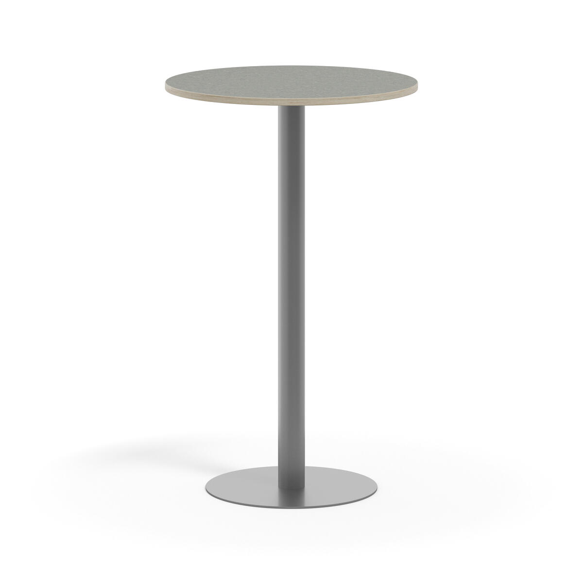 Pilaripöytä jauhemaalatulla metallijalustalla, väri hopea RAL 9006. Kannessa kestävä korkeapainelaminaattipinta. Täyttää EN 15372:2016 standardin mukaiset tukevuuden, kestävyyden ja turvallisuuden vaatimukset.