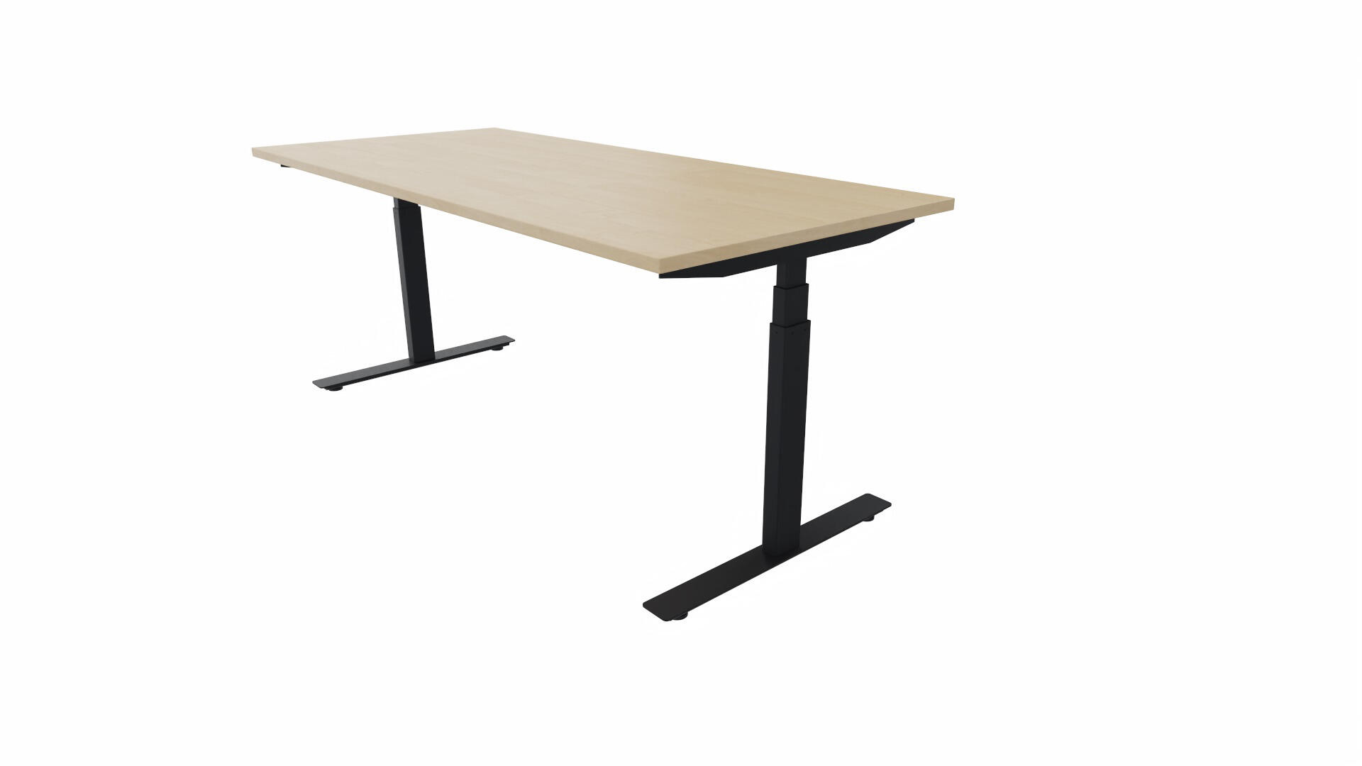 Pöydän kansi laminaattipinnalla ja abs-reunalla. Sähkömoottorilla säädettävä korkeus 63 – 129 cm. Kannen vahvuus 1,8 cm. Pöydässä on törmäyksenestotunnistin, joka pysäyttää korkeudensäädön törmäyksen sattuessa. Jaloissa säätötassut. Jalkasuksen mitat 61 x 6 cm.