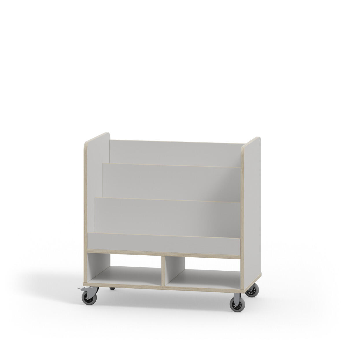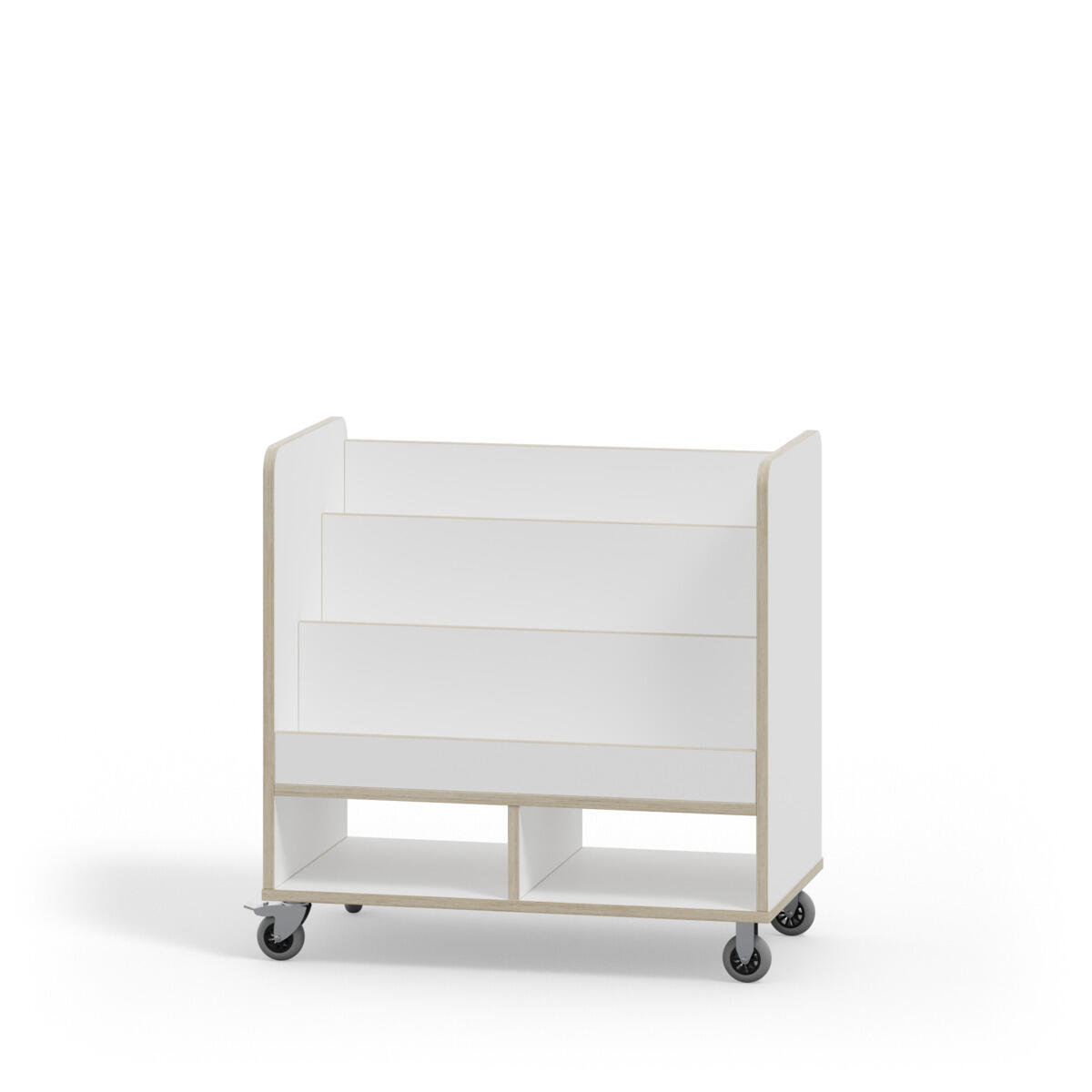 Kirjavaunu materiaali lakattua koivuvaneria. Mitat LxSxK: 65 x 55 x 81 cm. Kaksipuoleinen kirjavaunu jossa 2 tasoa kirjoille molemmin puolin. 4 pyörää, joista 2 lukittavaa.