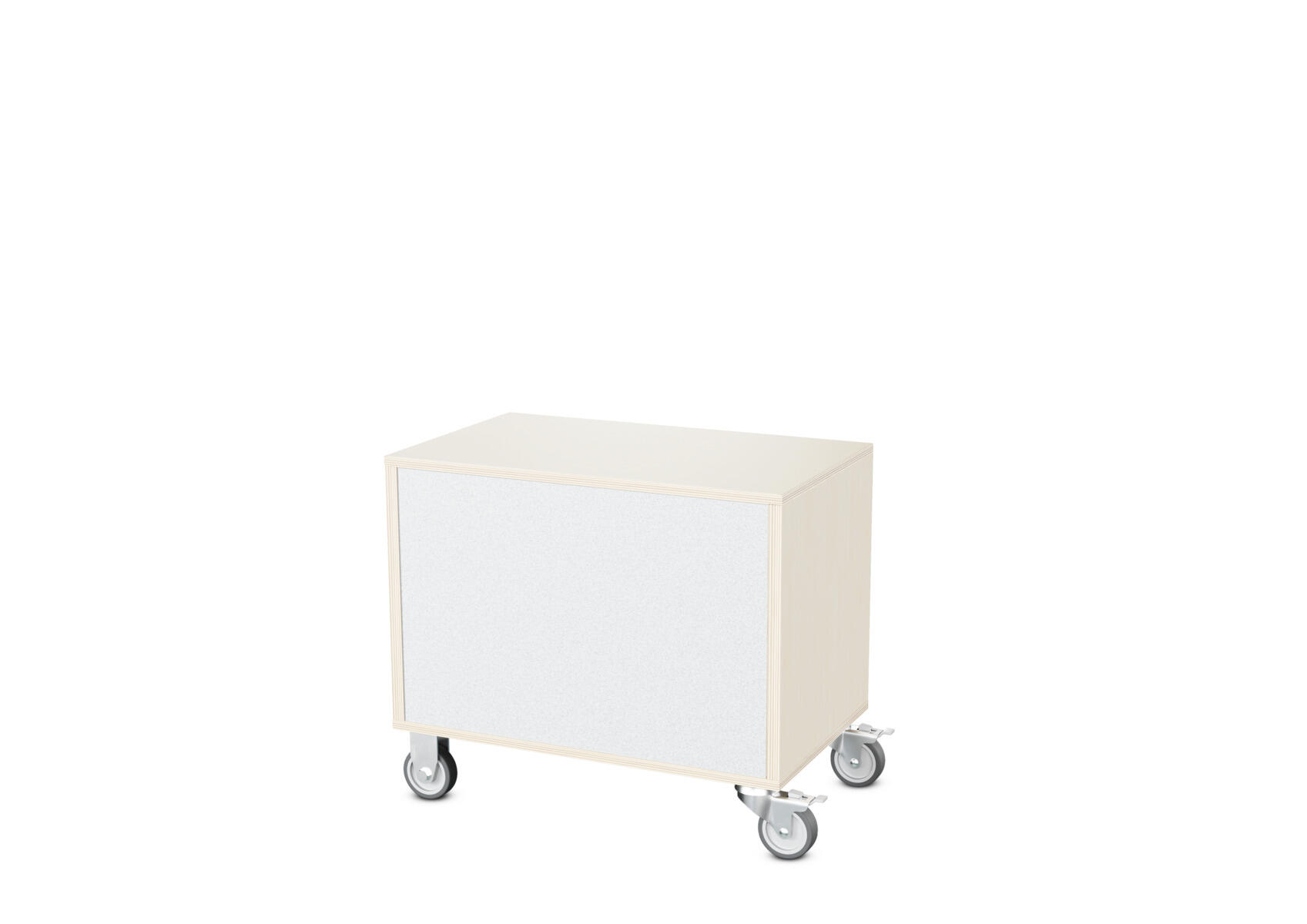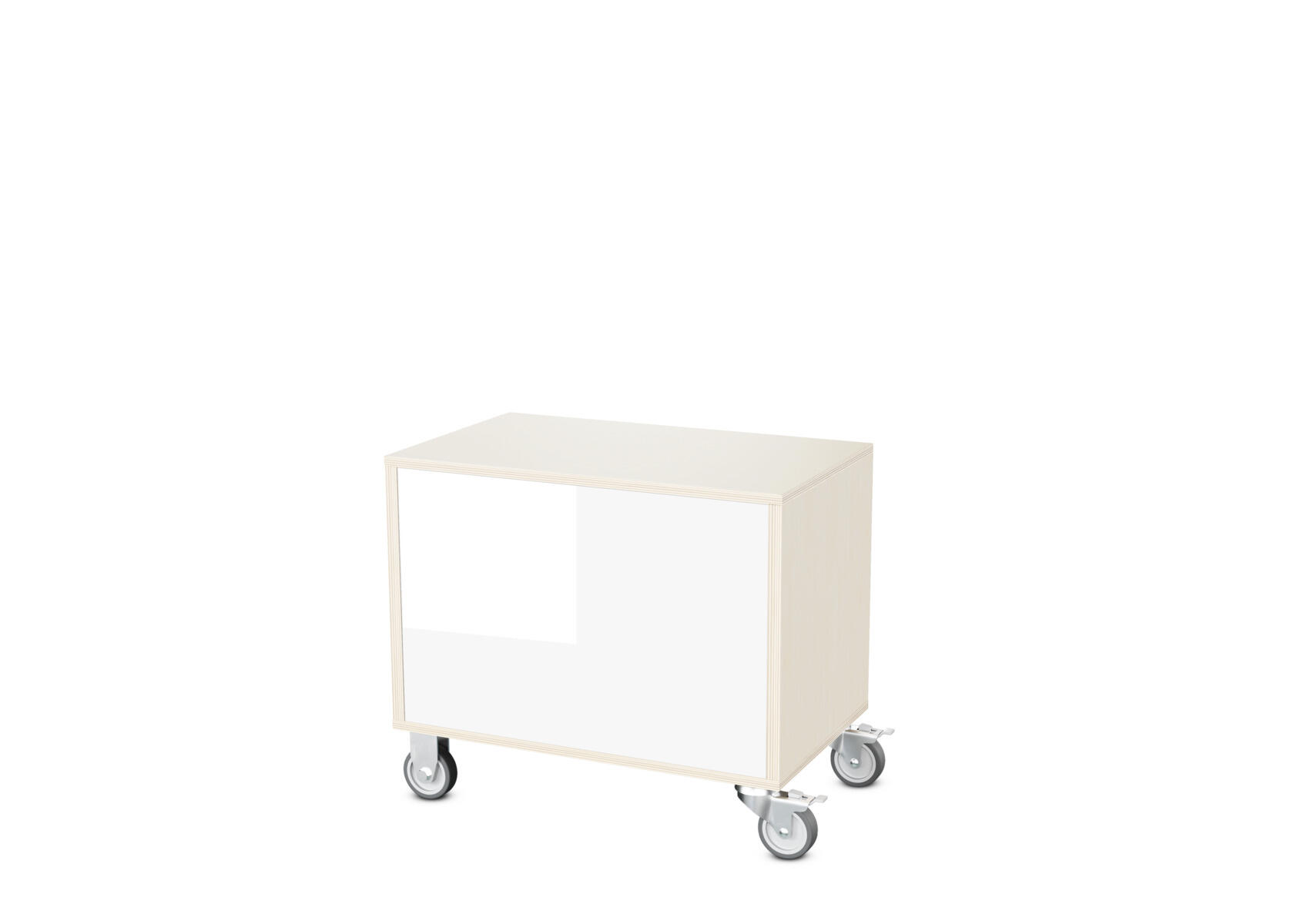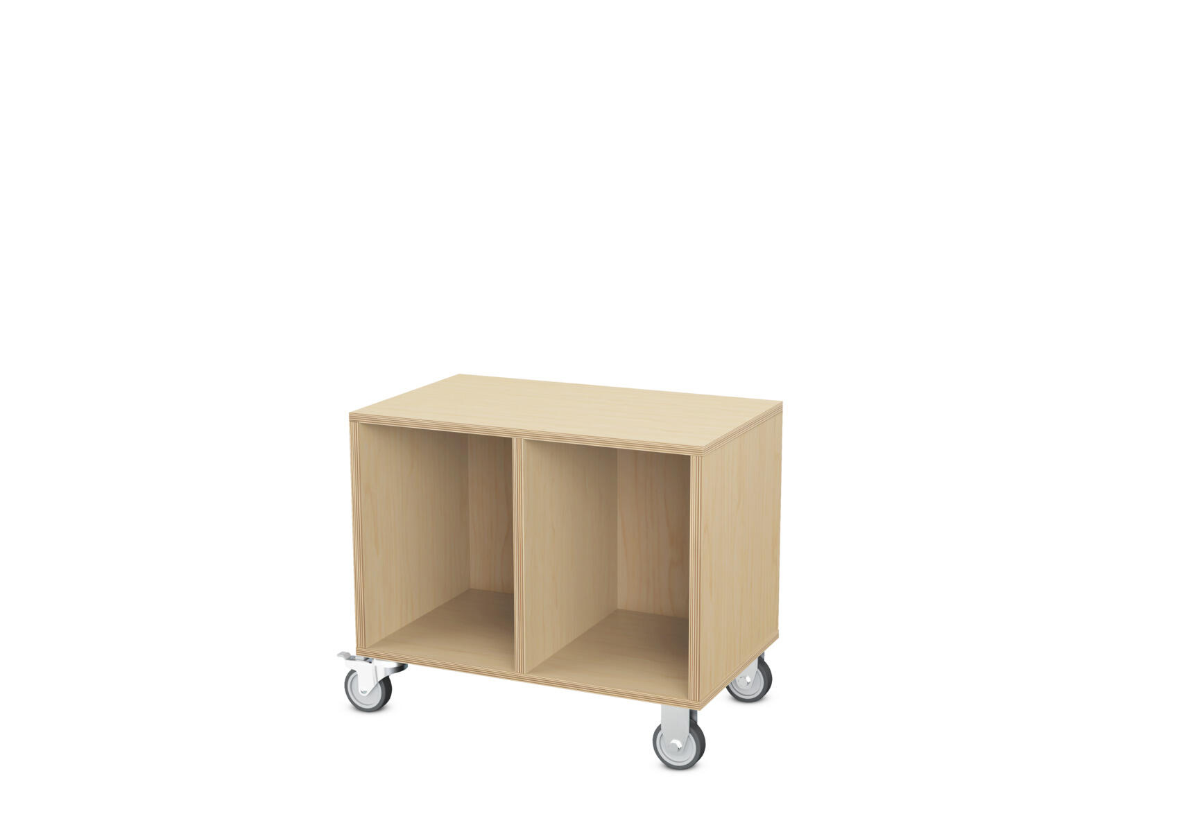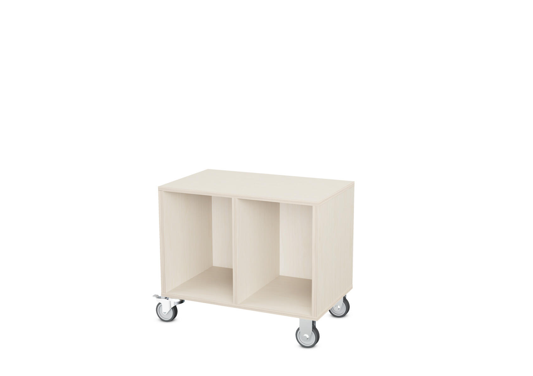 Säilytyskaluste, jossa valittavissa erilaisia taustavaihtoehtoja omaan tarpeeseen. Valmistettu koivuvanerista. Kiinteät hyllyt ja väliseinät. Varustettu neljällä pyörällä, joista kaksi on kiinteää ja kaksi lukittavaa kääntöpyörää.