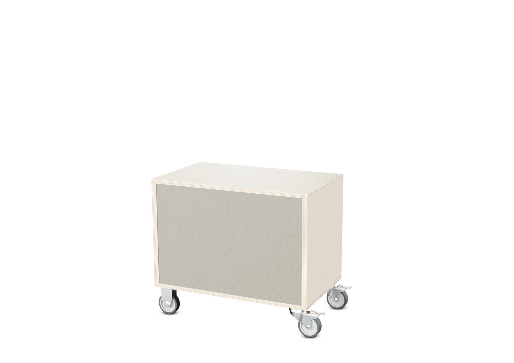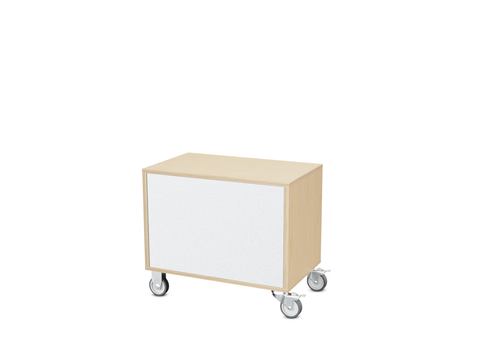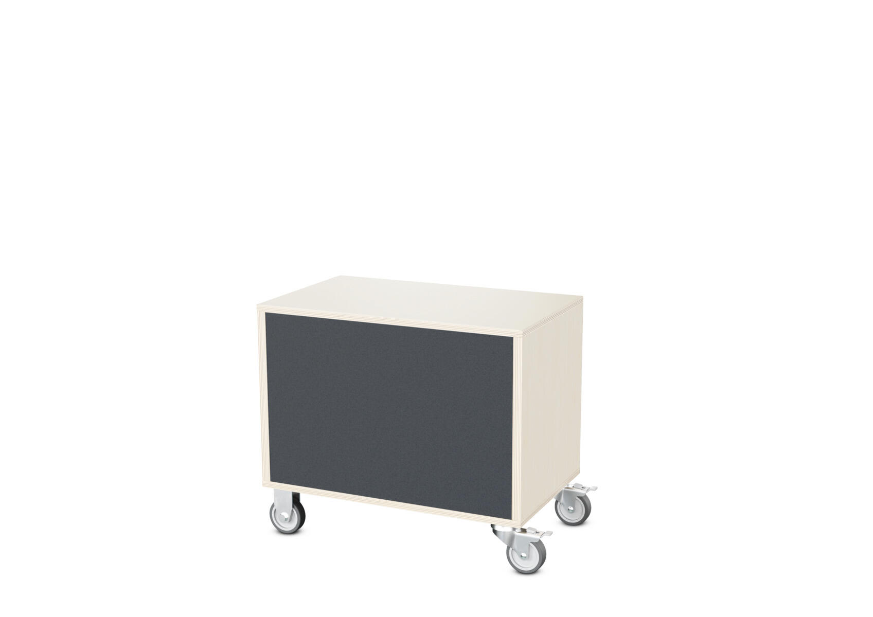 Säilytyskaluste, jossa valittavissa erilaisia taustavaihtoehtoja omaan tarpeeseen. Valmistettu koivuvanerista. Kiinteät hyllyt ja väliseinät. Varustettu neljällä pyörällä, joista kaksi on kiinteää ja kaksi lukittavaa kääntöpyörää.