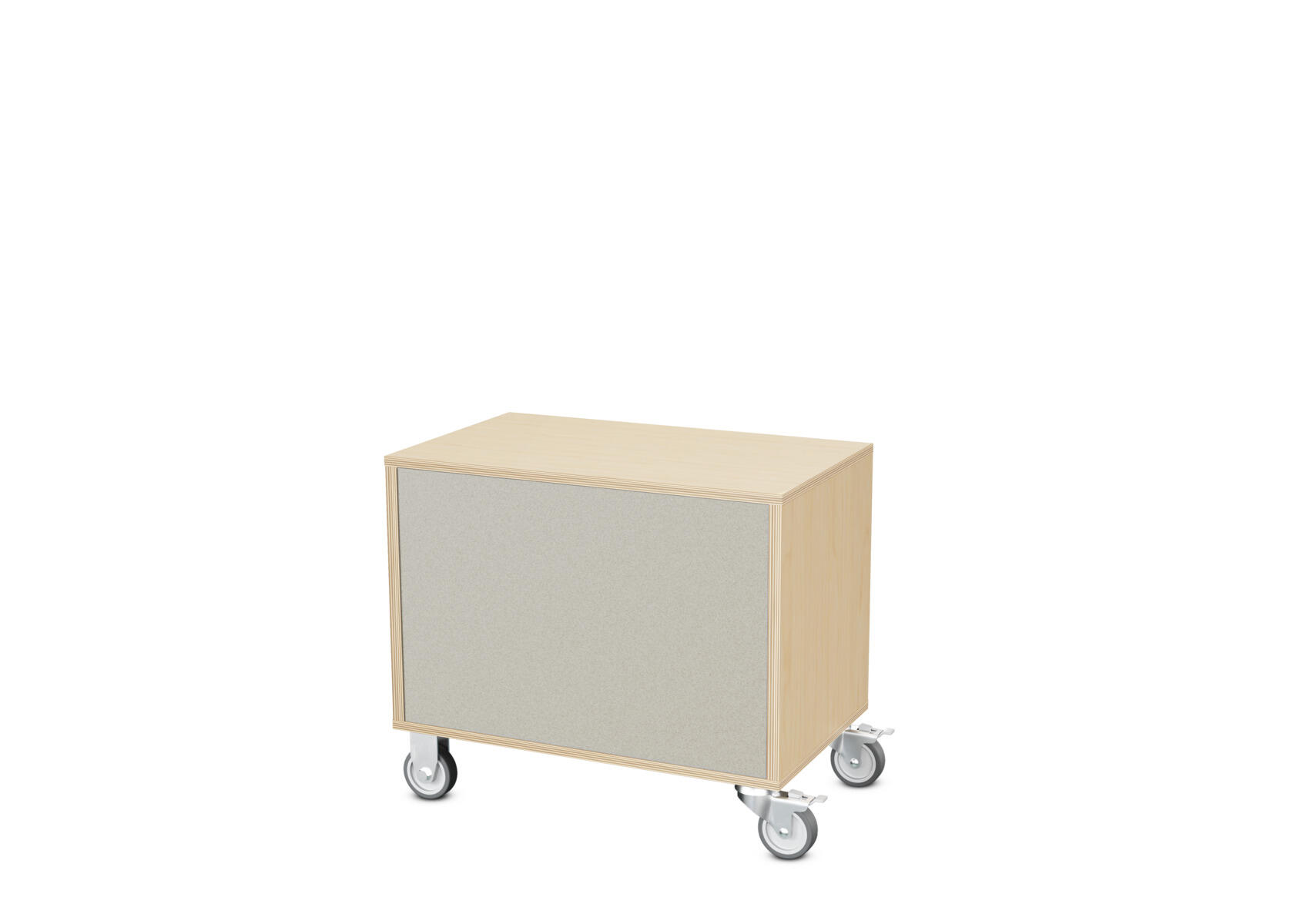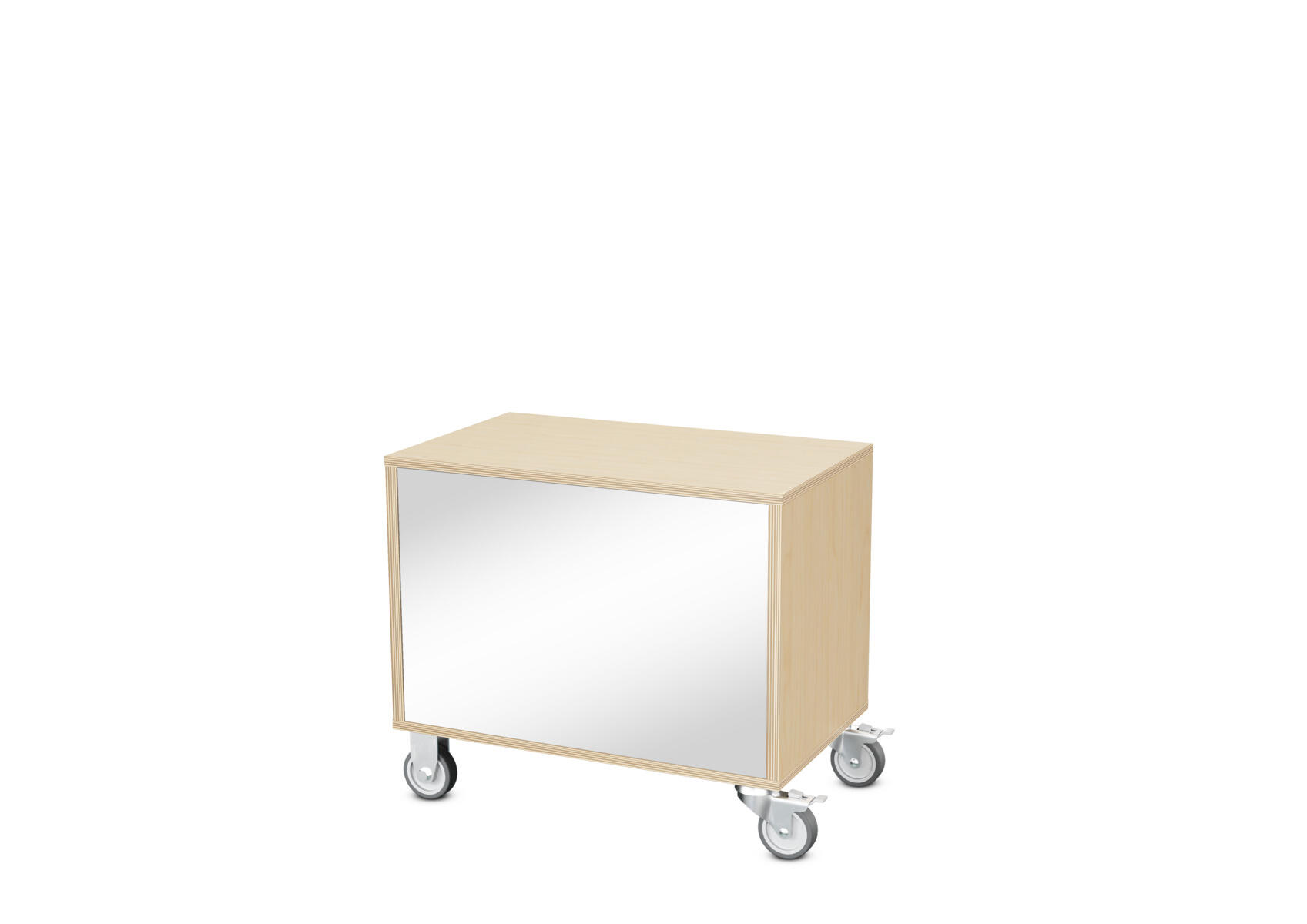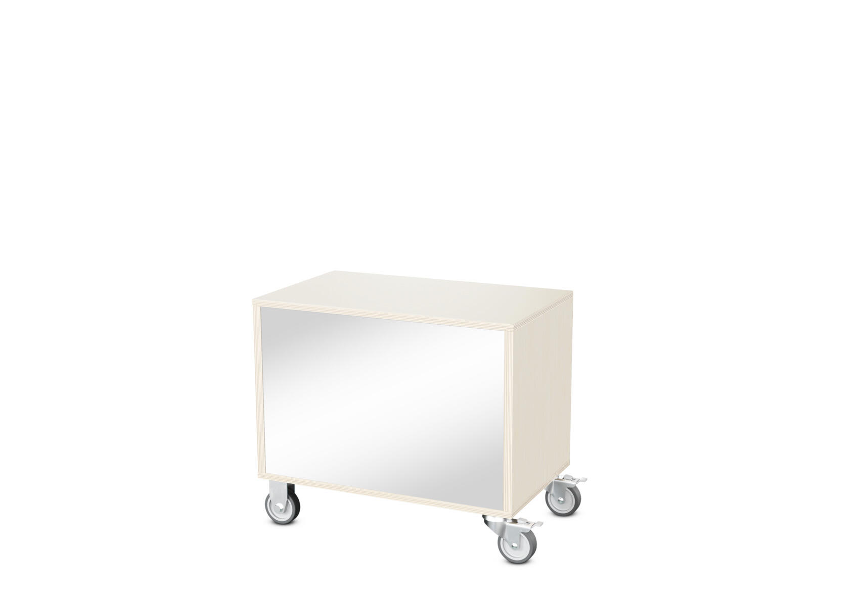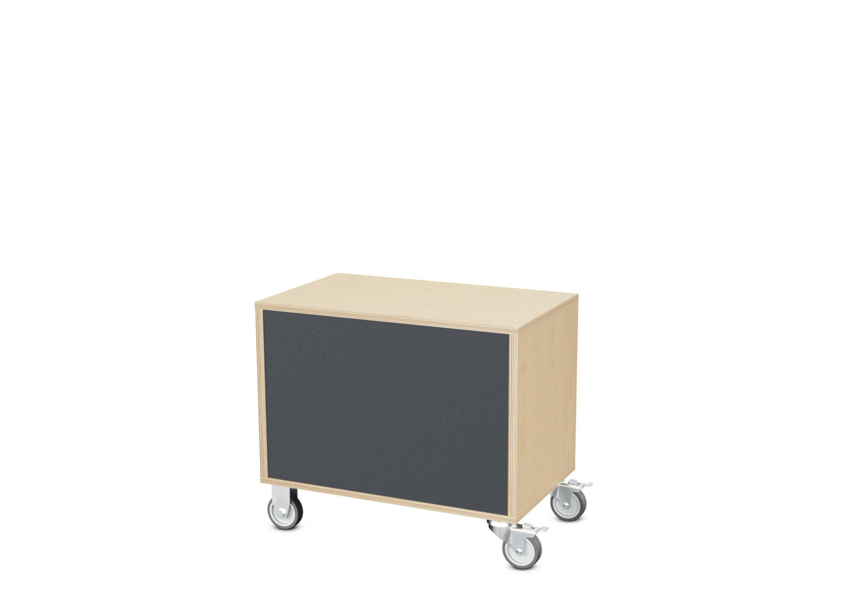 Säilytyskaluste, jossa valittavissa erilaisia taustavaihtoehtoja omaan tarpeeseen. Valmistettu koivuvanerista. Kiinteät hyllyt ja väliseinät. Varustettu neljällä pyörällä, joista kaksi on kiinteää ja kaksi lukittavaa kääntöpyörää.