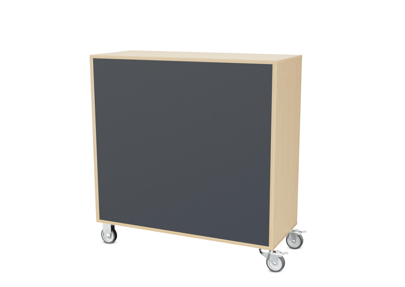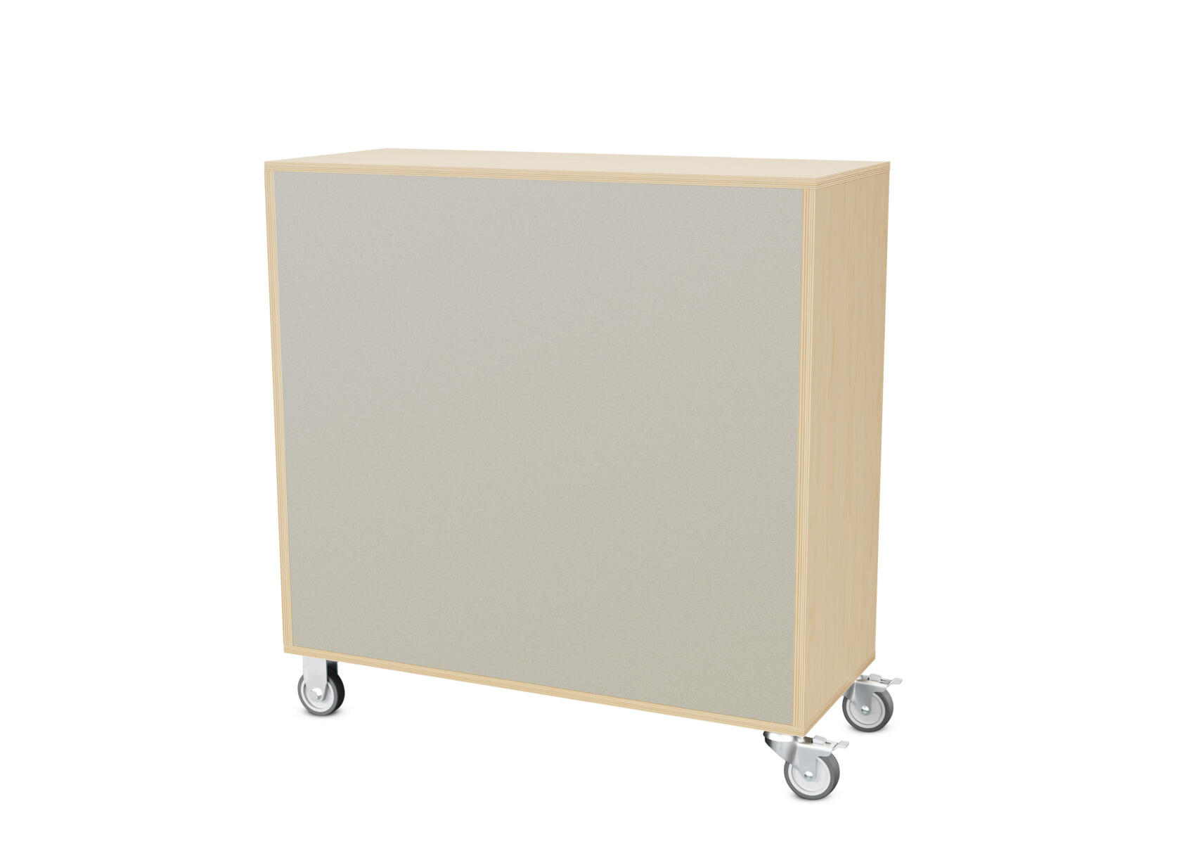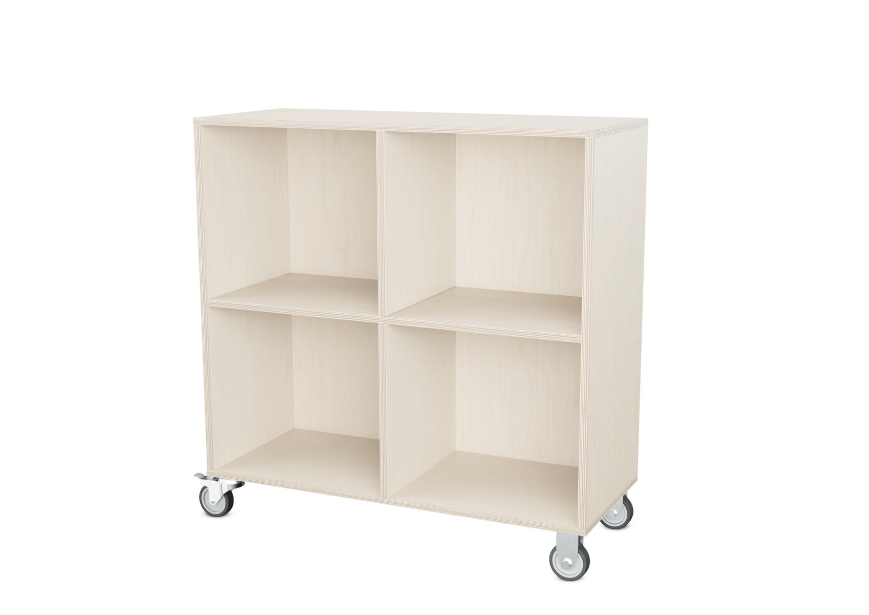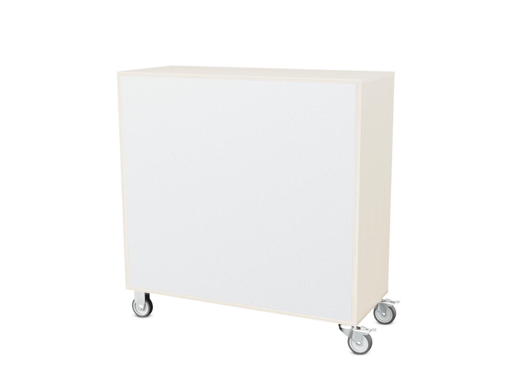 Säilytyskaluste, jossa valittavissa erilaisia taustavaihtoehtoja omaan tarpeeseen. Valmistettu koivuvanerista. Kiinteät hyllyt ja väliseinät. Varustettu neljällä pyörällä, joista kaksi on kiinteää ja kaksi lukittavaa kääntöpyörää.