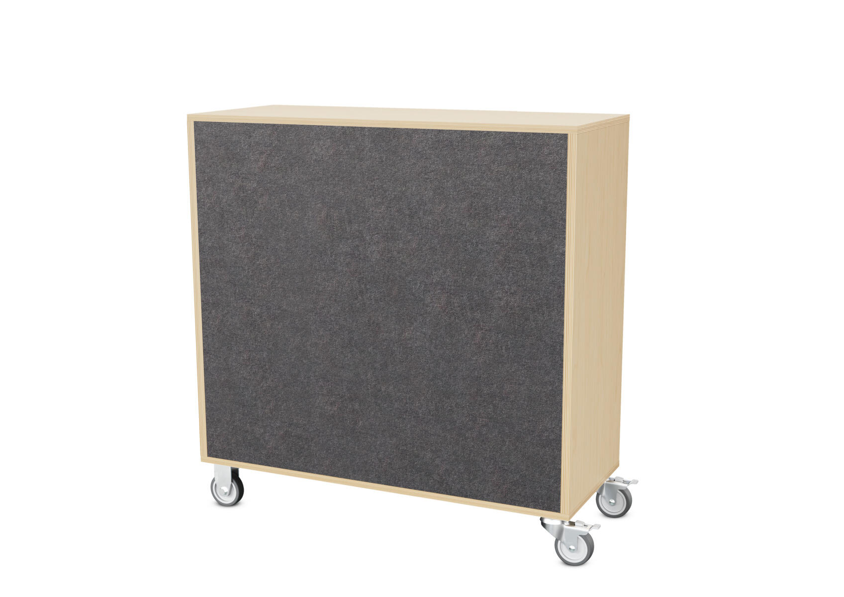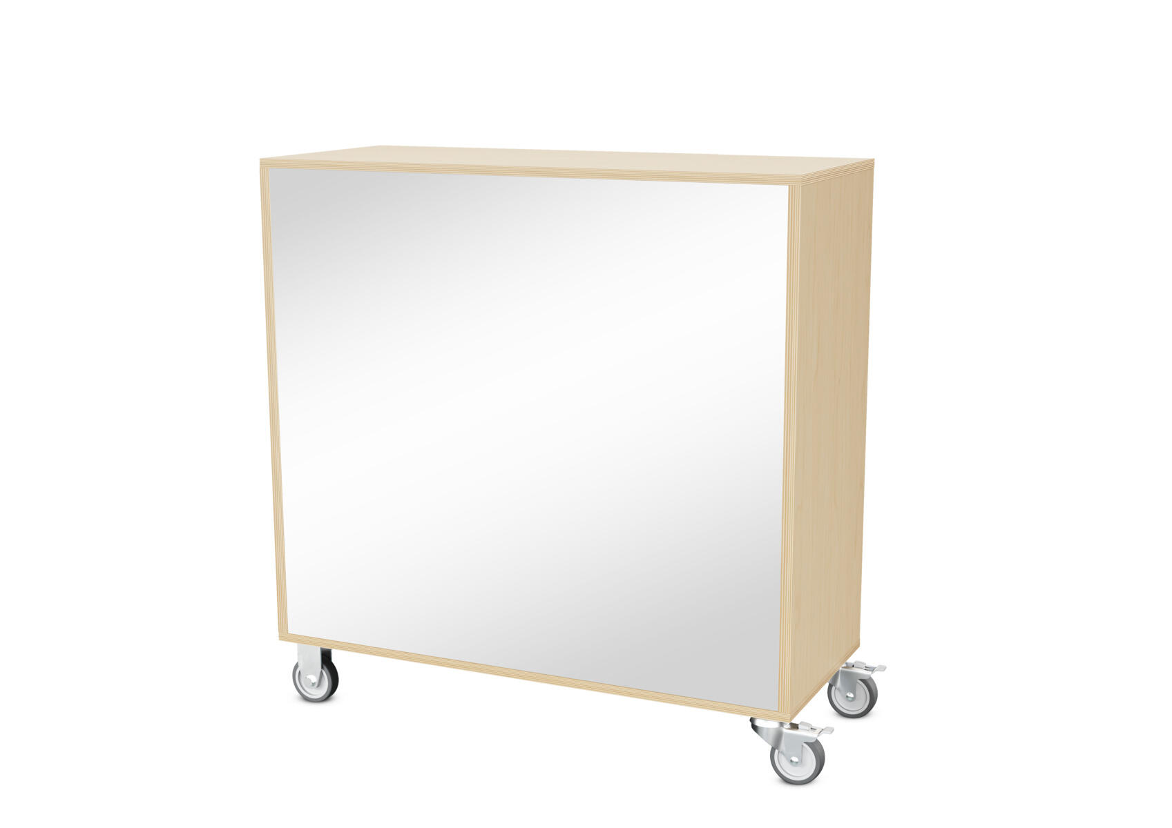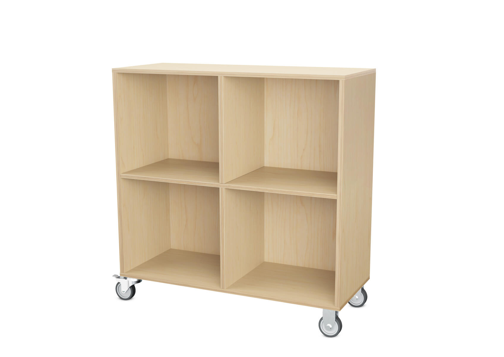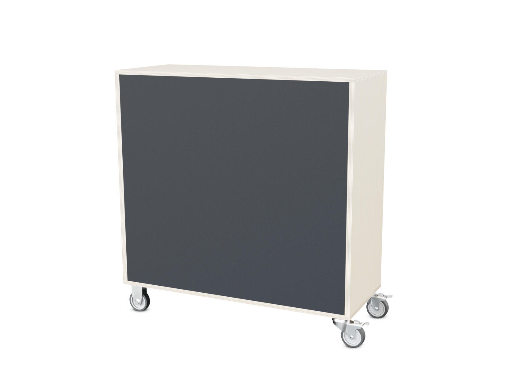 Säilytyskaluste, jossa valittavissa erilaisia taustavaihtoehtoja omaan tarpeeseen. Valmistettu koivuvanerista. Kiinteät hyllyt ja väliseinät. Varustettu neljällä pyörällä, joista kaksi on kiinteää ja kaksi lukittavaa kääntöpyörää.