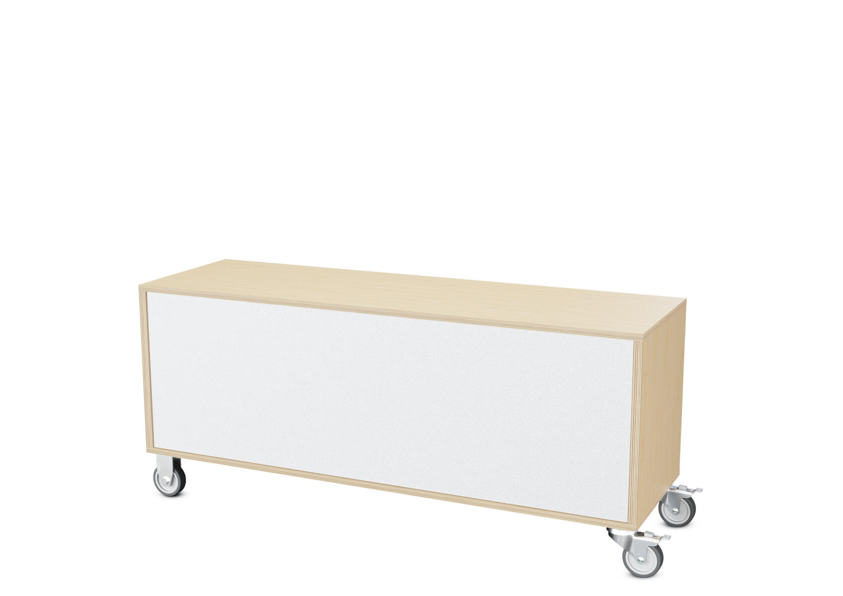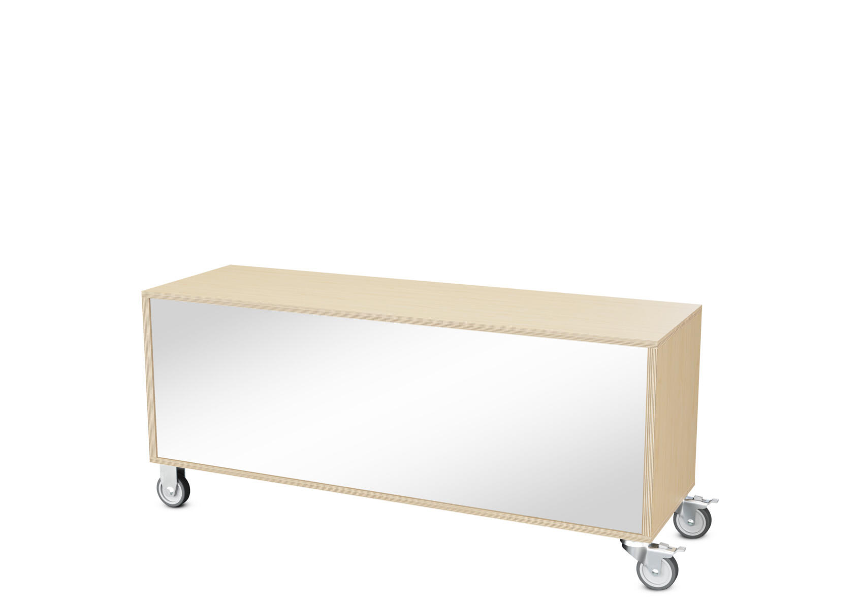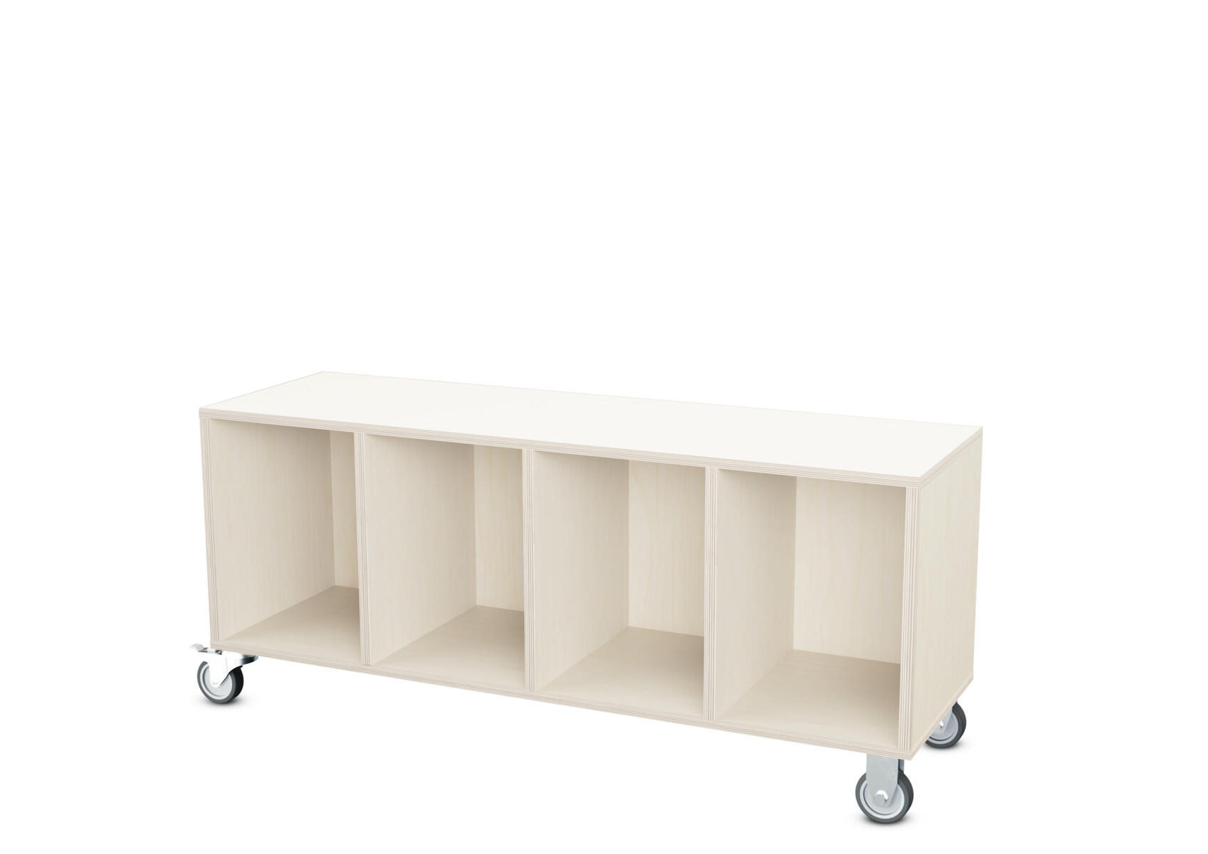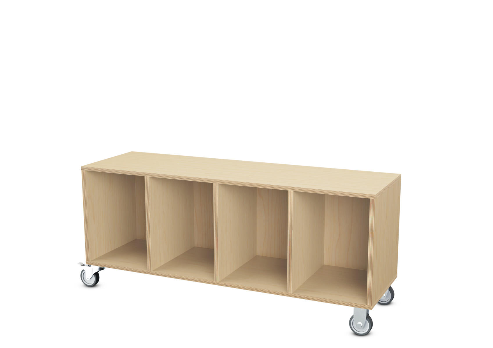 Säilytyskaluste, jossa valittavissa erilaisia taustavaihtoehtoja omaan tarpeeseen. Valmistettu koivuvanerista. Kiinteät hyllyt ja väliseinät. Varustettu neljällä pyörällä, joista kaksi on kiinteää ja kaksi lukittavaa kääntöpyörää.