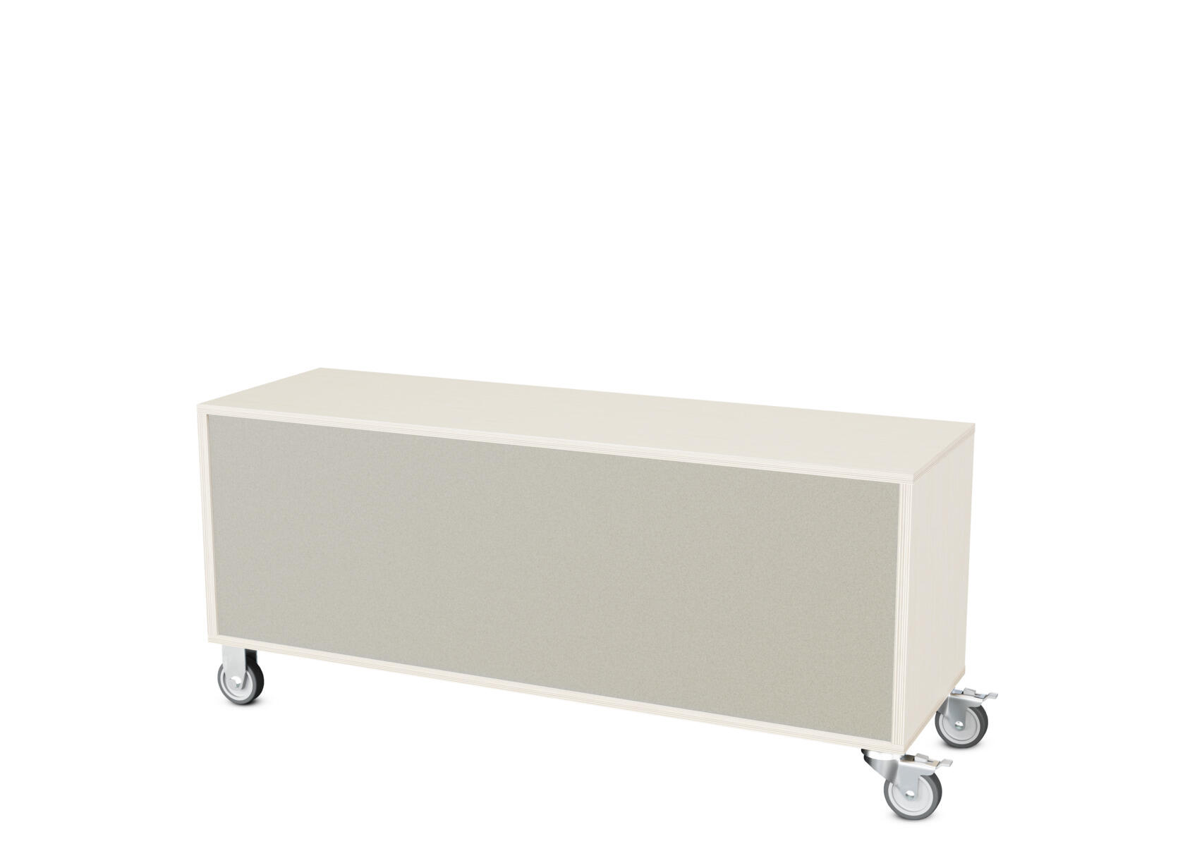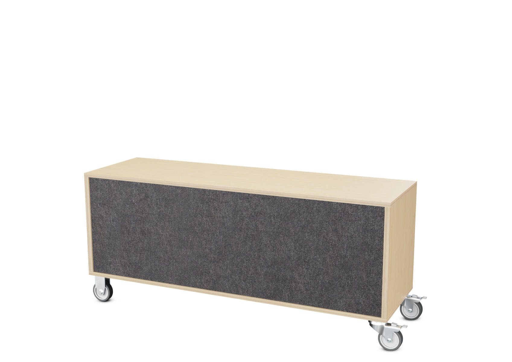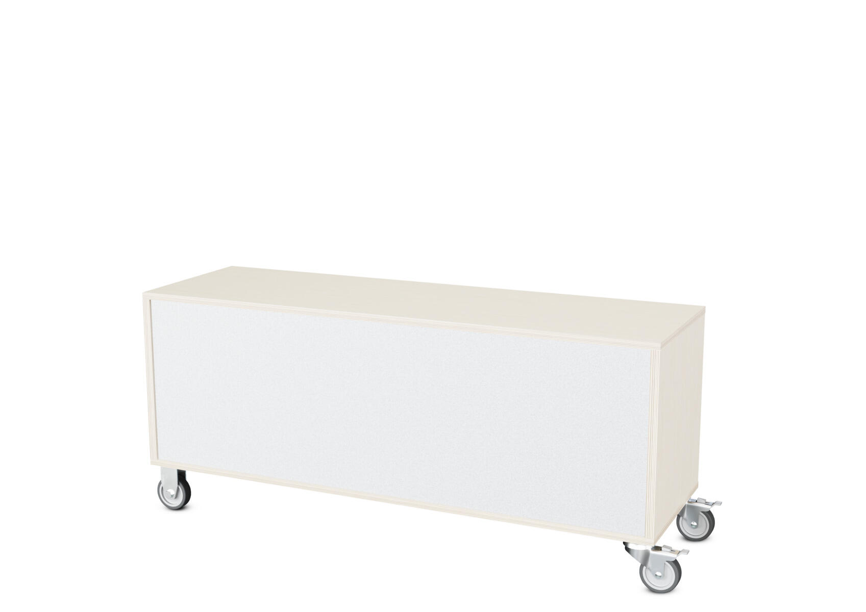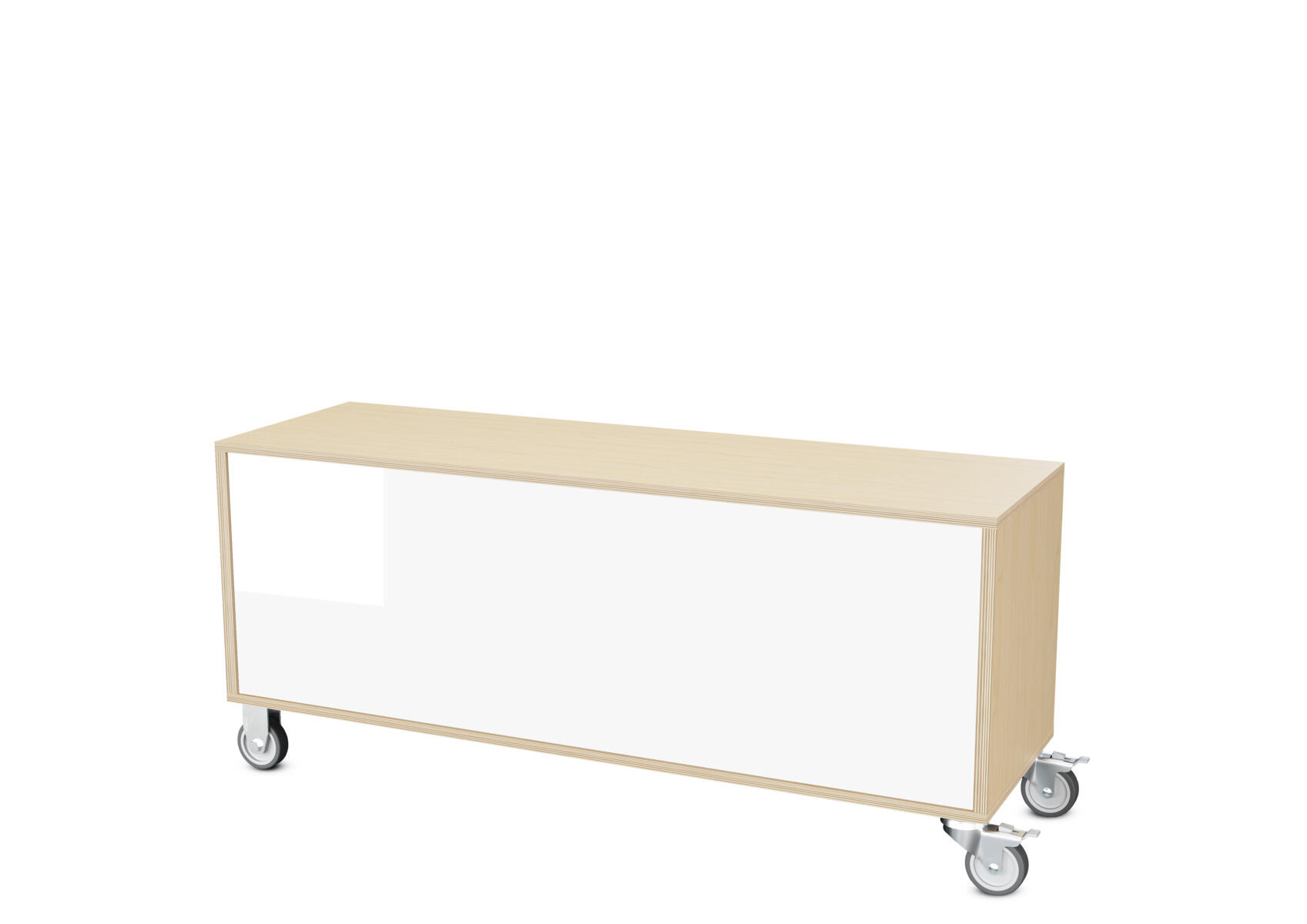 Säilytyskaluste, jossa valittavissa erilaisia taustavaihtoehtoja omaan tarpeeseen. Valmistettu koivuvanerista. Kiinteät hyllyt ja väliseinät. Varustettu neljällä pyörällä, joista kaksi on kiinteää ja kaksi lukittavaa kääntöpyörää.