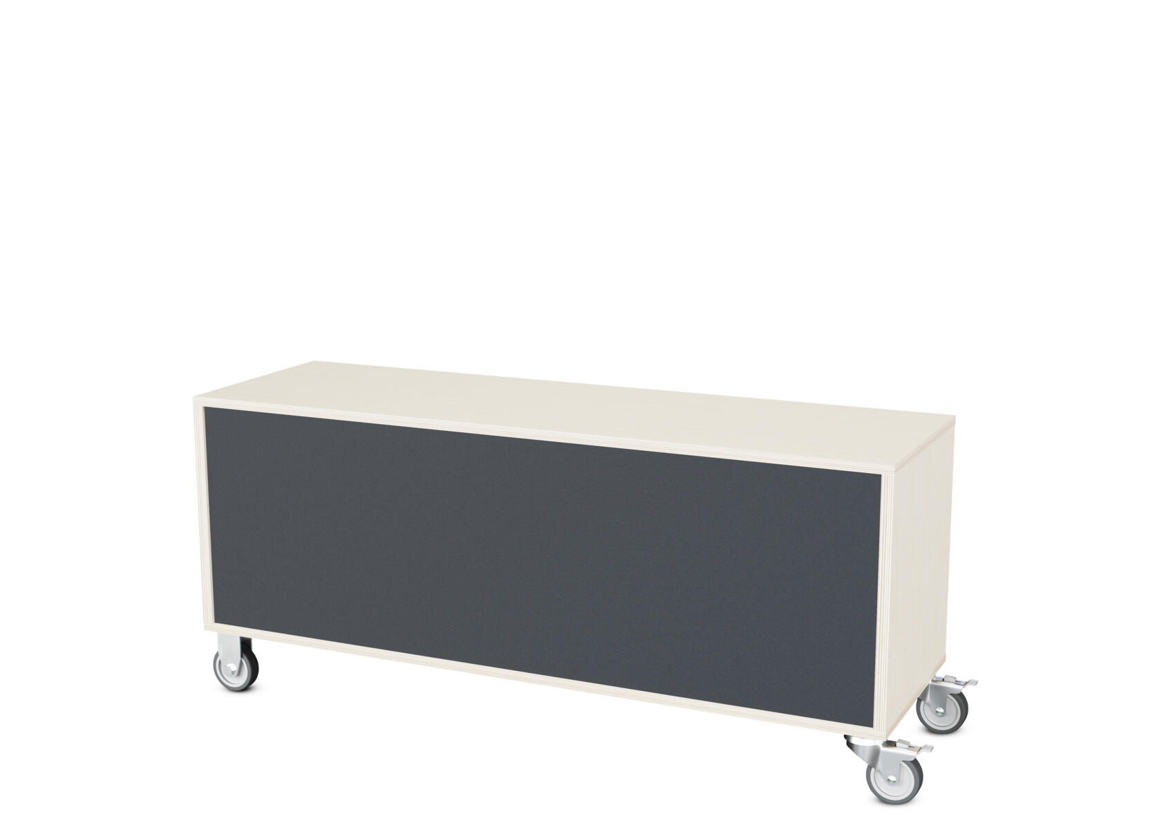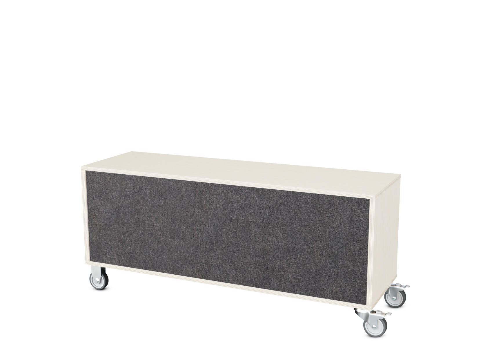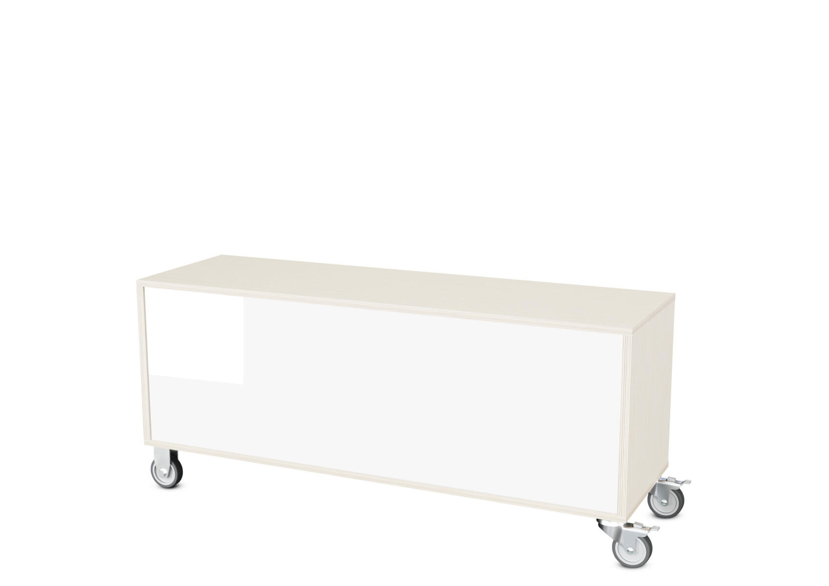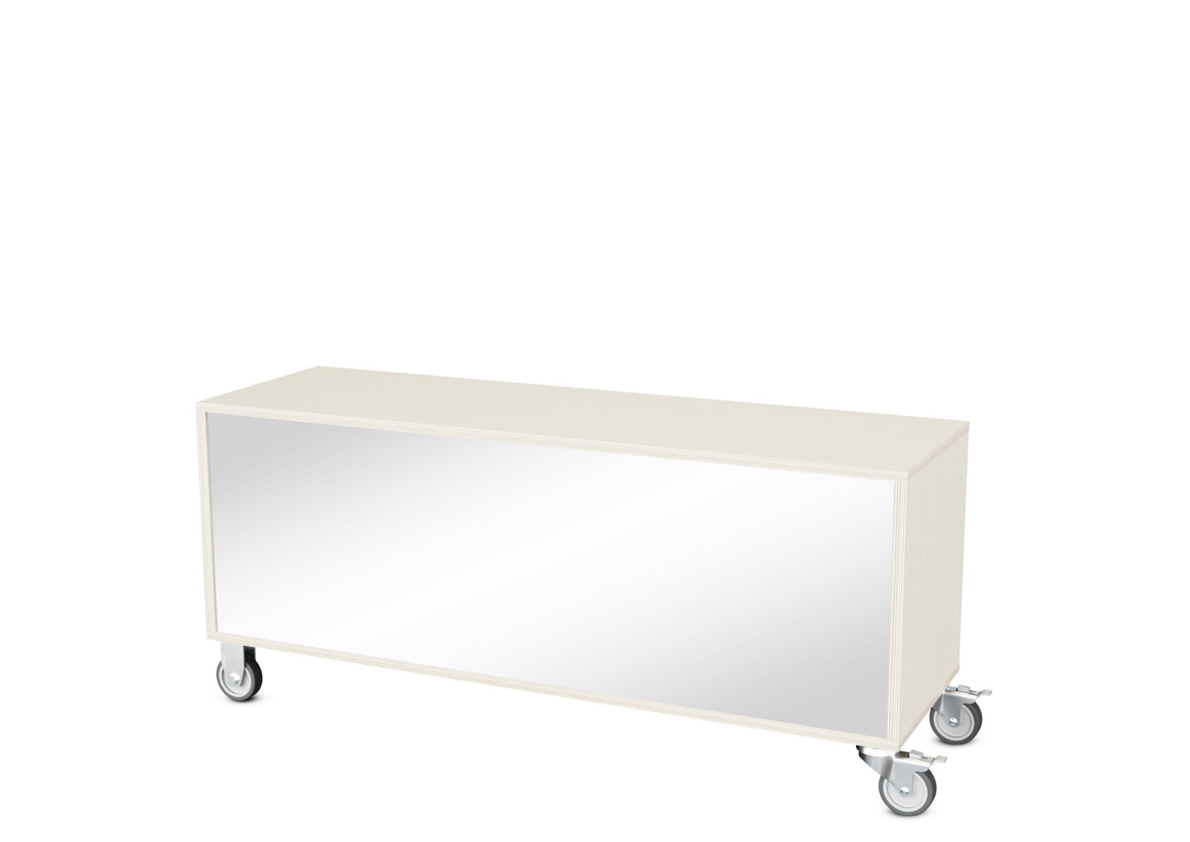 Säilytyskaluste, jossa valittavissa erilaisia taustavaihtoehtoja omaan tarpeeseen. Valmistettu koivuvanerista. Kiinteät hyllyt ja väliseinät. Varustettu neljällä pyörällä, joista kaksi on kiinteää ja kaksi lukittavaa kääntöpyörää.