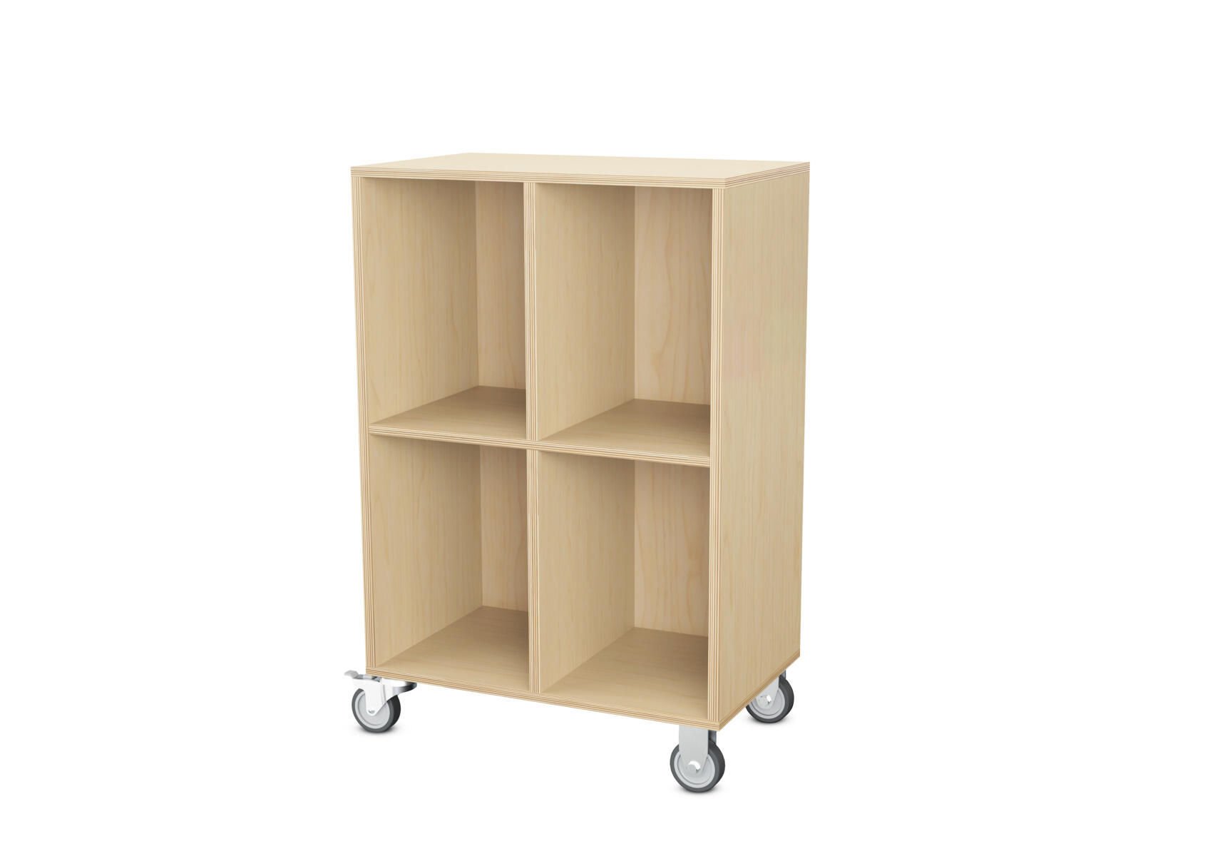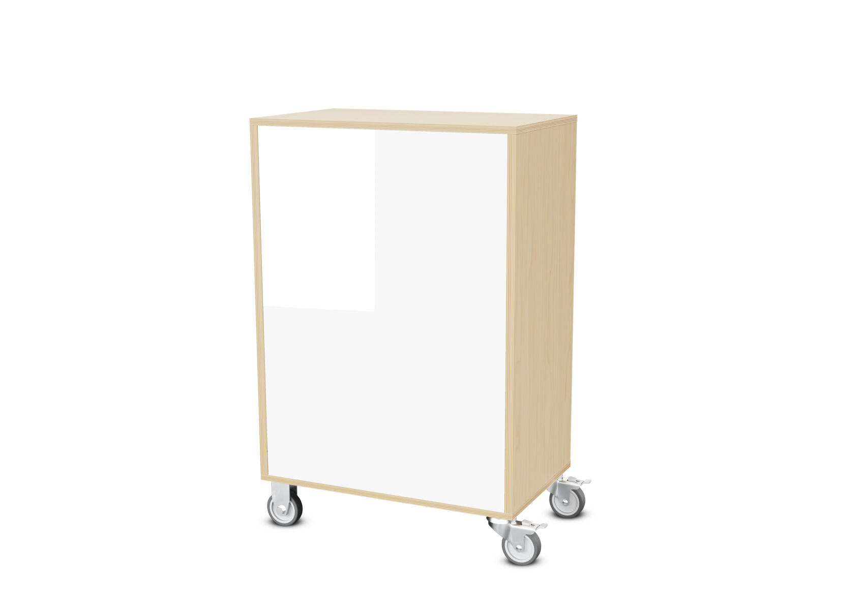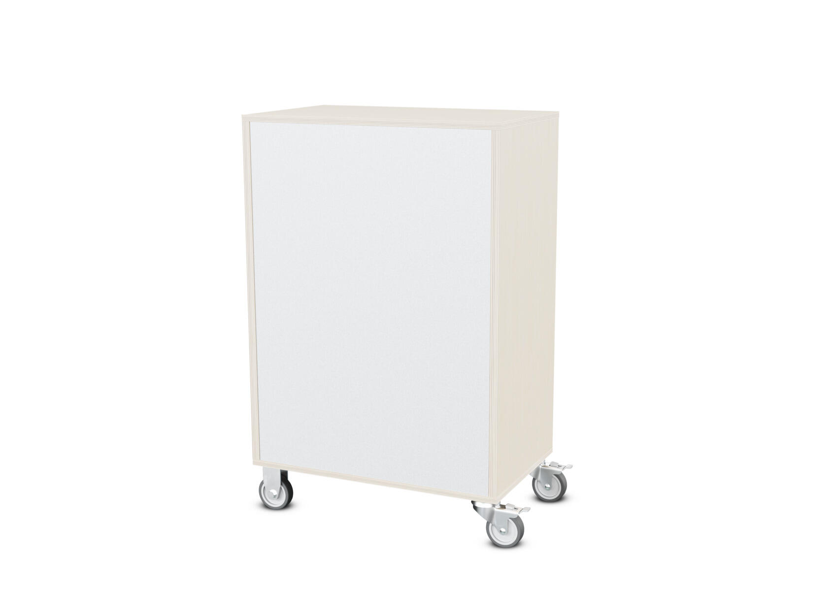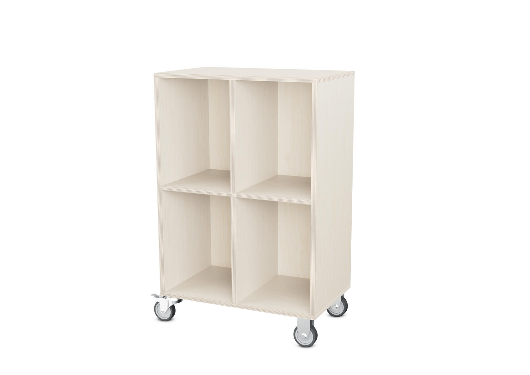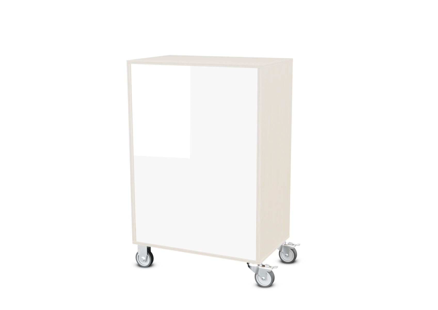 Säilytyskaluste, jossa valittavissa erilaisia taustavaihtoehtoja omaan tarpeeseen. Valmistettu koivuvanerista. Kiinteät hyllyt ja väliseinät. Varustettu neljällä pyörällä, joista kaksi on kiinteää ja kaksi lukittavaa kääntöpyörää.
