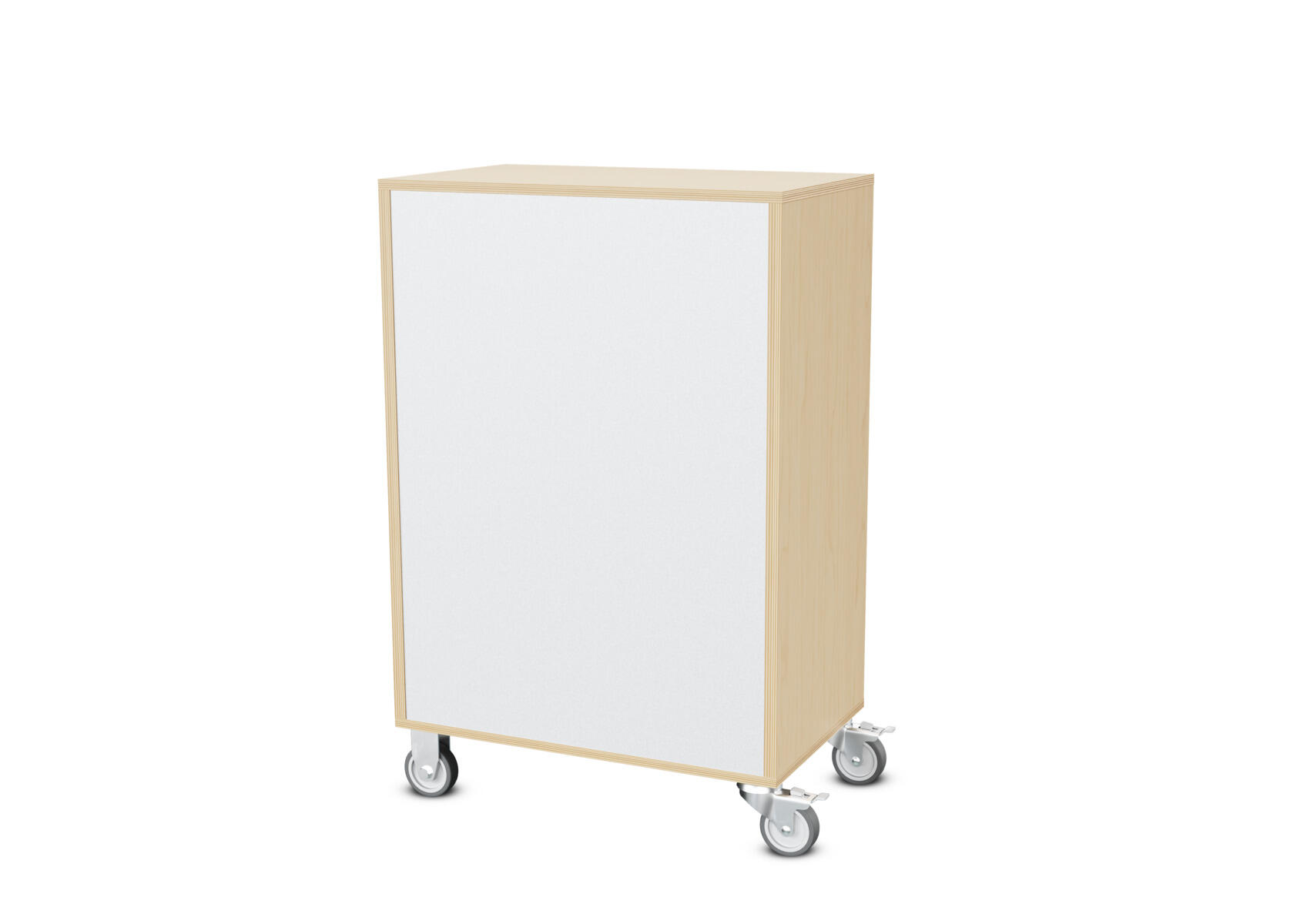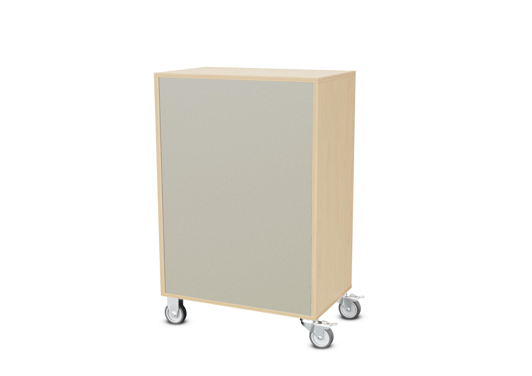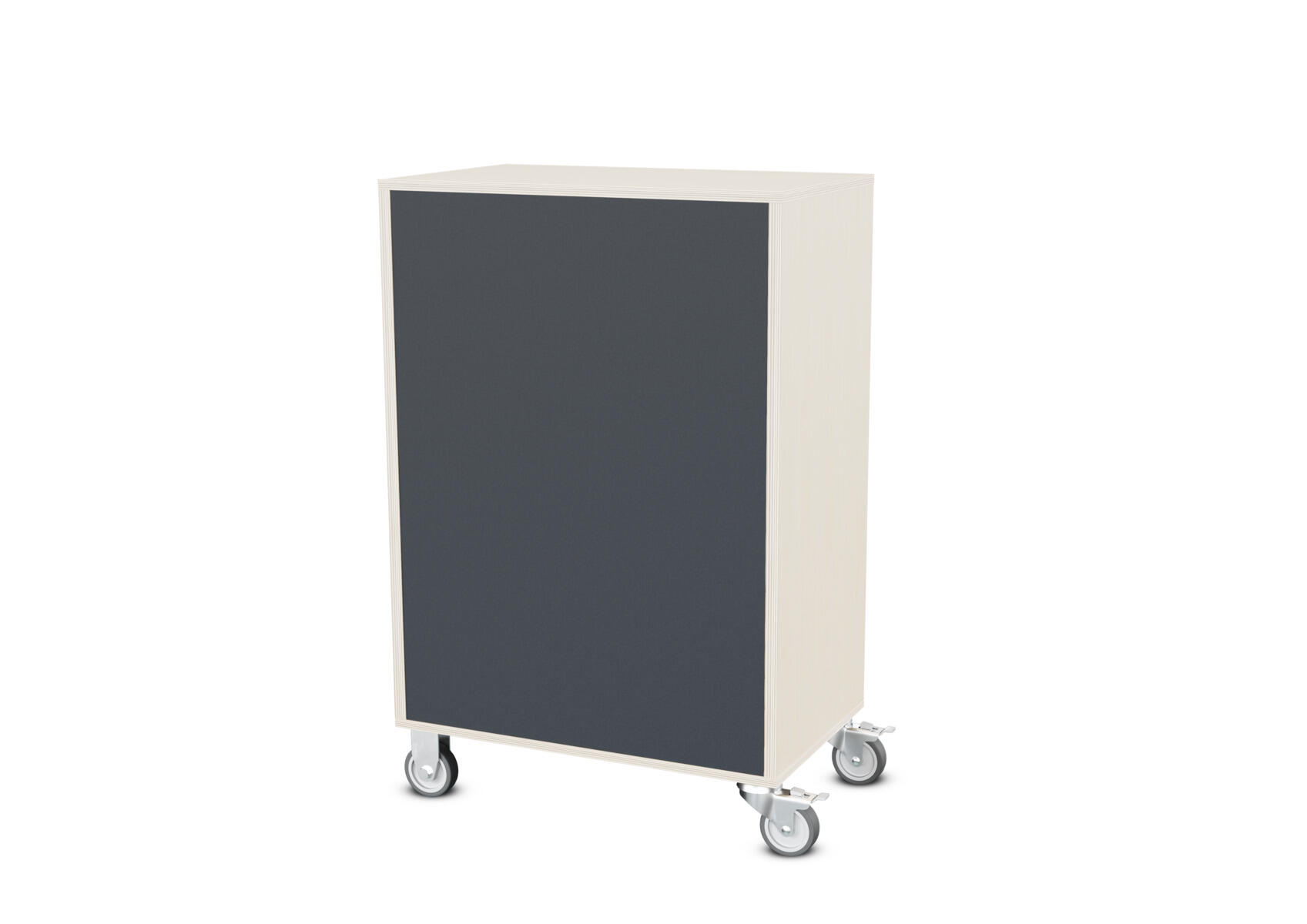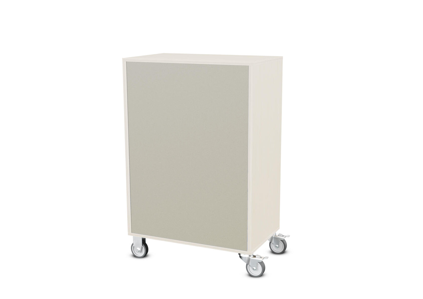 Säilytyskaluste, jossa valittavissa erilaisia taustavaihtoehtoja omaan tarpeeseen. Valmistettu koivuvanerista. Kiinteät hyllyt ja väliseinät. Varustettu neljällä pyörällä, joista kaksi on kiinteää ja kaksi lukittavaa kääntöpyörää.