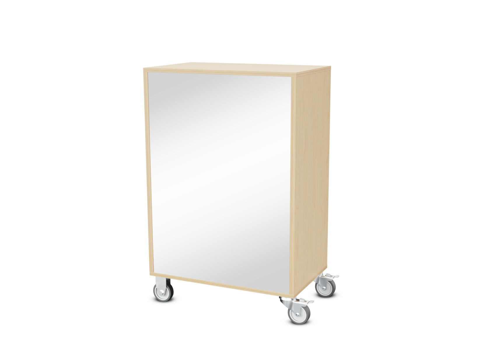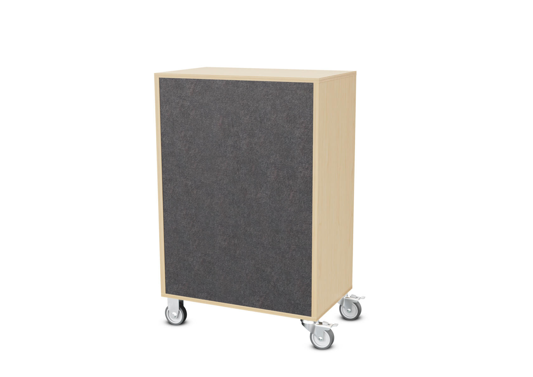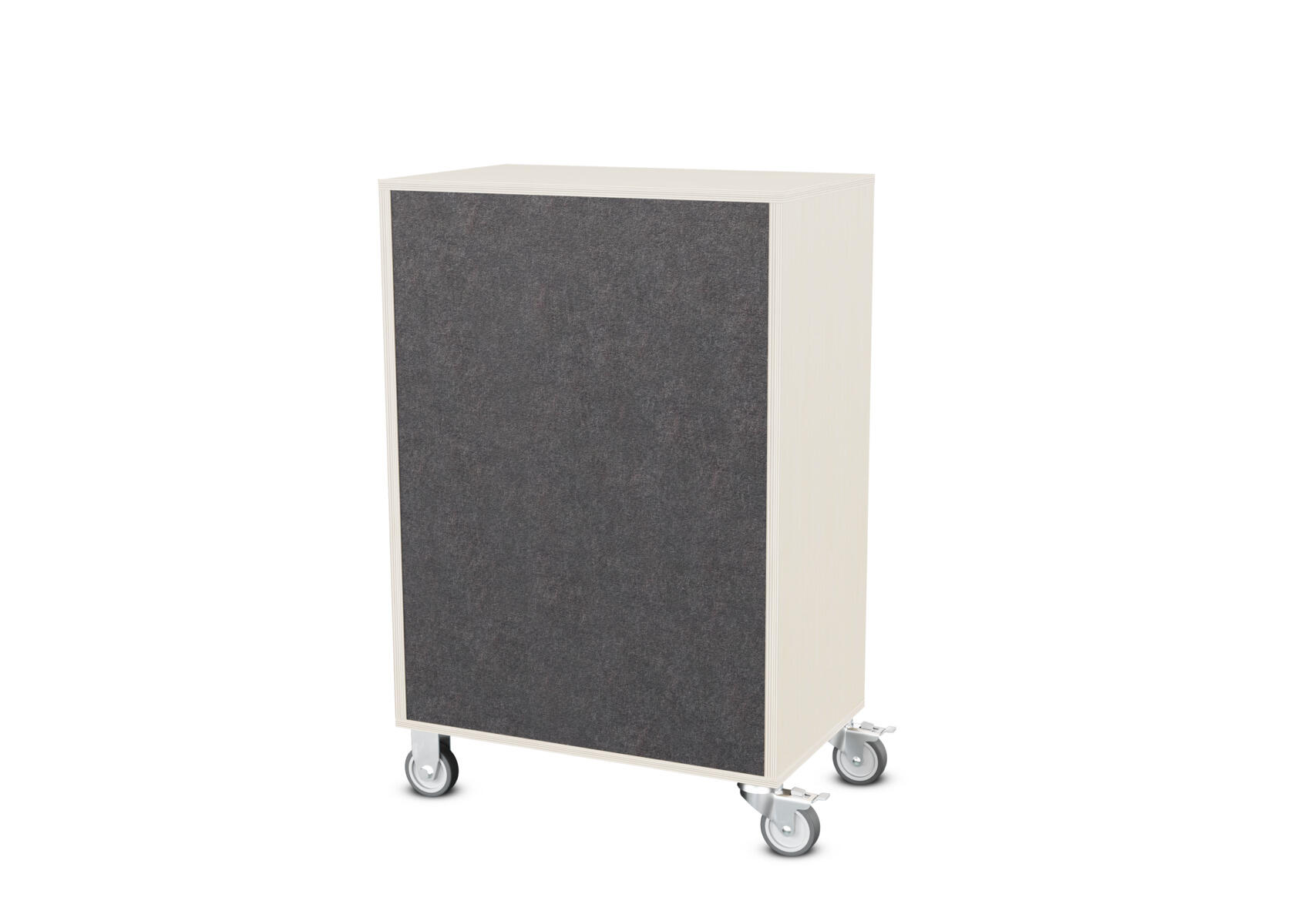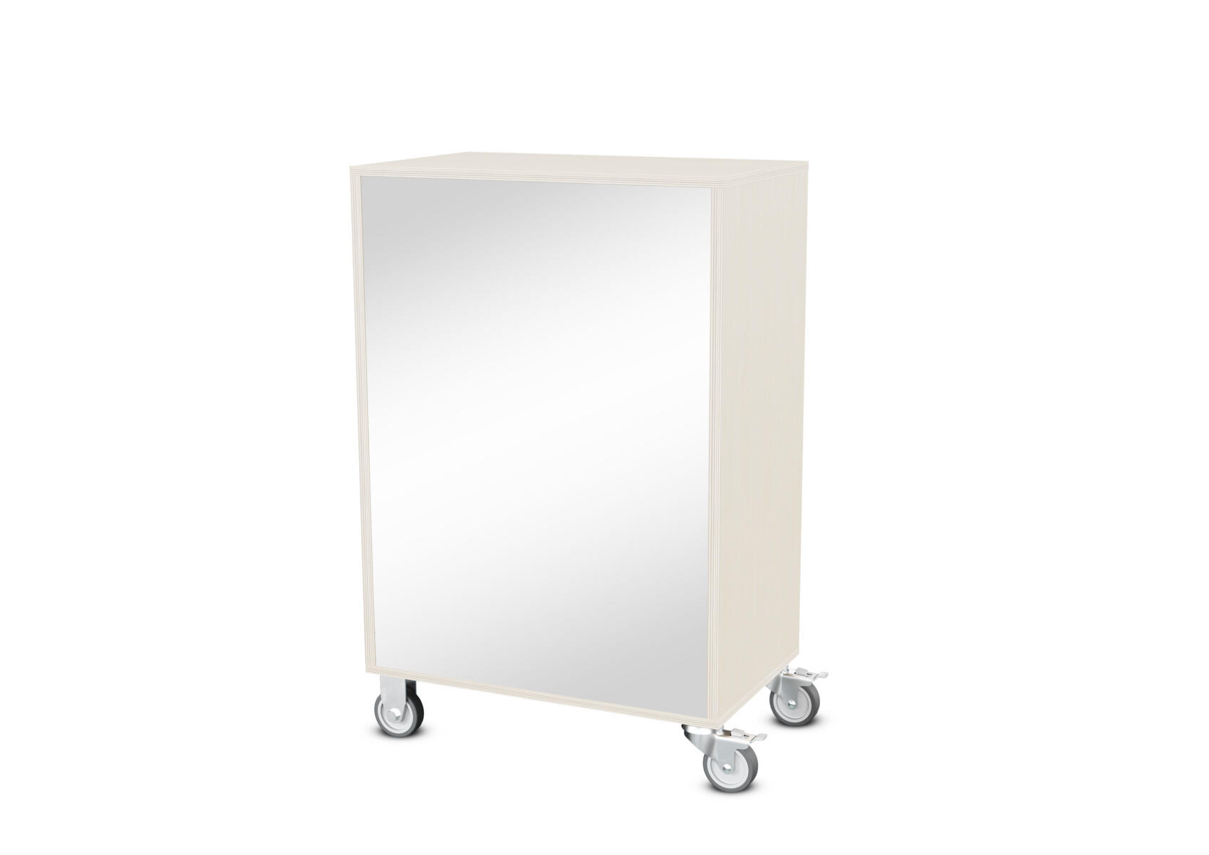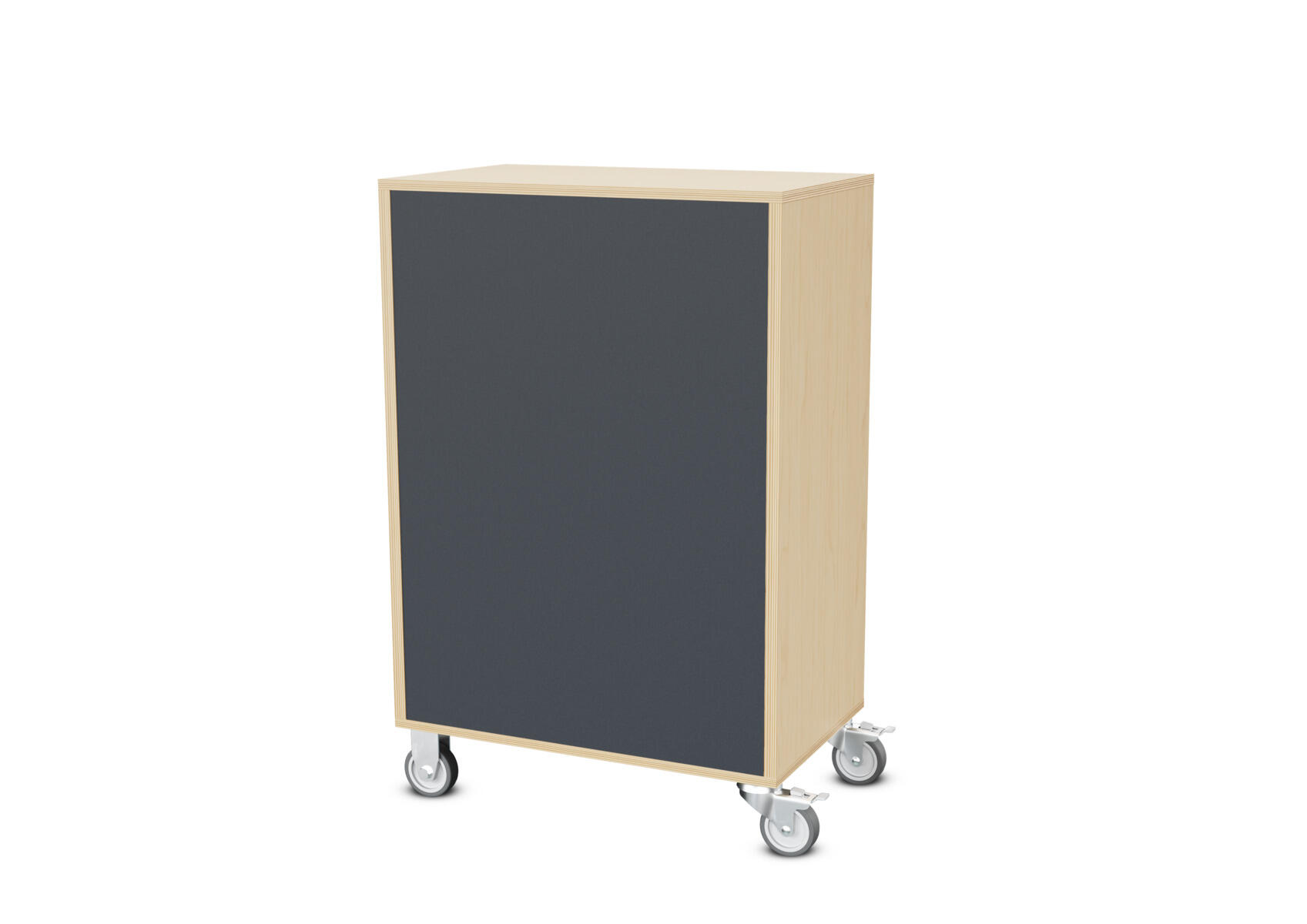 Säilytyskaluste, jossa valittavissa erilaisia taustavaihtoehtoja omaan tarpeeseen. Valmistettu koivuvanerista. Kiinteät hyllyt ja väliseinät. Varustettu neljällä pyörällä, joista kaksi on kiinteää ja kaksi lukittavaa kääntöpyörää.