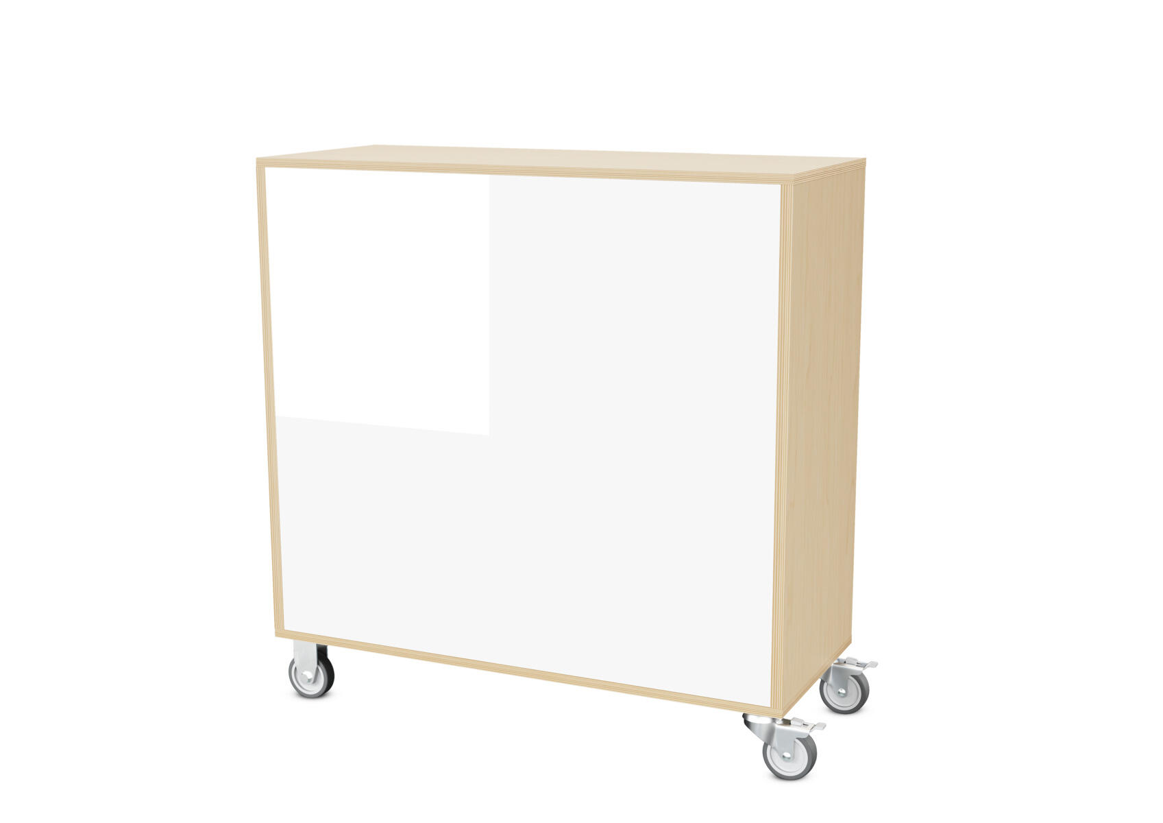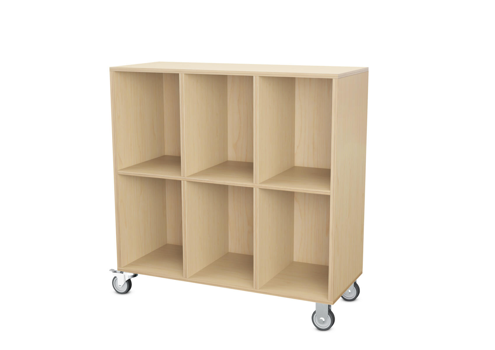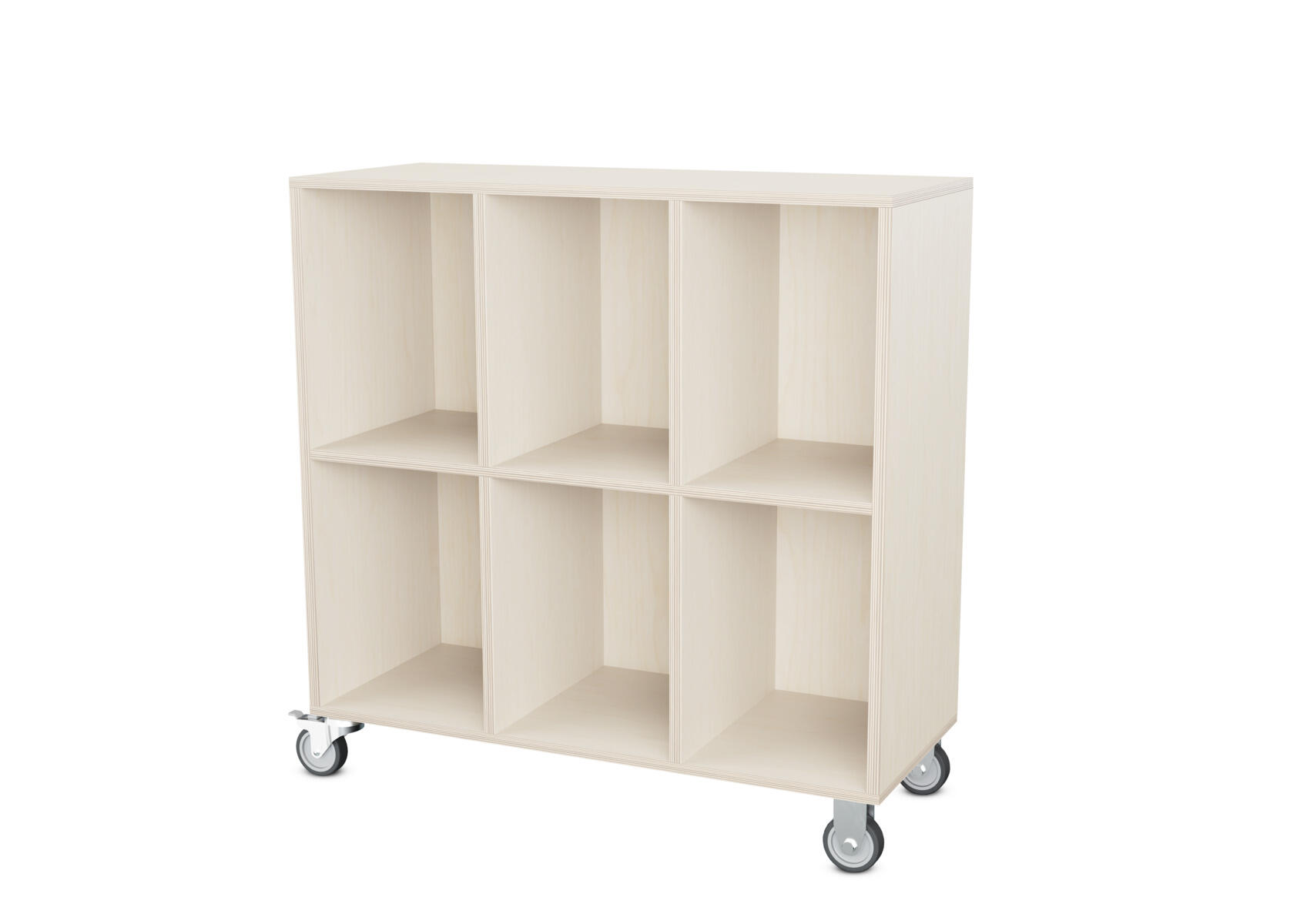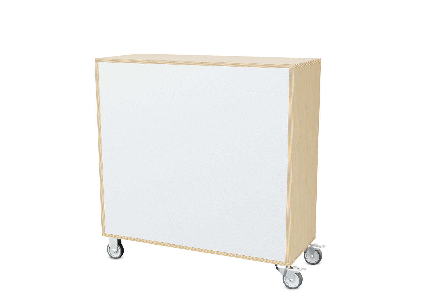 Säilytyskaluste, jossa valittavissa erilaisia taustavaihtoehtoja omaan tarpeeseen. Valmistettu koivuvanerista. Kiinteät hyllyt ja väliseinät. Varustettu neljällä pyörällä, joista kaksi on kiinteää ja kaksi lukittavaa kääntöpyörää.