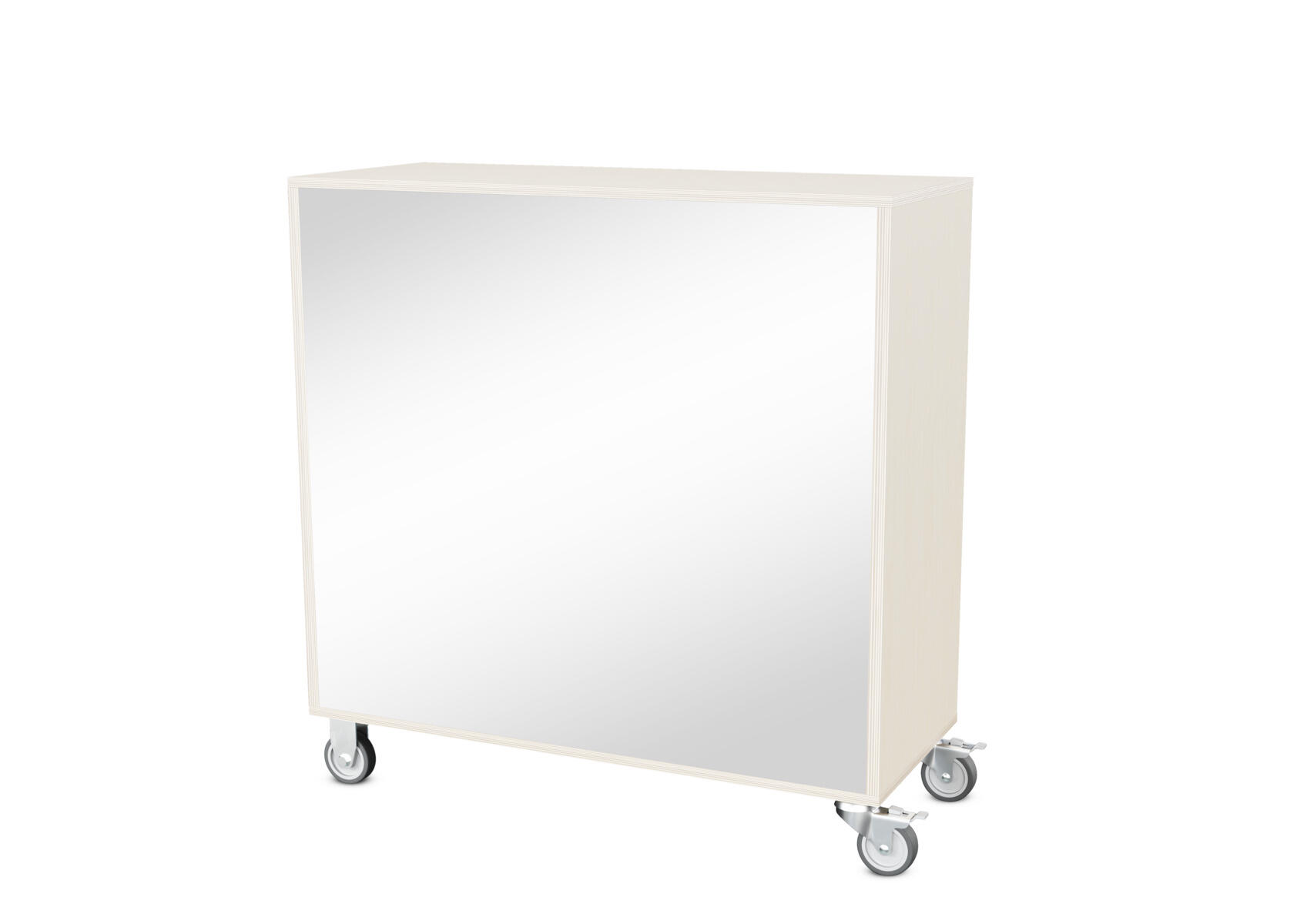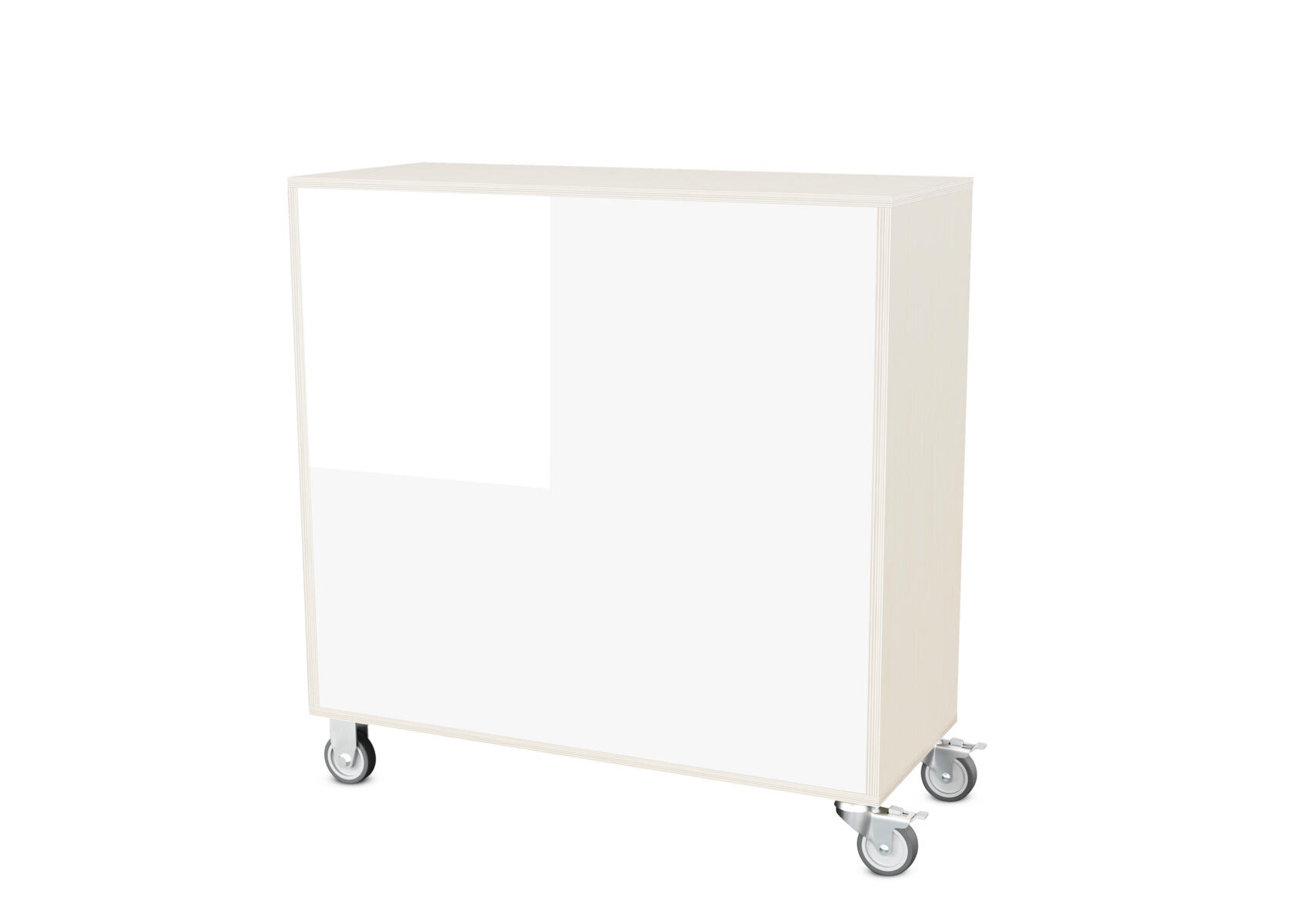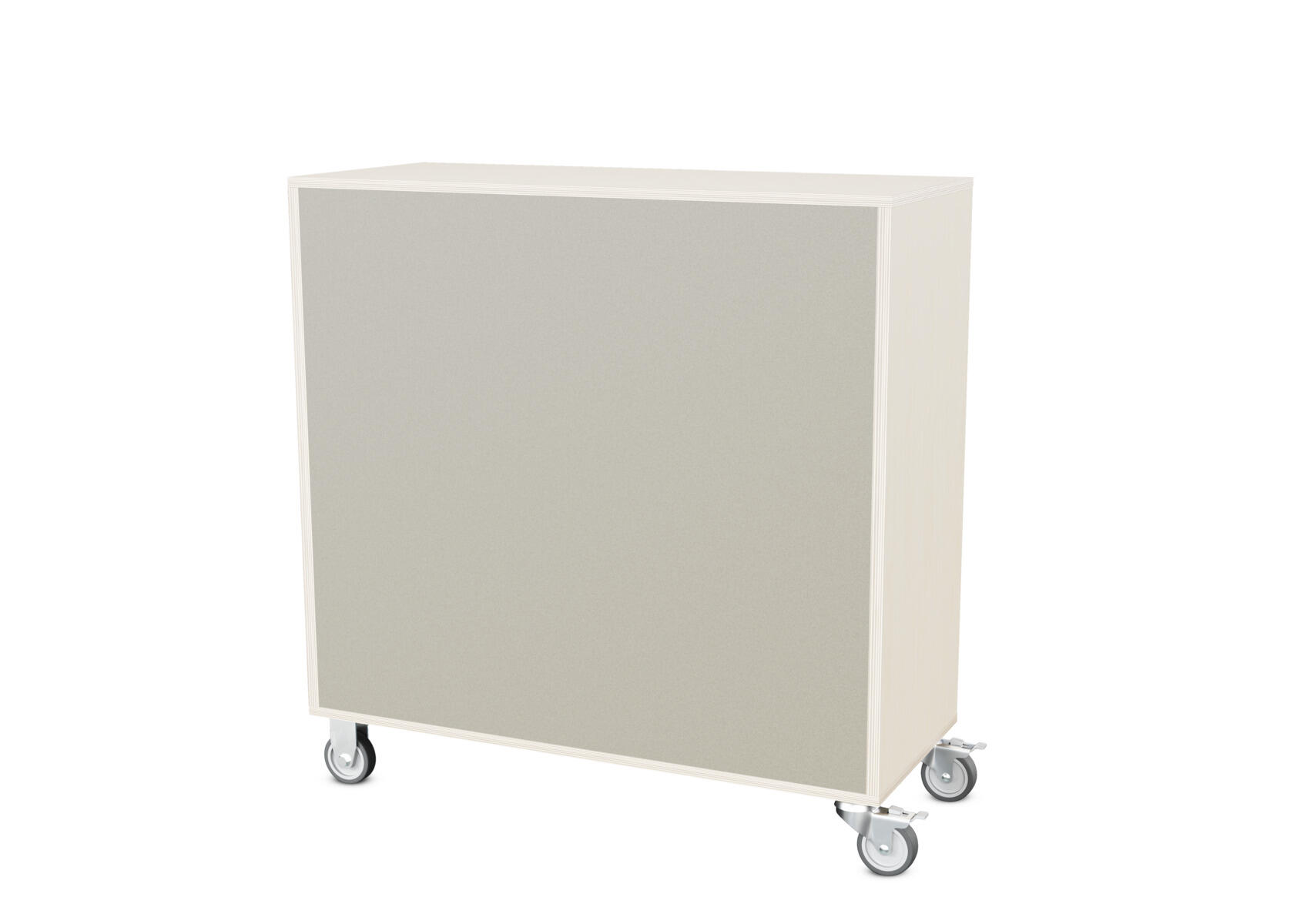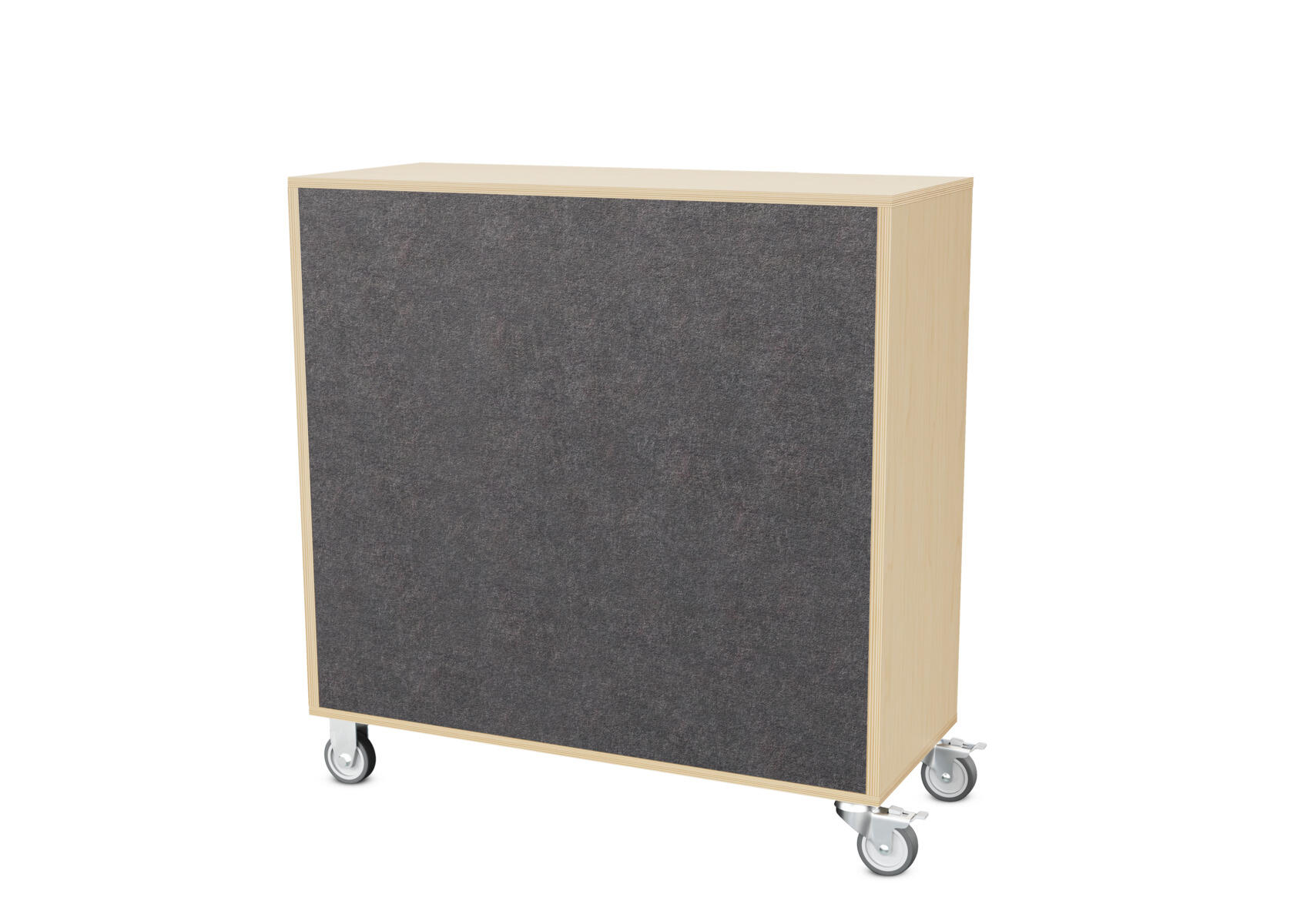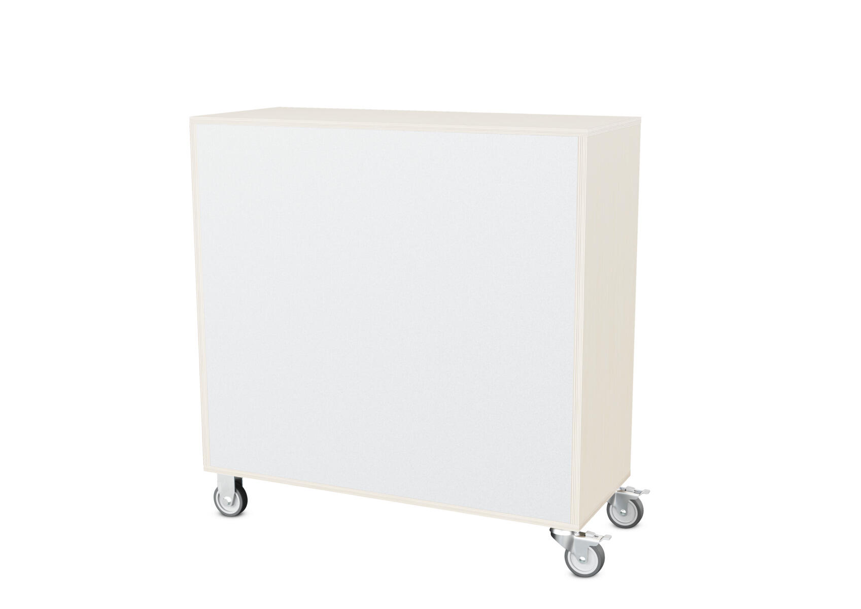 Säilytyskaluste, jossa valittavissa erilaisia taustavaihtoehtoja omaan tarpeeseen. Valmistettu koivuvanerista. Kiinteät hyllyt ja väliseinät. Varustettu neljällä pyörällä, joista kaksi on kiinteää ja kaksi lukittavaa kääntöpyörää.