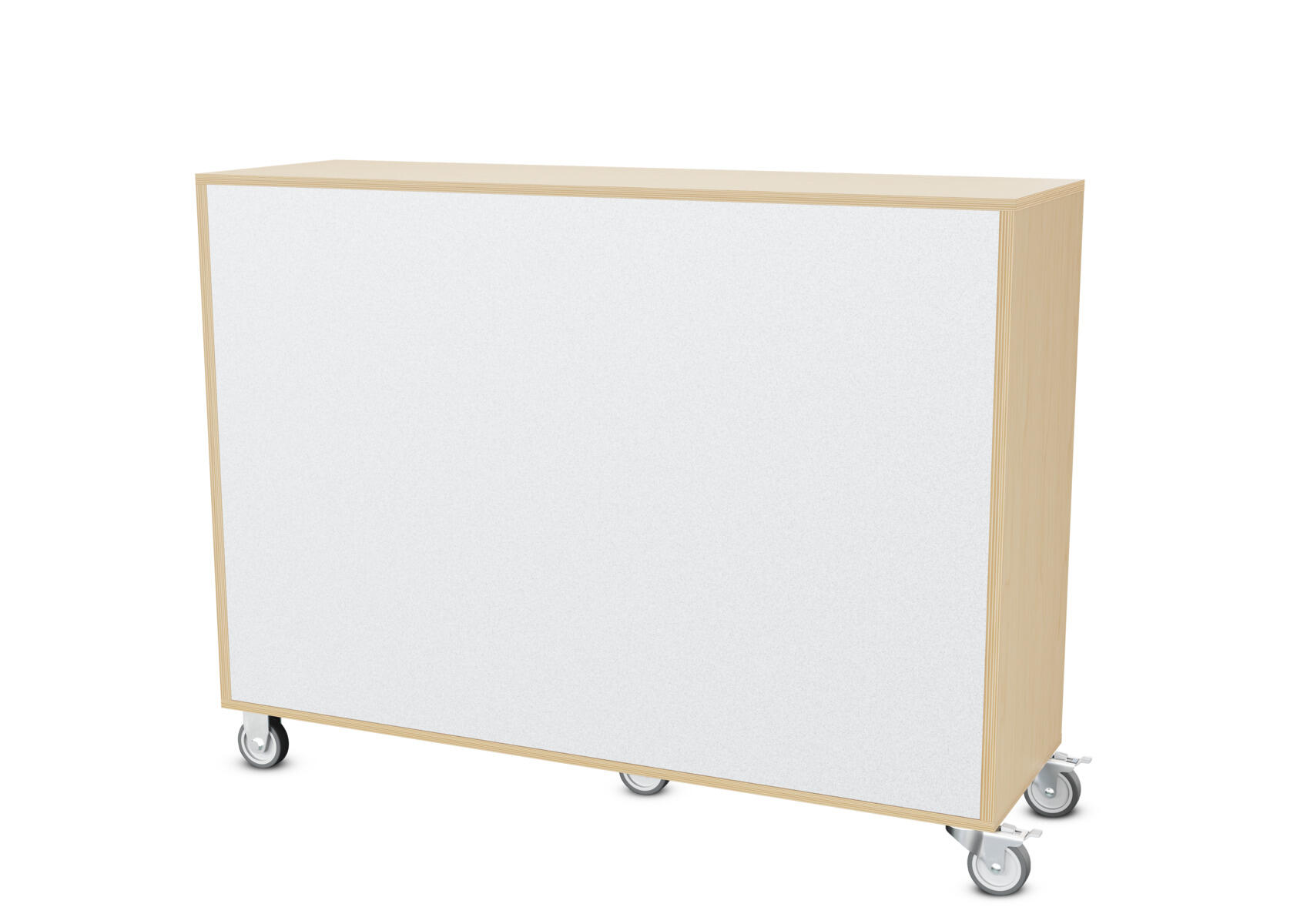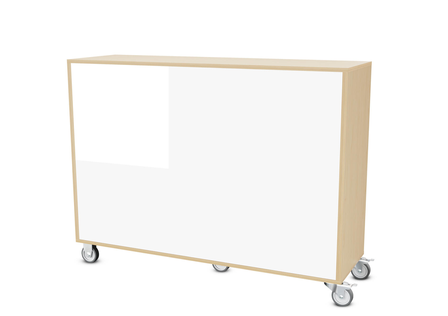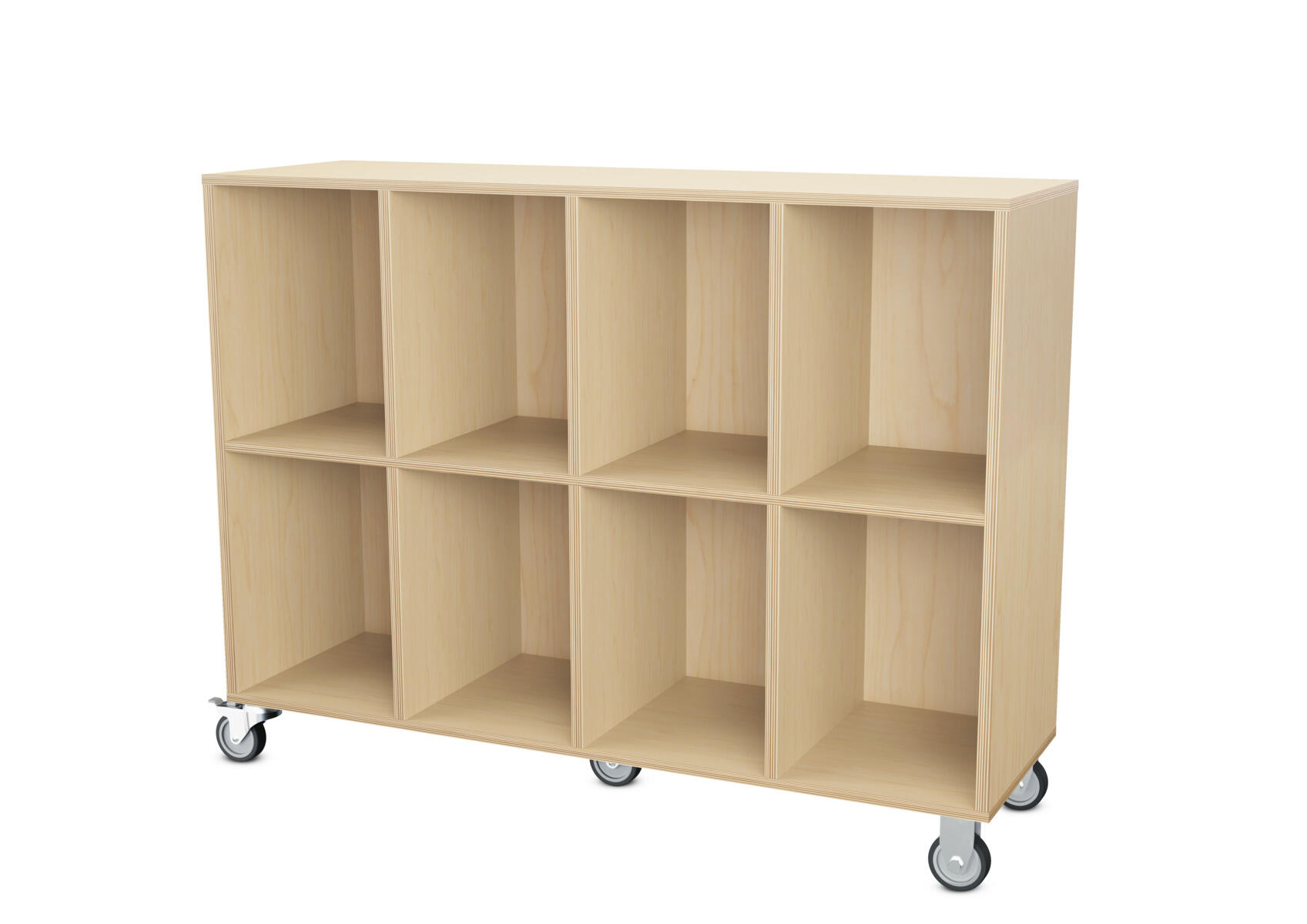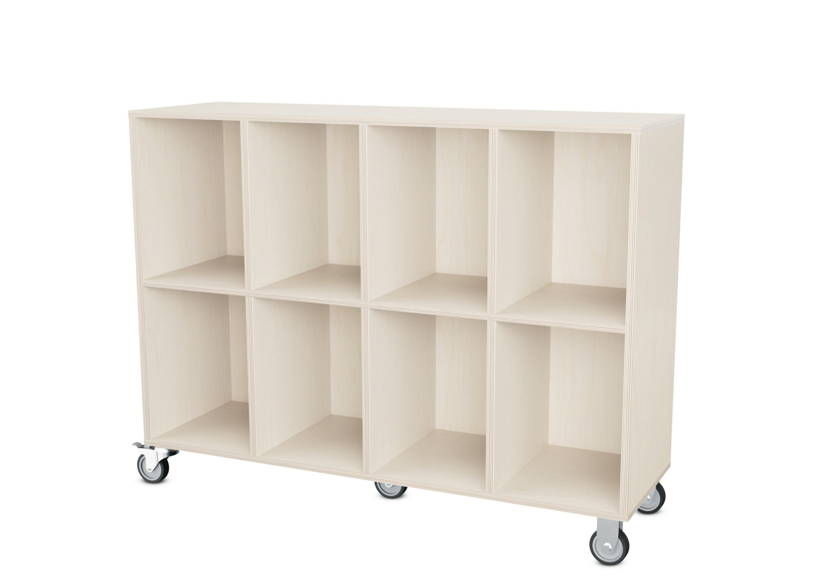 Säilytyskaluste, jossa valittavissa erilaisia taustavaihtoehtoja omaan tarpeeseen. Valmistettu koivuvanerista. Kiinteät hyllyt ja väliseinät. Varustettu neljällä pyörällä, joista kaksi on kiinteää ja kaksi lukittavaa kääntöpyörää.
