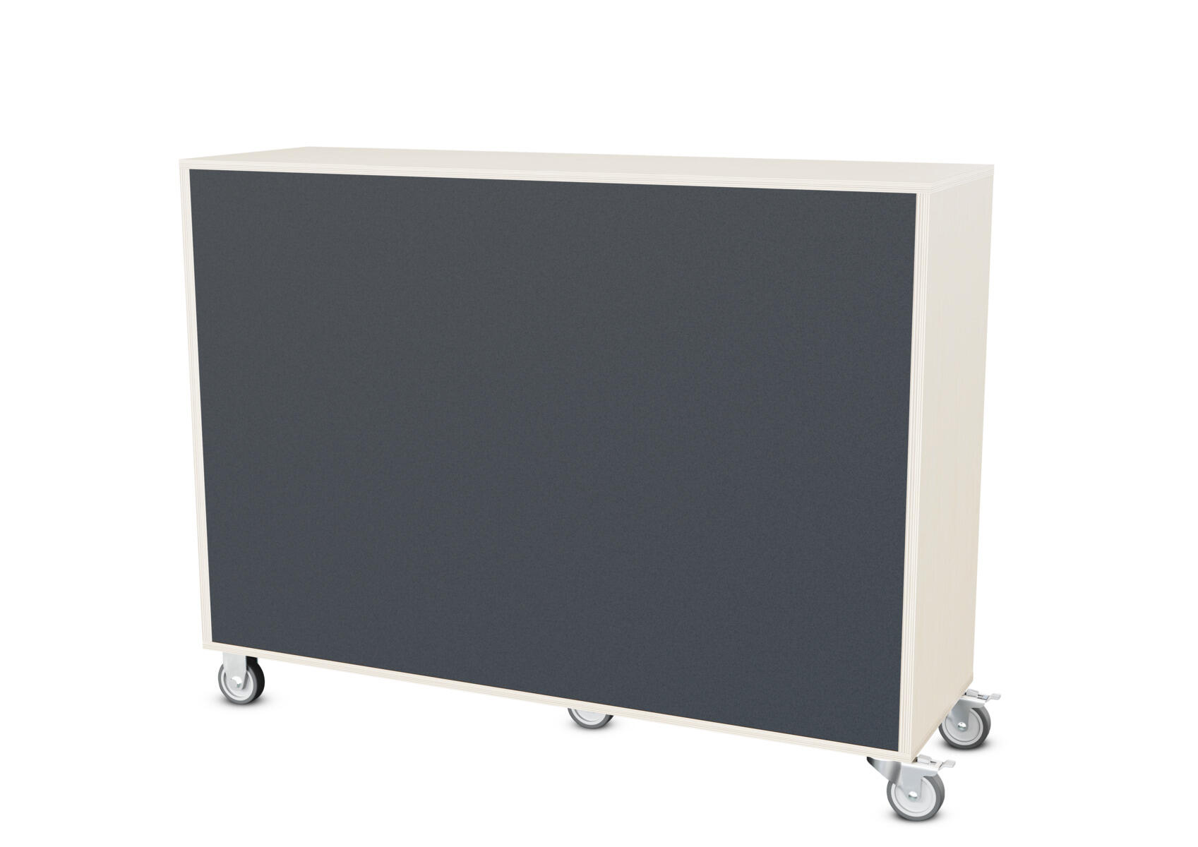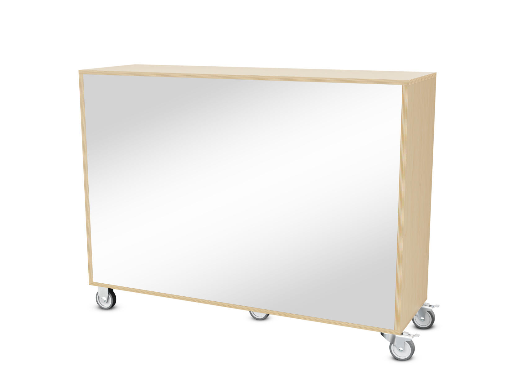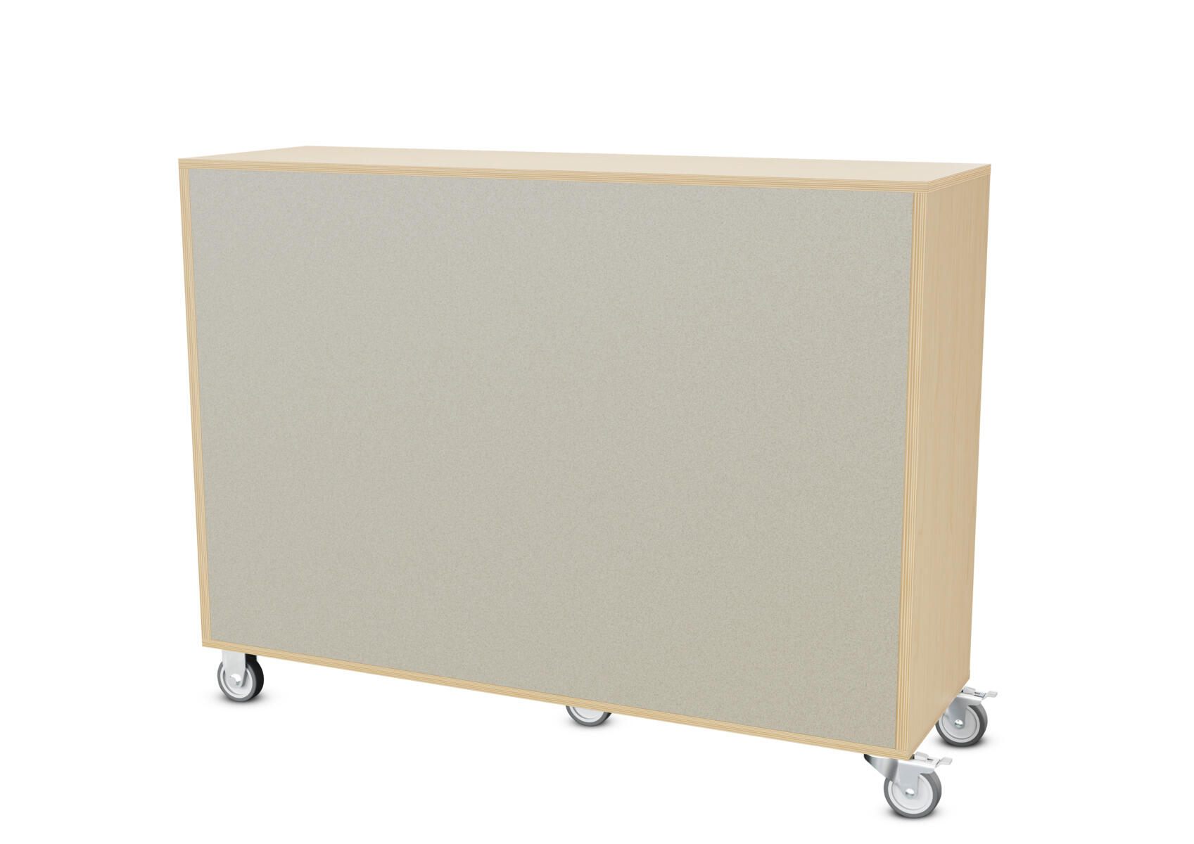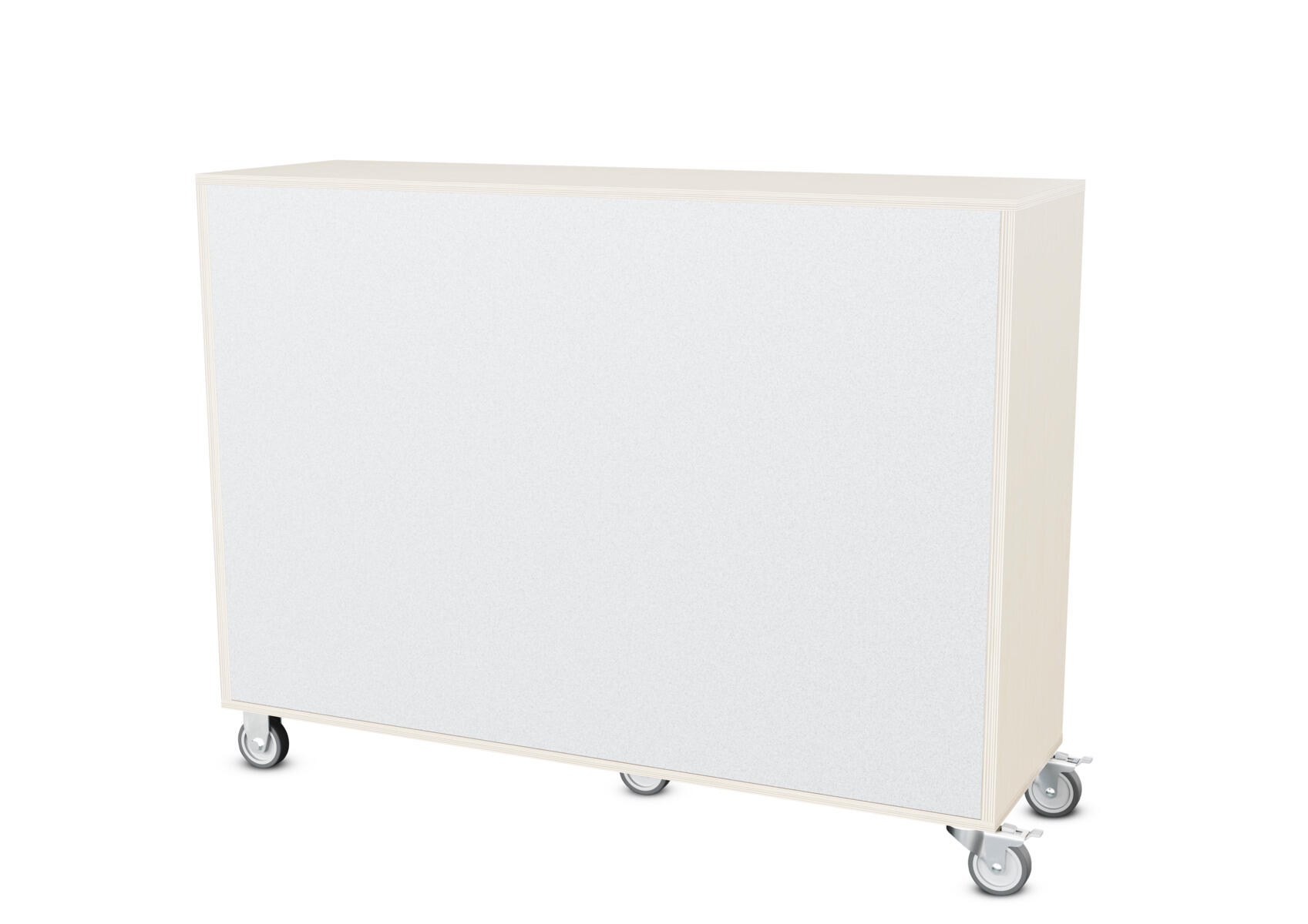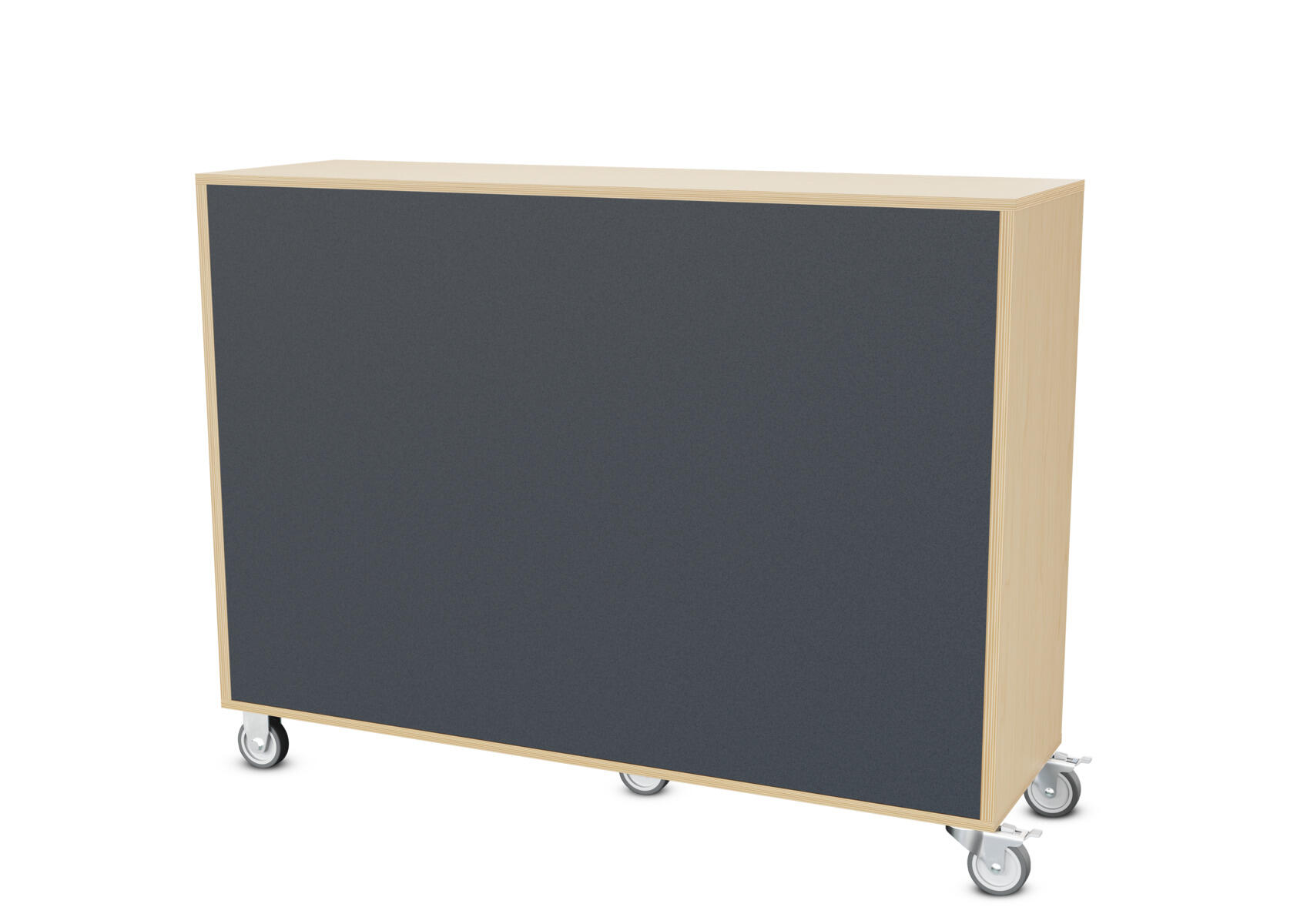 Säilytyskaluste, jossa valittavissa erilaisia taustavaihtoehtoja omaan tarpeeseen. Valmistettu koivuvanerista. Kiinteät hyllyt ja väliseinät. Varustettu neljällä pyörällä, joista kaksi on kiinteää ja kaksi lukittavaa kääntöpyörää.
