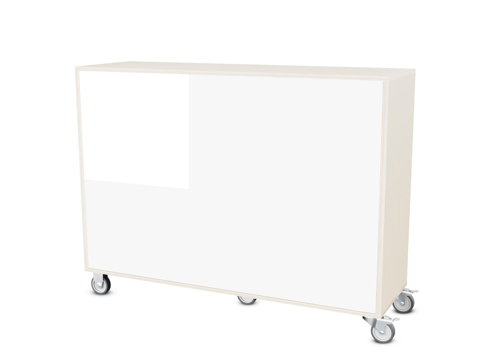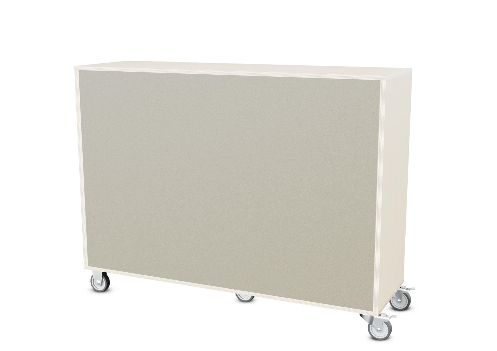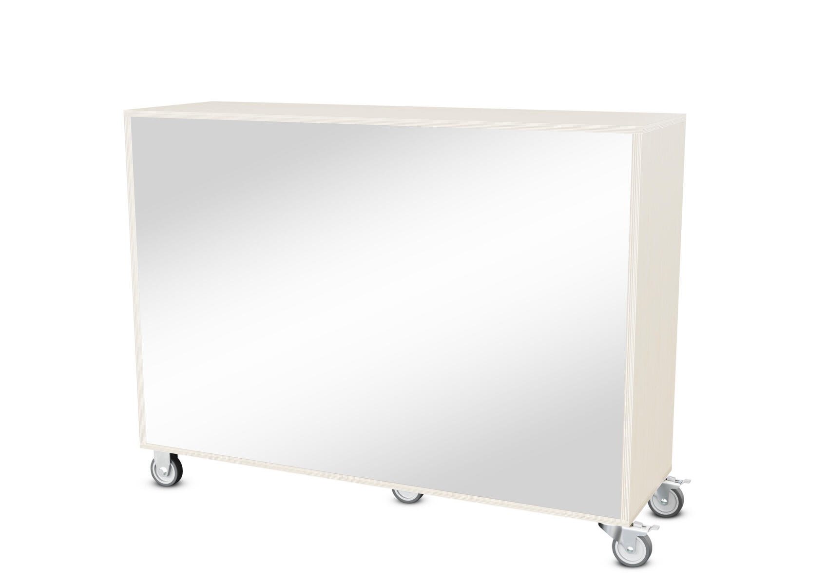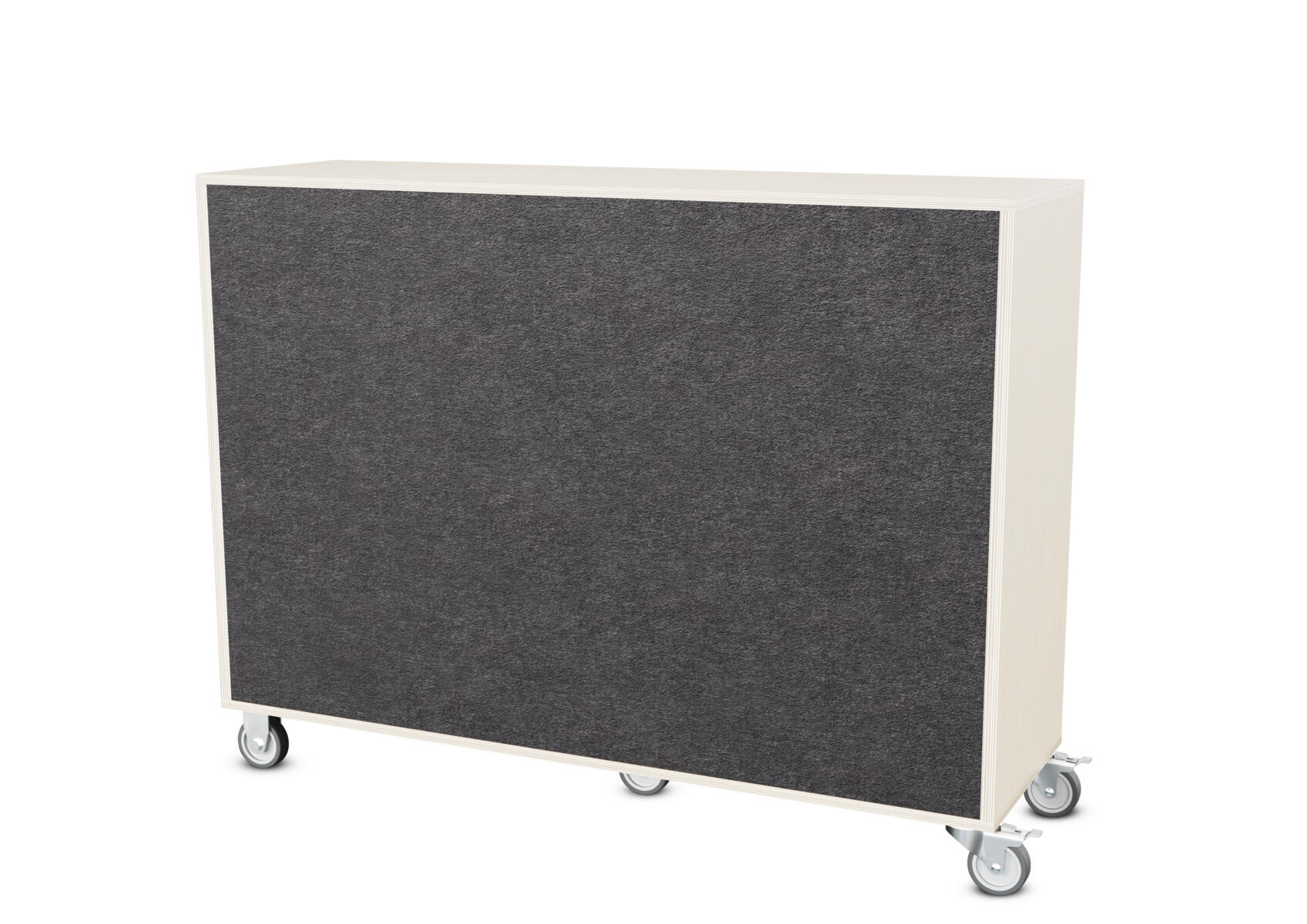 Säilytyskaluste, jossa valittavissa erilaisia taustavaihtoehtoja omaan tarpeeseen. Valmistettu koivuvanerista. Kiinteät hyllyt ja väliseinät. Varustettu neljällä pyörällä, joista kaksi on kiinteää ja kaksi lukittavaa kääntöpyörää.