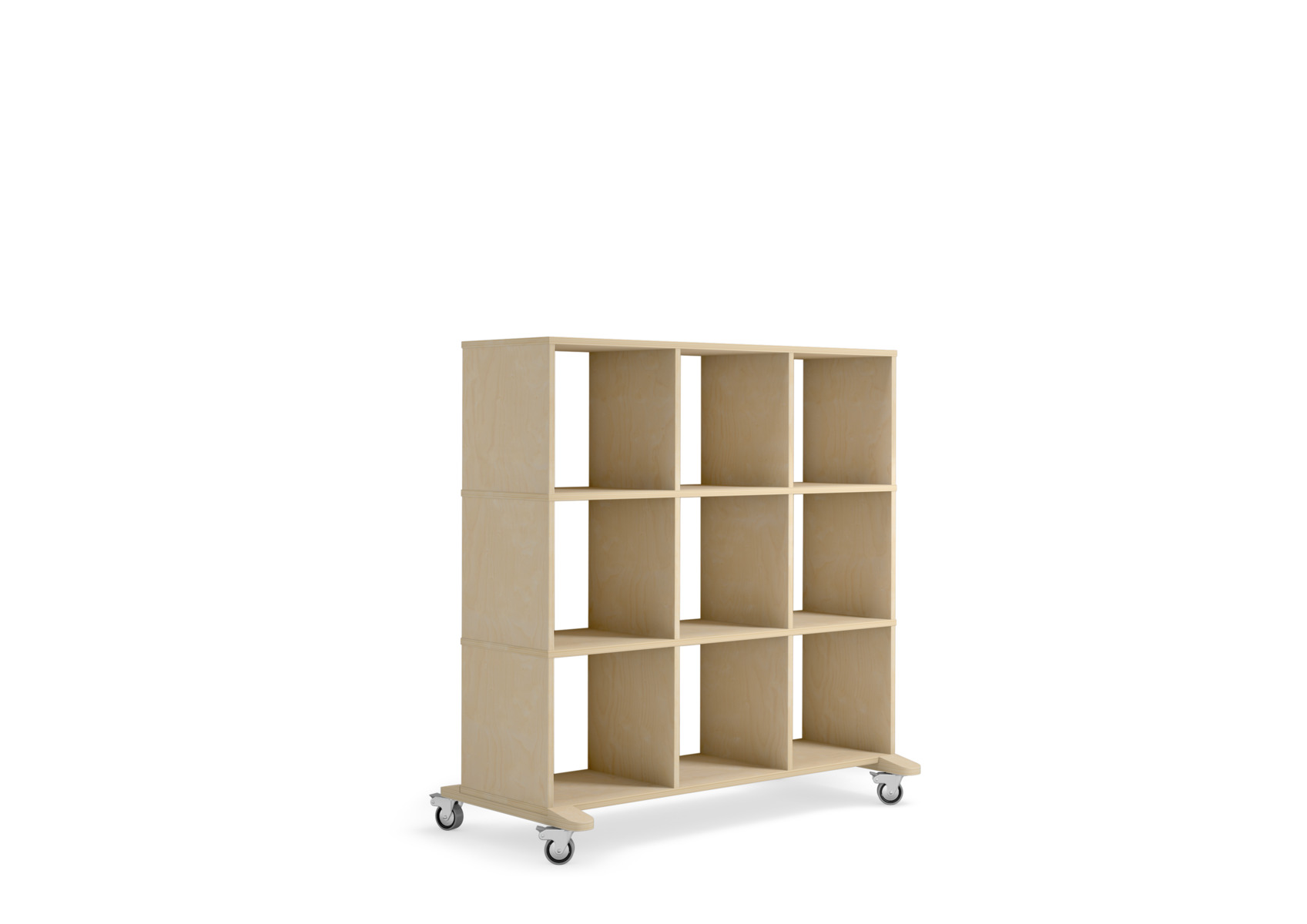 Valmistettu laadukkaasta koivuvanerista. Toimitetaan koottuna, mukana pyörät, asennettava. Neljästä pyörästä kaksi on kääntyviä ja lukittavia. Toiseen päätyyn asennetaan kiinteät pyörät, jotta säilyttimen siirtäminen olisi vakaata. Säilytintä ei tule siirtää lasten toimesta. Kun säilytintä ei liikuteta, lukitse pyörät niin, että etupyörät osoittavat eteenpäin ja takapyörät taaksepäin. Jos hyllyä käytetään vapaasti seisovana tilanjakajana, suosittelemme hankkimaan lisävarusteena tukijalat (tuotenumero 82788). Lisäksi suosittelemme, että siirrettävät hyllyt, joiden korkeus on yli 80 cm, sijoitetaan seinää vasten. Lisävarusteena saatavissa säilytyslaatikoita ja koreja.