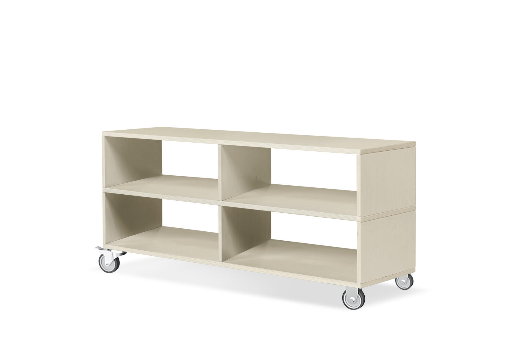 Matala säilytyshylly, valmistettu korkealaatuisesta koivuvanerista. Lokeroiden mitat: leveys 57,3 cm, korkeus 20 cm. Kannen korkeapainelaminaattipinnan väri valittavissa. Kuultovalkoinen on kauttaaltaan koivuvaneria. Varustettu 4 pyörällä, joista 2 on vapaasti pyörivää ja 2 kiinteää, lukittavaa.