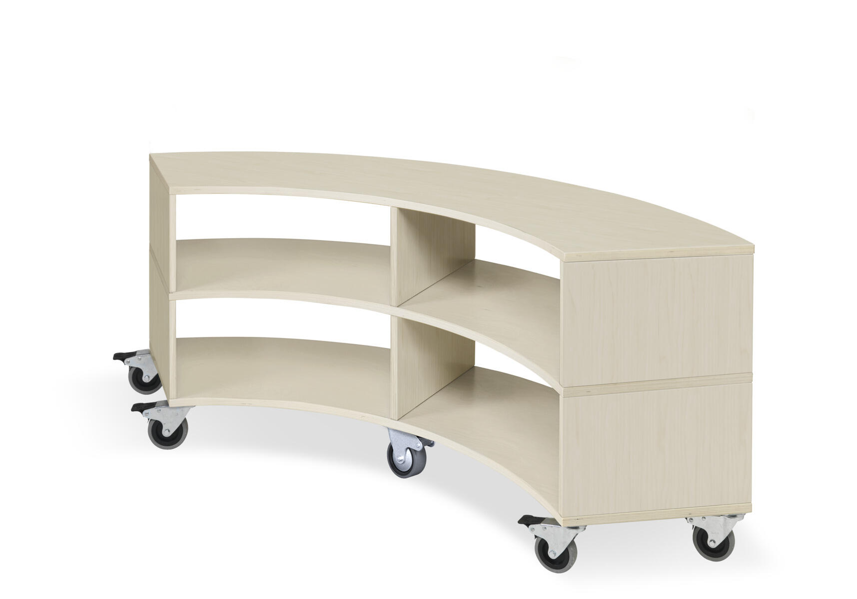Kaareva säilytyshylly, valmistettu korkealaatuisesta koivuvanerista. Ulkosäde 106 cm, sisäsäde 68,5 cm. Kannen korkeapainelaminaattipinnan väri valittavissa. Kuultovalkoinen on kauttaaltaan koivuvaneria. Varustettu viidellä vapaasti pyörivällä, lukittavalla pyörällä.