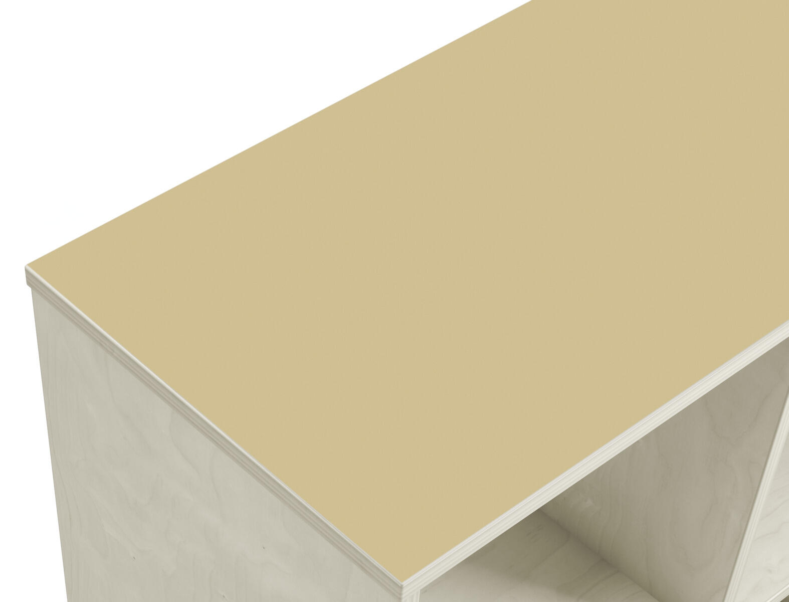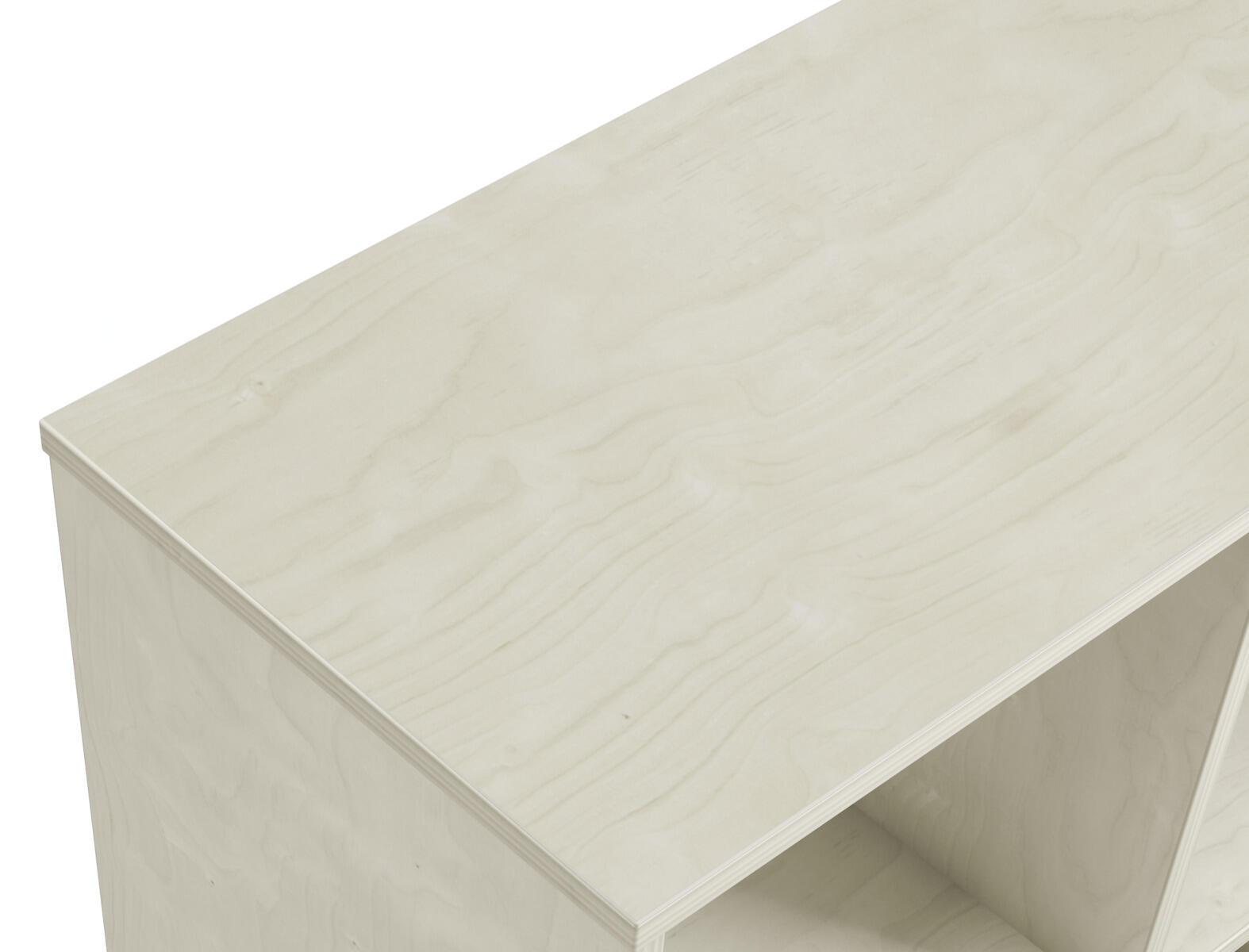 Matala säilytyshylly, valmistettu korkealaatuisesta koivuvanerista. Lokeroiden mitat: leveys 57,3 cm, korkeus 20 cm. Kannen korkeapainelaminaattipinnan väri valittavissa. Kuultovalkoinen on kauttaaltaan koivuvaneria. Varustettu 4 pyörällä, joista 2 on vapaasti pyörivää ja 2 kiinteää, lukittavaa.
