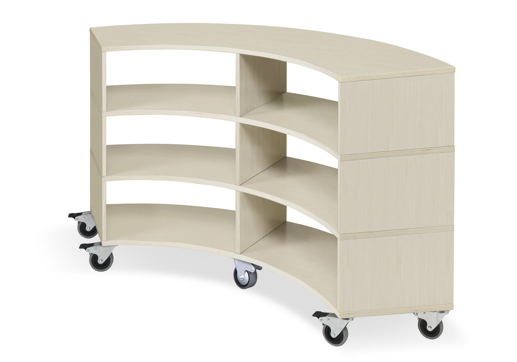 Kaareva säilytyshylly, valmistettu korkealaatuisesta koivuvanerista. Ulkosäde 106 cm, sisäsäde 68,5 cm. Kannen korkeapainelaminaattipinnan väri valittavissa. Kuultovalkoinen on kauttaaltaan koivuvaneria. Varustettu viidellä vapaasti pyörivällä, lukittavalla pyörällä.