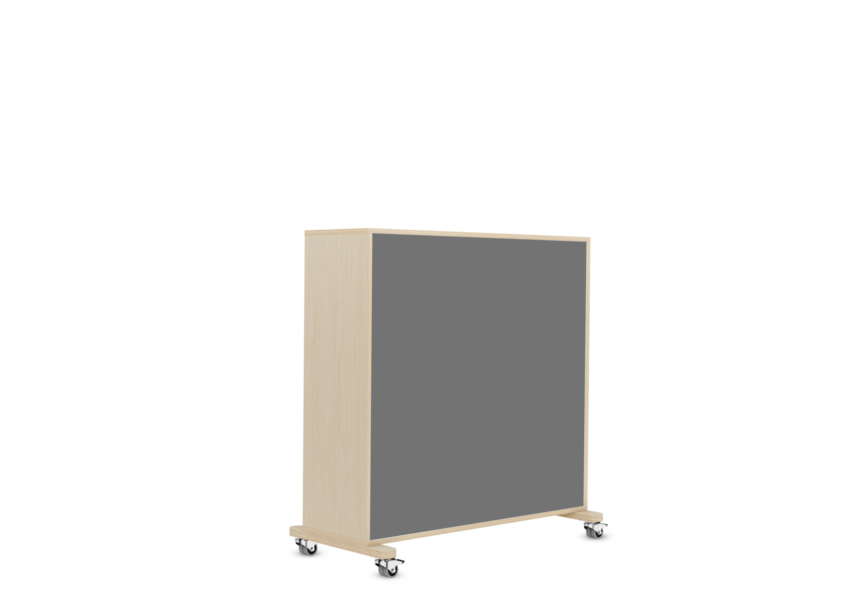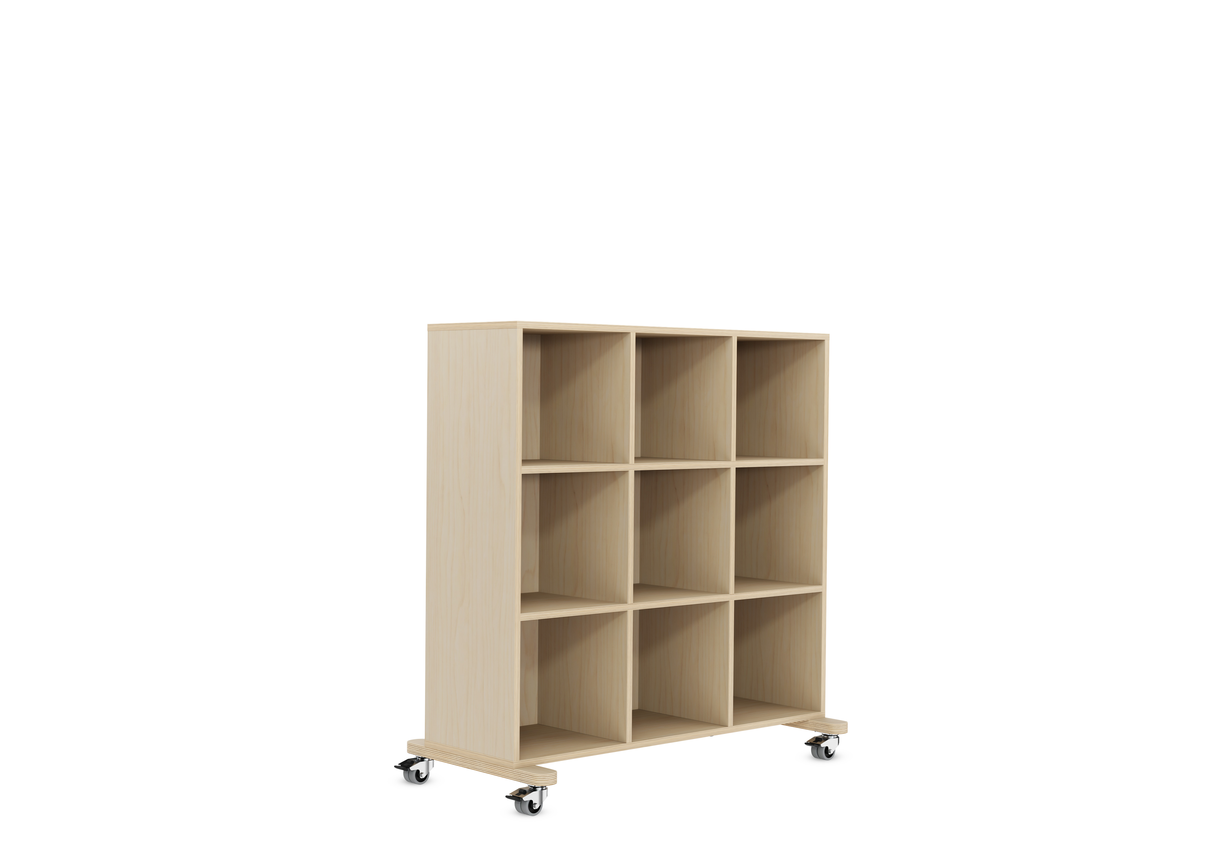 Valmistettu laadukkaasta koivuvanerista, tausta ilmoitustaulu. Toimitetaan koottuna, mukana pyörät, asennettava. 2 kiinteää pyörää toisessa päädyssä ja 2 liikkuvaa lukittavilla pyörillä toisessa päädyssä. Säilytintä ei tule siirtää lasten toimesta. Kun säilytintä ei liikuteta, lukitse pyörät niin, että etupyörät osoittavat eteenpäin ja takapyörät taaksepäin. Jos hyllyä käytetään vapaasti seisovana tilanjakajana, suosittelemme hankkimaan lisävarusteena tukijalat (tuotenumero 82788). Lisäksi suosittelemme, että siirrettävät hyllyt, joiden korkeus on yli 80 cm, sijoitetaan seinää vasten. Värivalinta koskee kannen korkeapainelaminaattipintaa. Koivunvärinen kansi on vaneria.