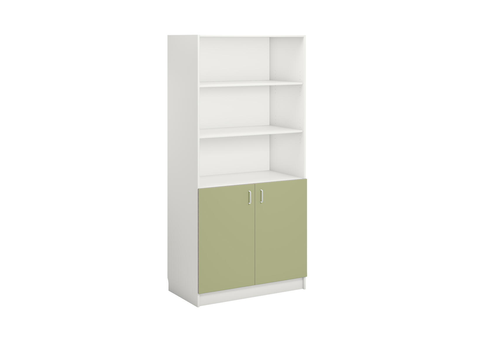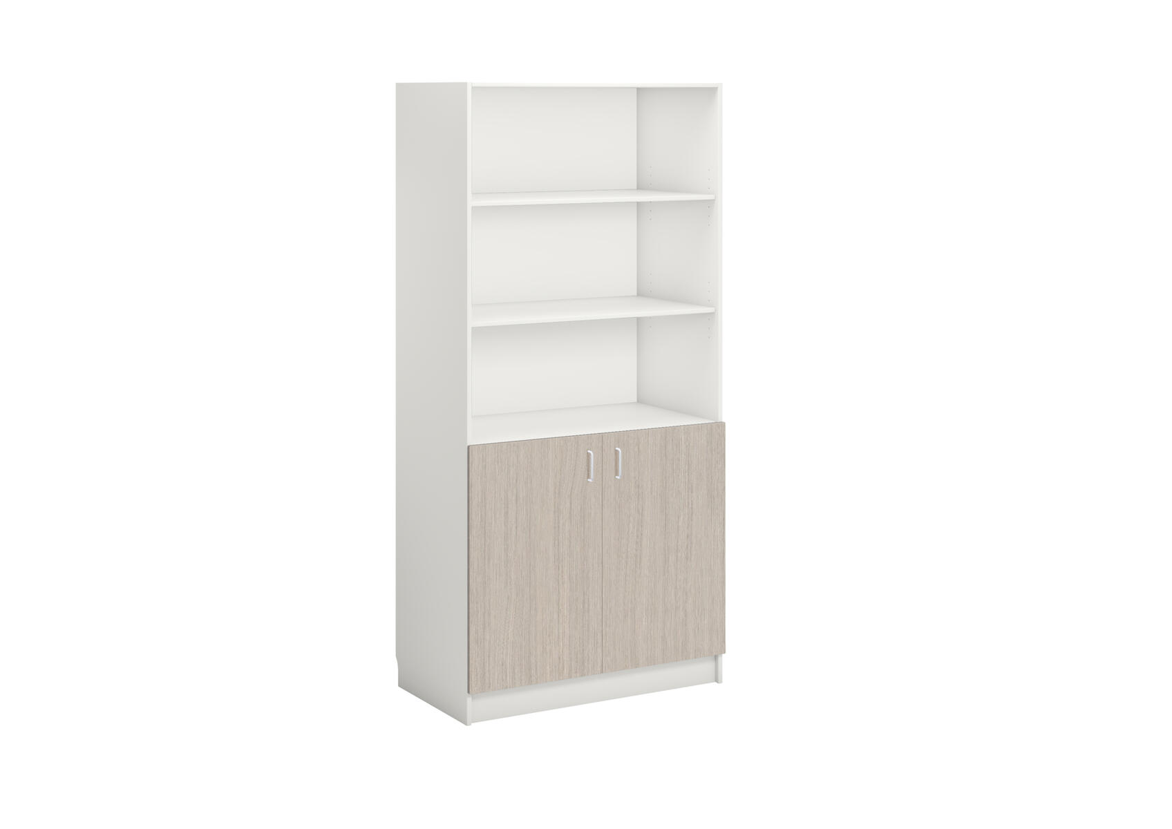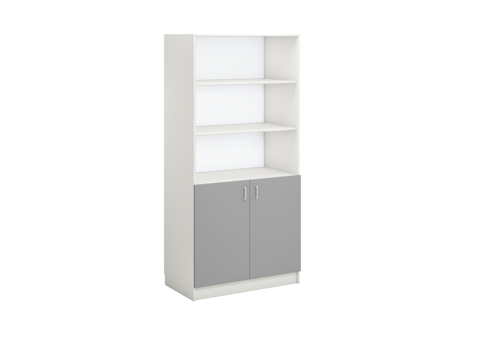 Materiaalikaappi laminaattirungolla. Ovet laminaattia tai korkeapainelaminaattia. Ovissa vanerikuvioinen reunanauha. 2 lasiovea turvalasilla, lukolla (sis. 2 avainta), ja 2 umpiovea, joissa vetimet. 170 astetta kääntyvät saranat. Kaksi avainta. Sisällä 5 hyllytasoa joista 3 siirettäviä.