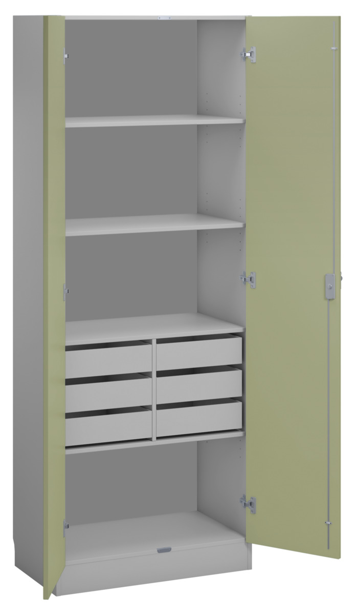 Materiaalikaappi laminaattirungolla. Ovet laminaattia tai korkeapainelaminaattia. Ovissa vanerikuvioinen reunanauha. Ovissa spanjoletti lukot sekä 170 astetta kääntyvät saranat. Kaksi avainta. Sisällä 3 hyllytasoa ja 12 laatikkoa.
