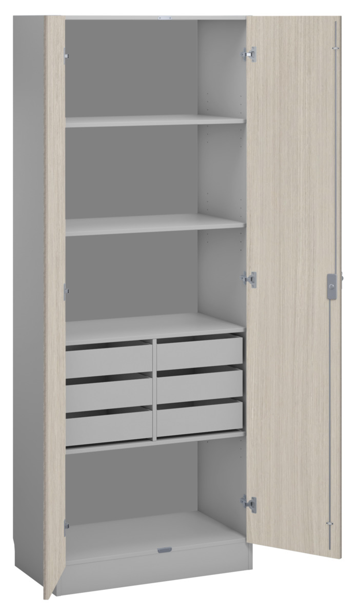 Materiaalikaappi laminaattirungolla. Ovet laminaattia tai korkeapainelaminaattia. Ovissa vanerikuvioinen reunanauha. 2 umpiovea lukolla. 170 astetta kääntyvät saranat. Kaksi avainta. Sisällä 3 hyllytasoa ja 12 vetolaatikkoa.