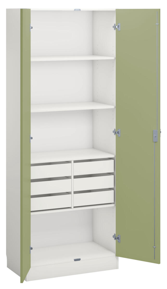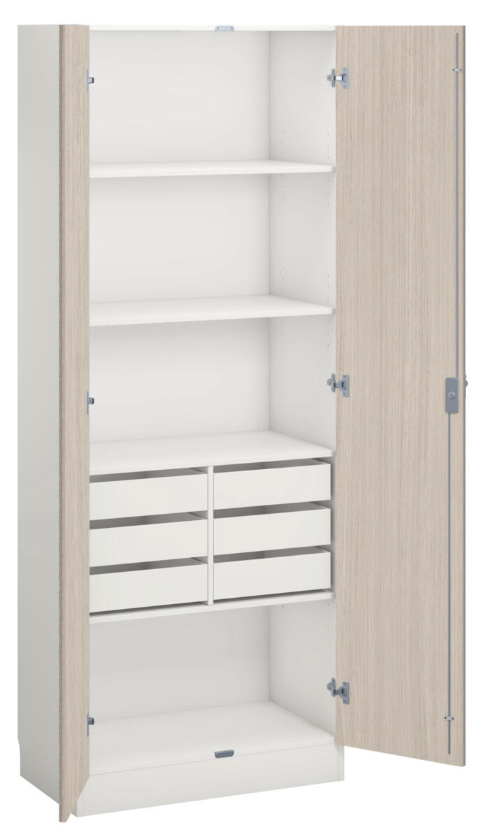 Materiaalikaappi laminaattirungolla. Ovet laminaattia tai korkeapainelaminaattia. Ovissa vanerikuvioinen reunanauha. 2 umpiovea lukolla. 170 astetta kääntyvät saranat. Kaksi avainta. Sisällä 3 hyllytasoa ja 12 vetolaatikkoa.