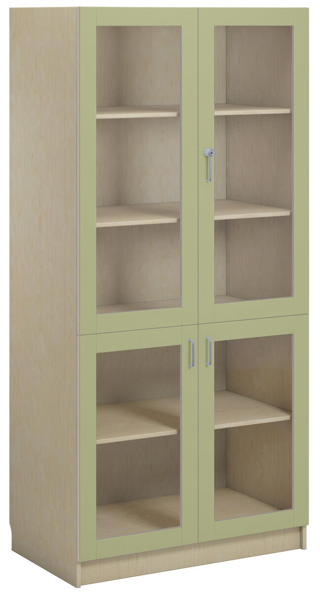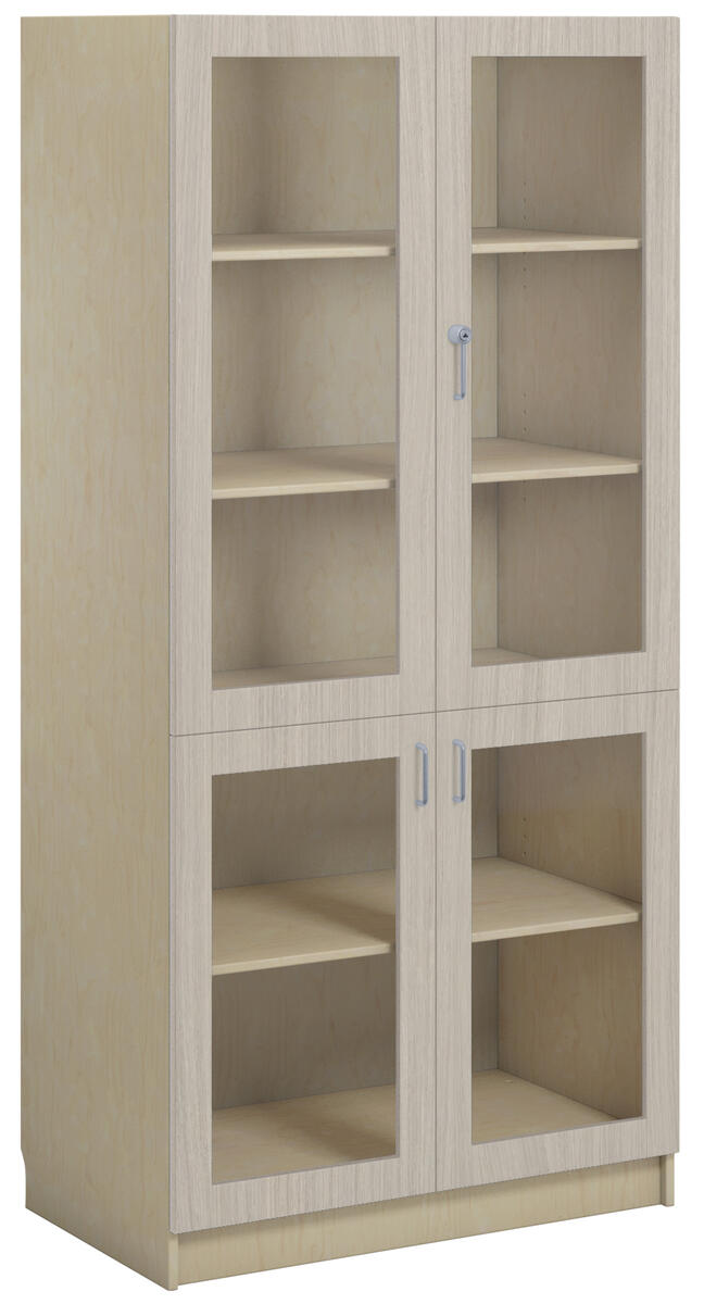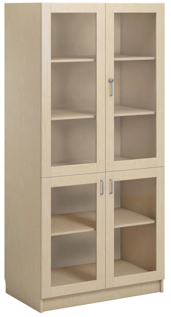 Materiaalikaappi laminaattirungolla. Ovet laminaattia tai korkeapainelaminaattia. Ovissa vanerikuvioinen reunanauha. 2 lasiovea turvalasilla, lukolla (sis. 2 avainta), ja 2 umpiovea, joissa vetimet. 170 astetta kääntyvät saranat. Kaksi avainta. Sisällä 5 hyllytasoa joista 3 siirettäviä.