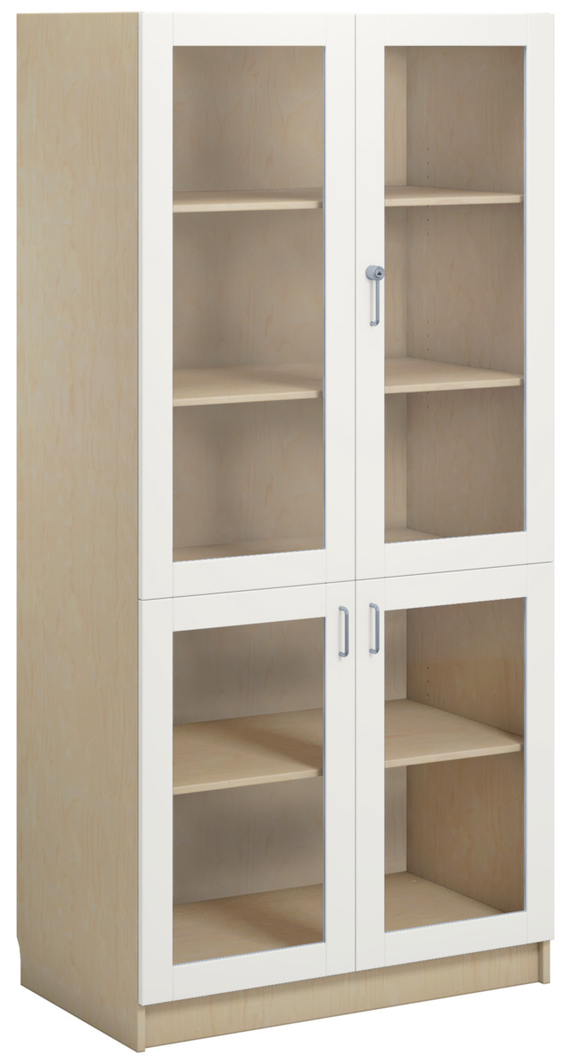 Materiaalikaappi laminaattirungolla. Ovet laminaattia tai korkeapainelaminaattia. Ovissa vanerikuvioinen reunanauha. 2 lasiovea turvalasilla, joissa spanjoletti lukot. 170 astetta kääntyvät saranat. Kaksi avainta. Sisällä 5 hyllytasoa joista 3 siirettäviä.